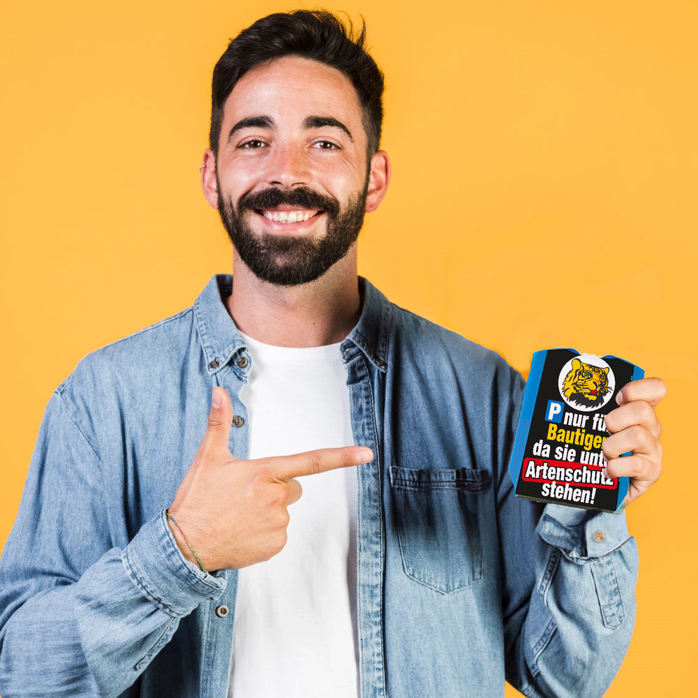 • Das perfekte Geschenk zum Thema für Pendler, die oftmals einen Parkplatz suchen. Eine coole Parkscheibe in schwarz mit Bautiger Motiv.