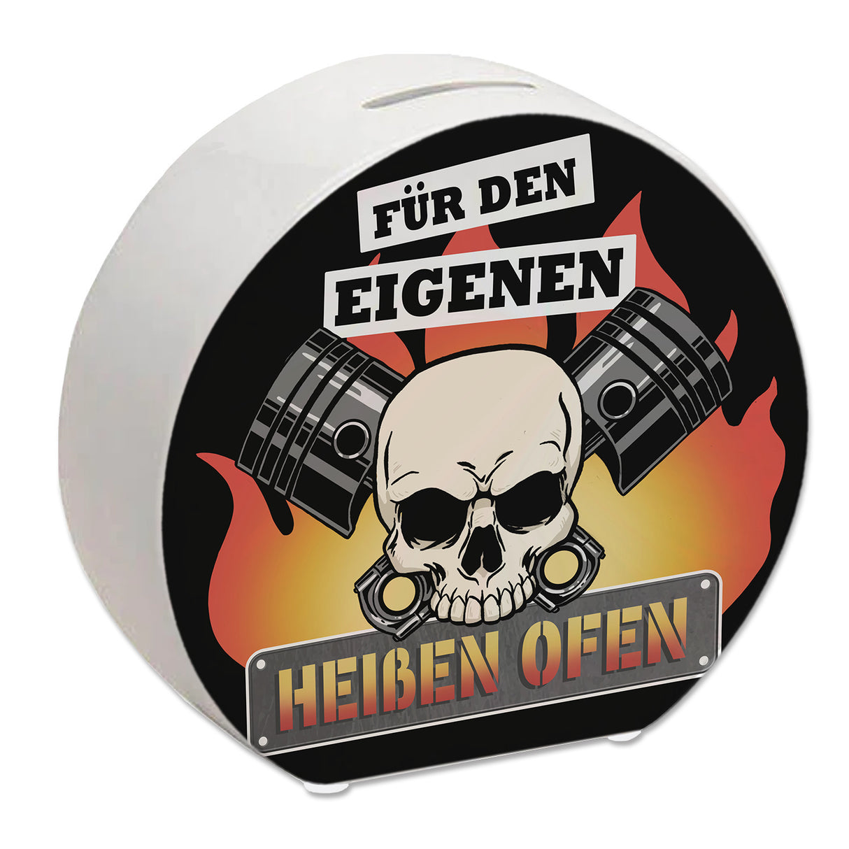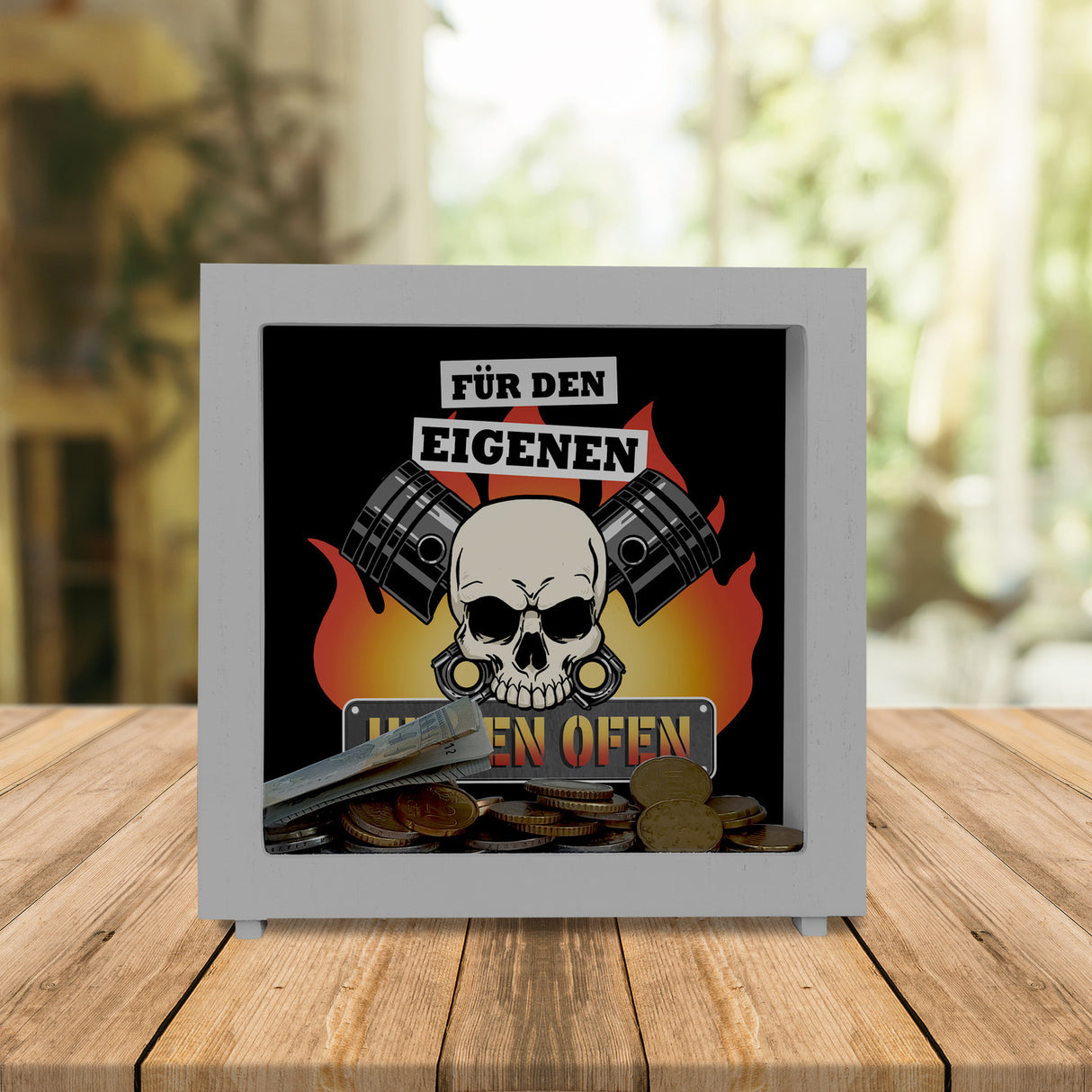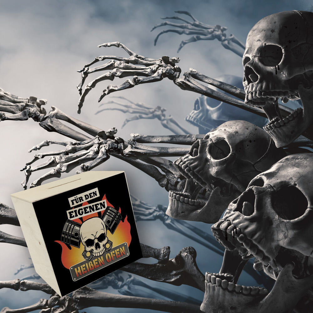 - 1x Für den eigenen heißen Ofen Spardose mit Totenkopf und Kolben in der gewählten Ausführung