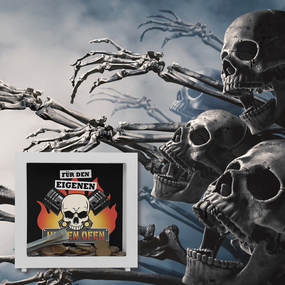 Für den eigenen heißen Ofen Spardose mit Totenkopf und Kolben
