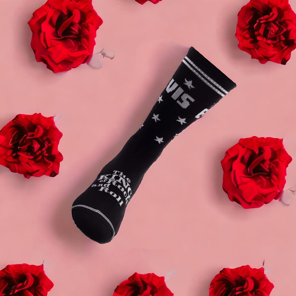 - Schlüpfe in die schicken schwarzen Socken, die mehr als nur deine Füße wärmen. Mit dem kultigen "ELVIS" in Weiß, umgeben von Sternen, wird jeder Schritt zur Bühnenshow. Die Krönung: "The King of Rock and Roll" thront oben, damit du in jedem Schuhwerk royale Ehre erweist.