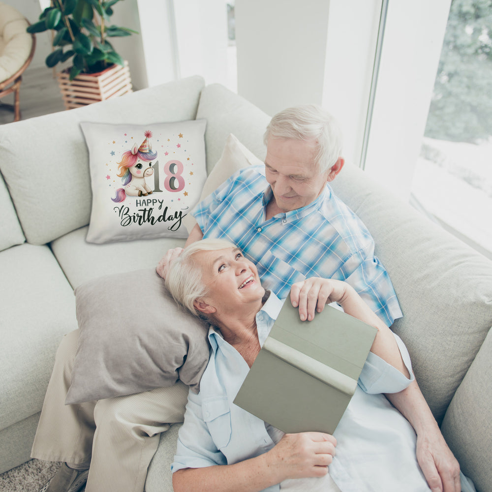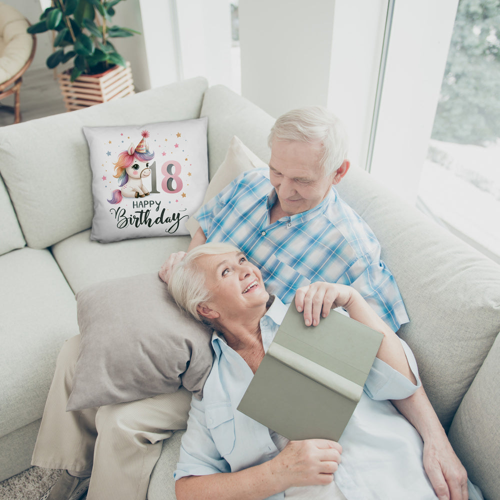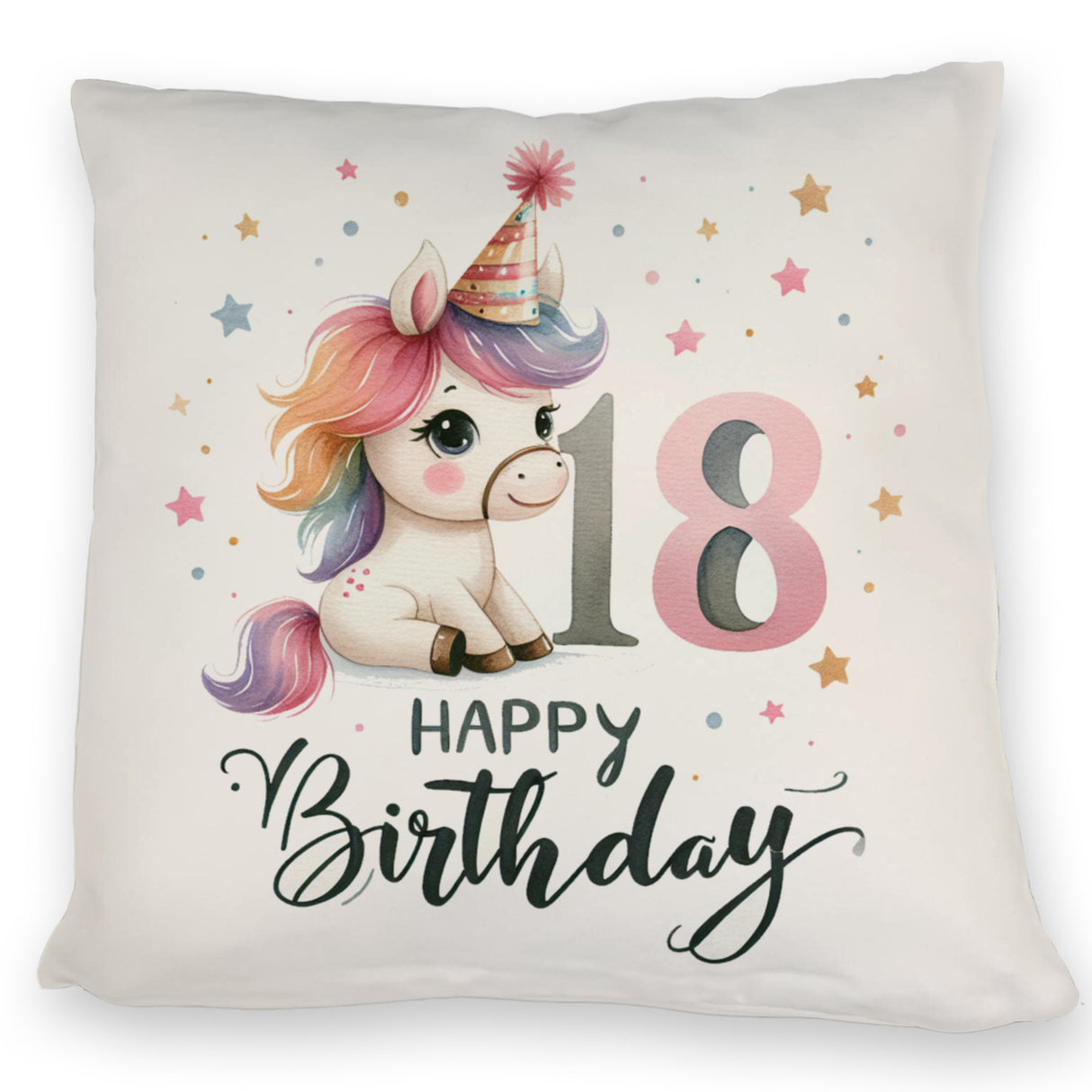 - Happy Birthday, süßer 18! Unser niedliches Kissen zeigt ein knuffiges Pony mit Partyhut und den Spruch „Happy Birthday 18.“ Perfekt für jede Geburtstagsfeier und ein toller Hingucker.