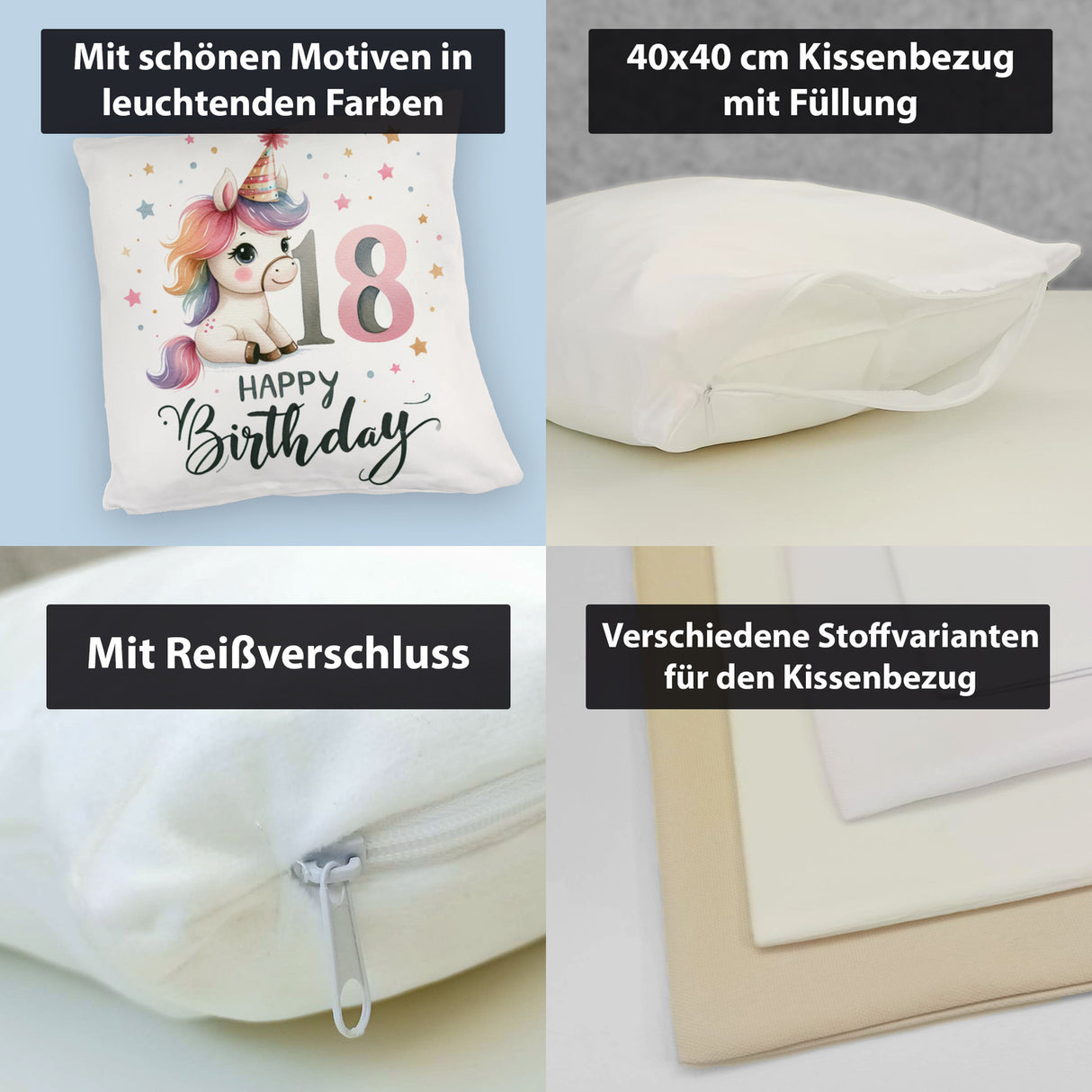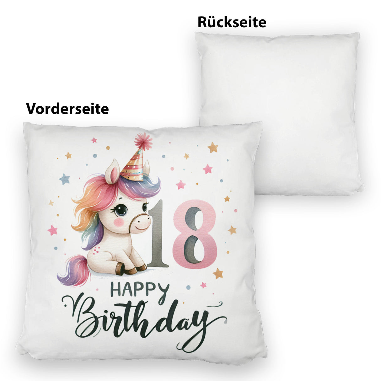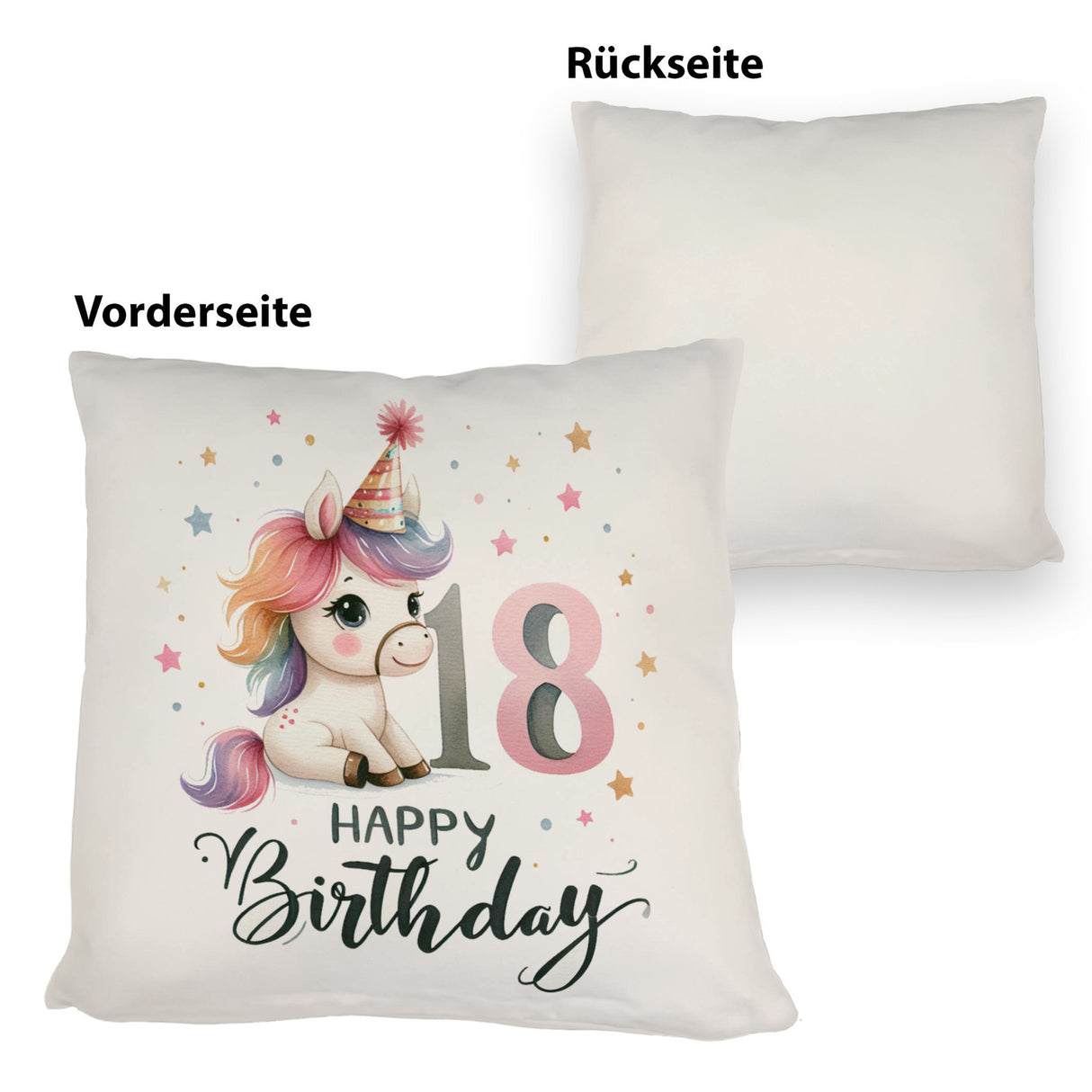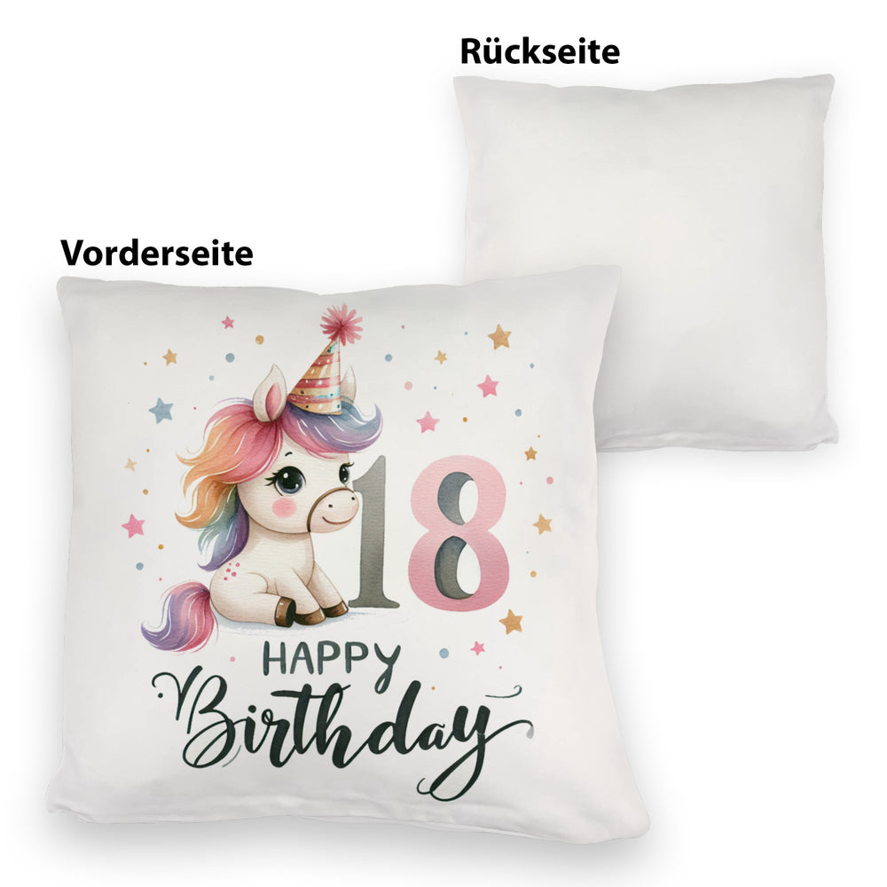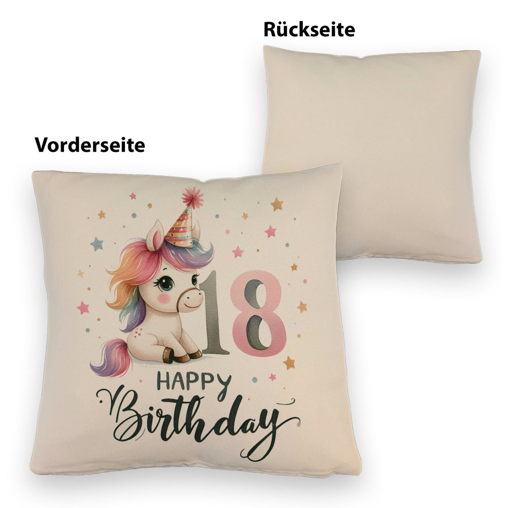 - 1x 18. Geburtstag mit niedlichem Pferd Kissen mit Spruch Happy Birthday 18 in der gewählten Ausführung