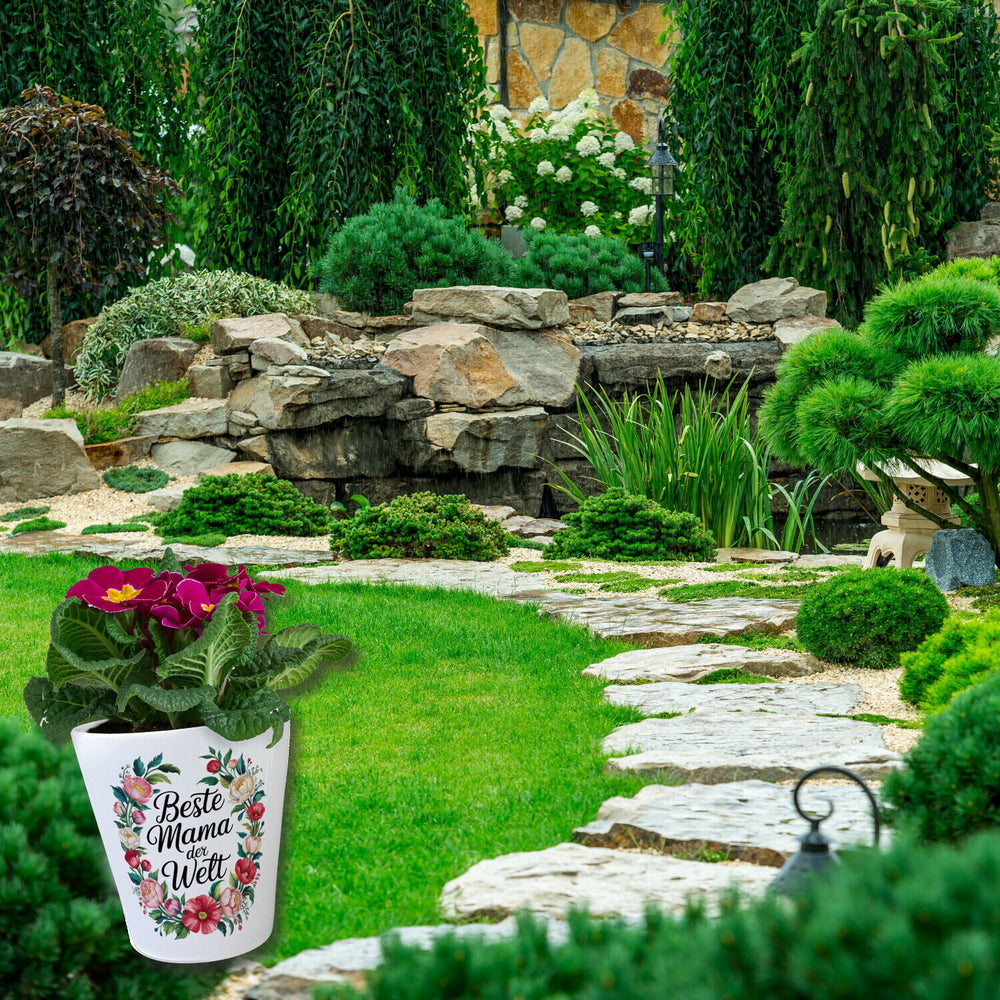 - Der "Beste Mama der Welt" Blumentopf ist mit einem zauberhaften Blumenkranz-Motiv geschmückt! Inmitten einer symmetrischen Anordnung von Rosé-, Rot- und Weißblüten winden sich grüne Blätter um den liebevollen Spruch "BESTE MAMA DER WELT". Ein echter Hingucker für jeden Garten- und Deko-Fan!