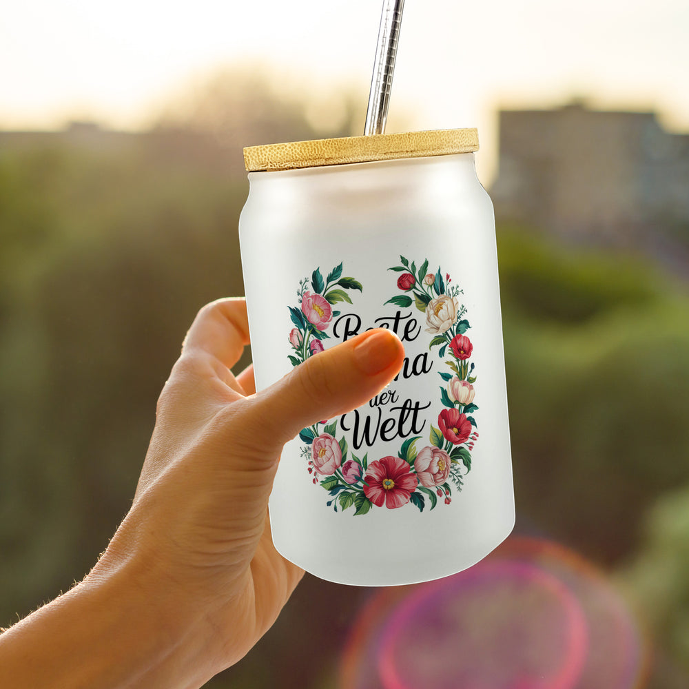 Beste Mama der Welt Trinkglas mit Bambusdeckel Blumenkranz