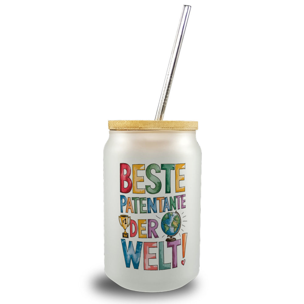 Beste Patentante der Welt Trinkglas mit Bambusdeckel goldener Pokal Globus