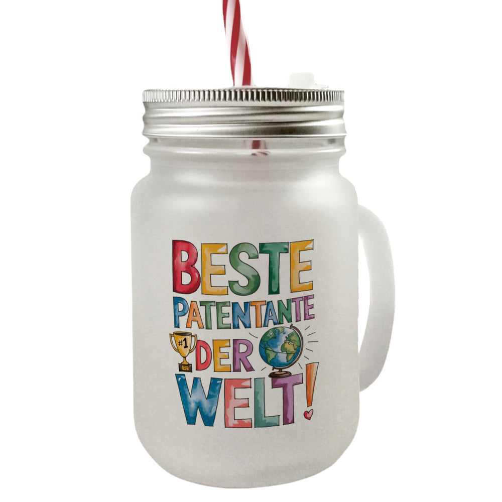- Dieses Trinkglas ist ein farbenfrohes Kunstwerk, das die Worte "Beste Patentante der Welt!" in leuchtenden Pastellfarben präsentiert. Ein goldener Pokal und ein Globus mit Strahlen verleihen dem Design eine festliche Note, um die besondere Bedeutung der Patentante humorvoll zu feiern. Ein echter Hingucker!