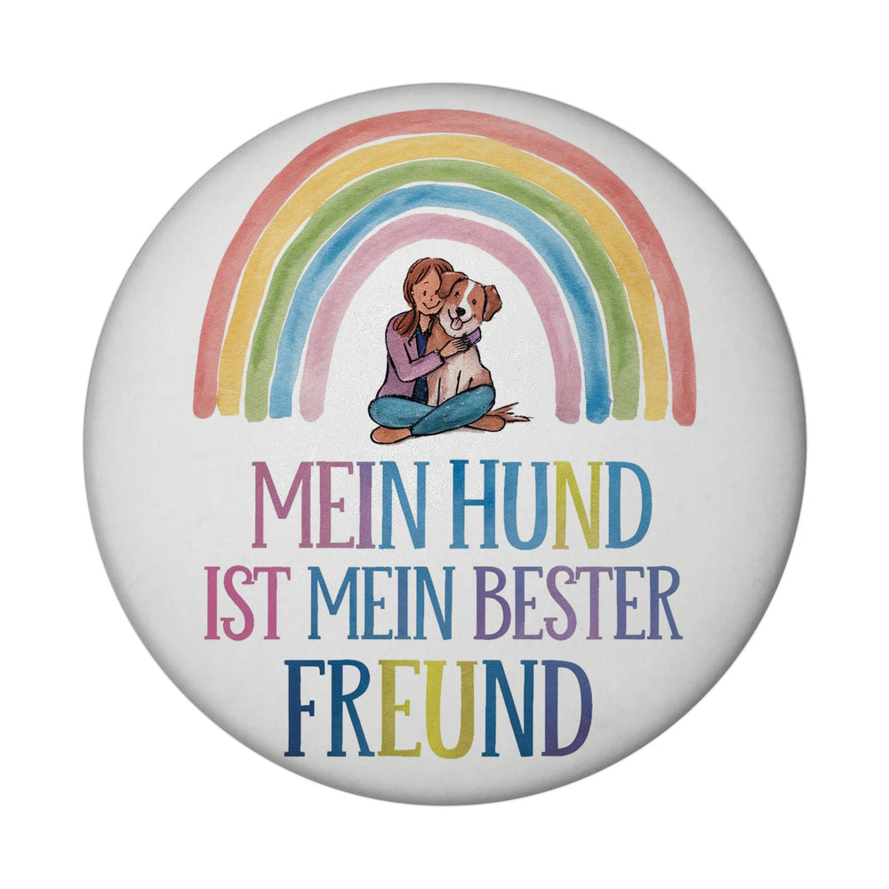 - Der runde Magnet zeigt eine farbenfrohe Szene: Eine Frau umarmt ihren Hund unter einem lebendigen Regenbogen. In Aquarell-Pastelloptik prangt der lustige Spruch "MEIN HUND IST MEIN BESTER FREUND". Diese fröhliche Komposition strahlt Lebensfreude und Freundschaft aus und wird von einem weißen Hintergrund unterstrichen.