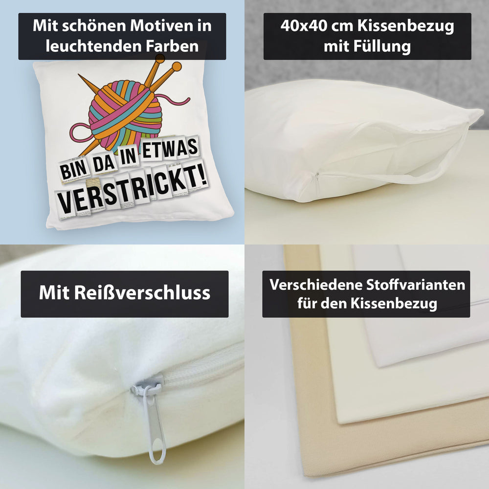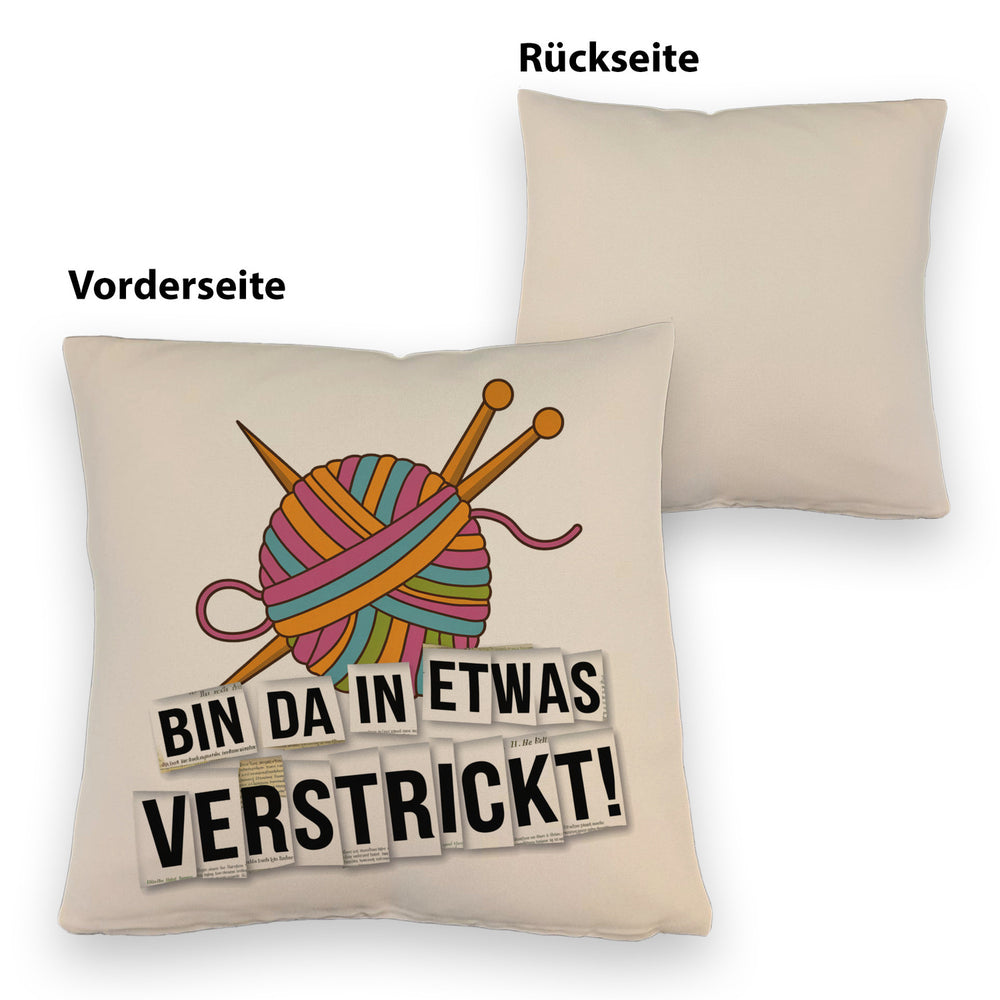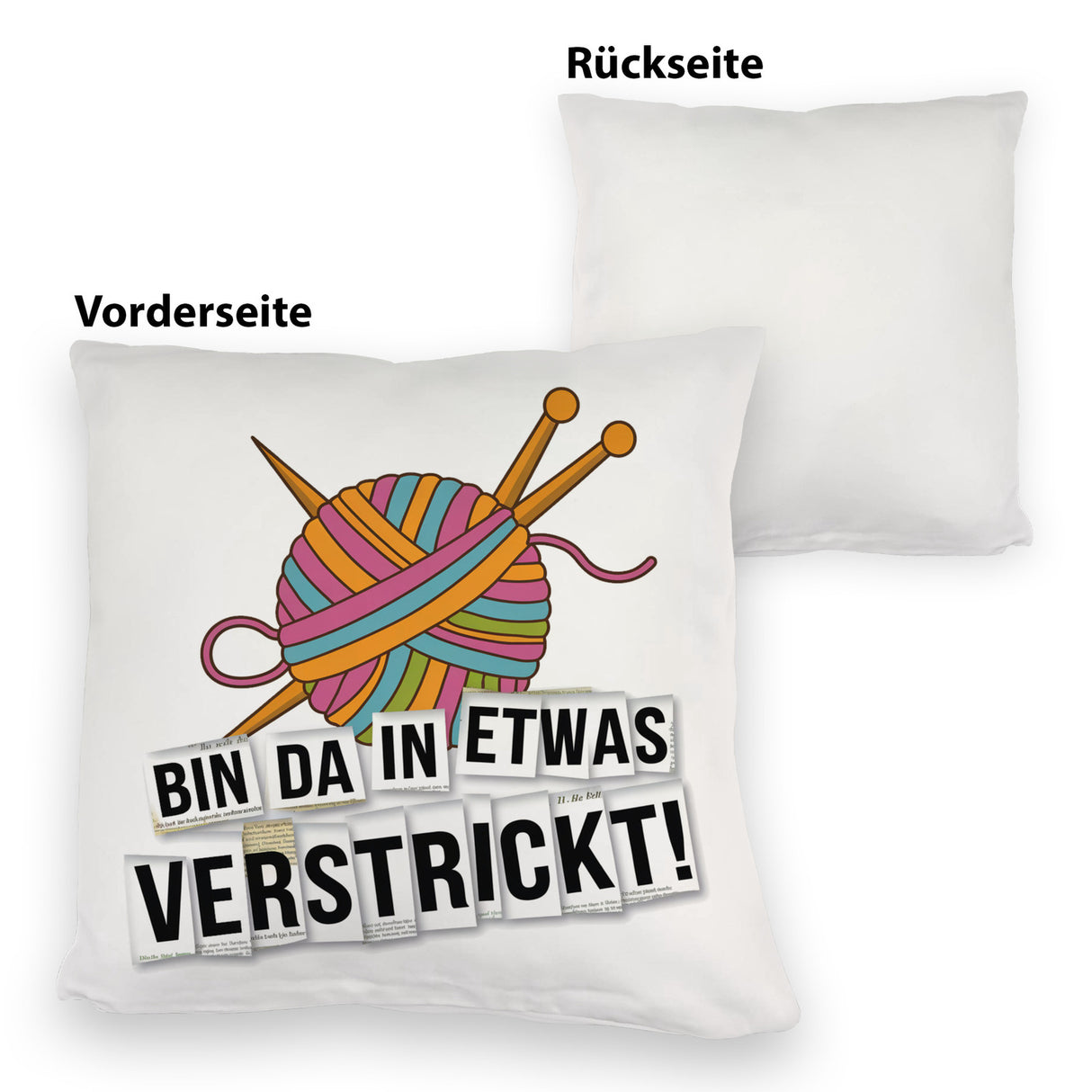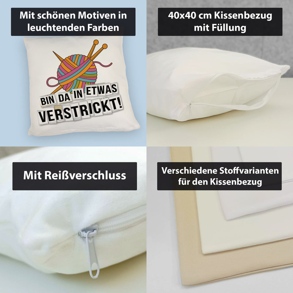- 1x Bin da in etwas verstrickt Kissen mit Wolle und Stricknadeln in der gewählten Ausführung