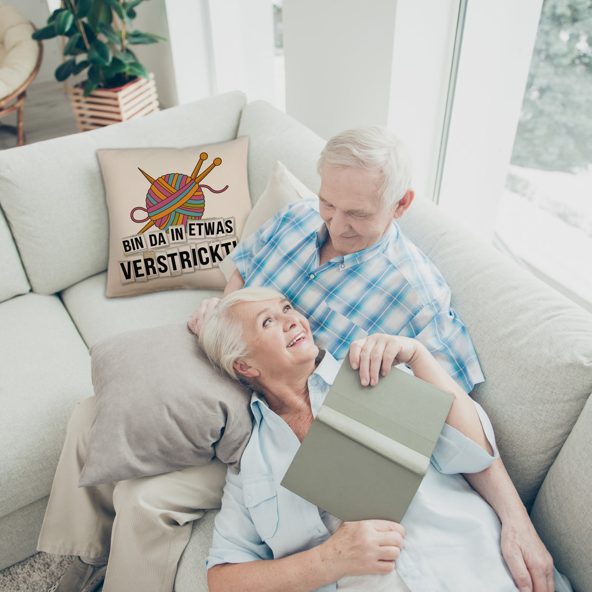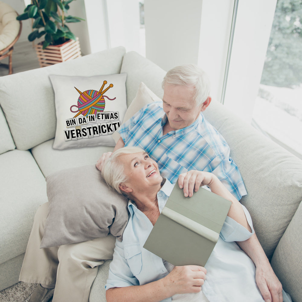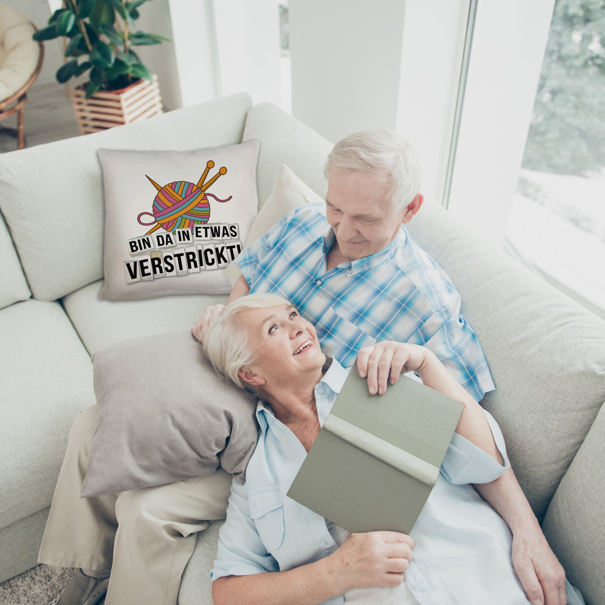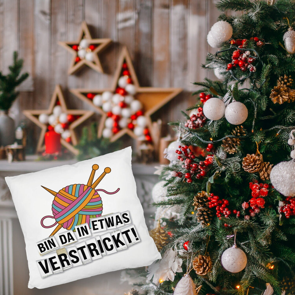 - 1x Bin da in etwas verstrickt Kissen mit Wolle und Stricknadeln in der gewählten Ausführung