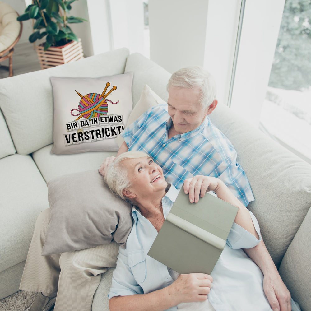 Bin da in etwas verstrickt Kissen mit Wolle und Stricknadeln