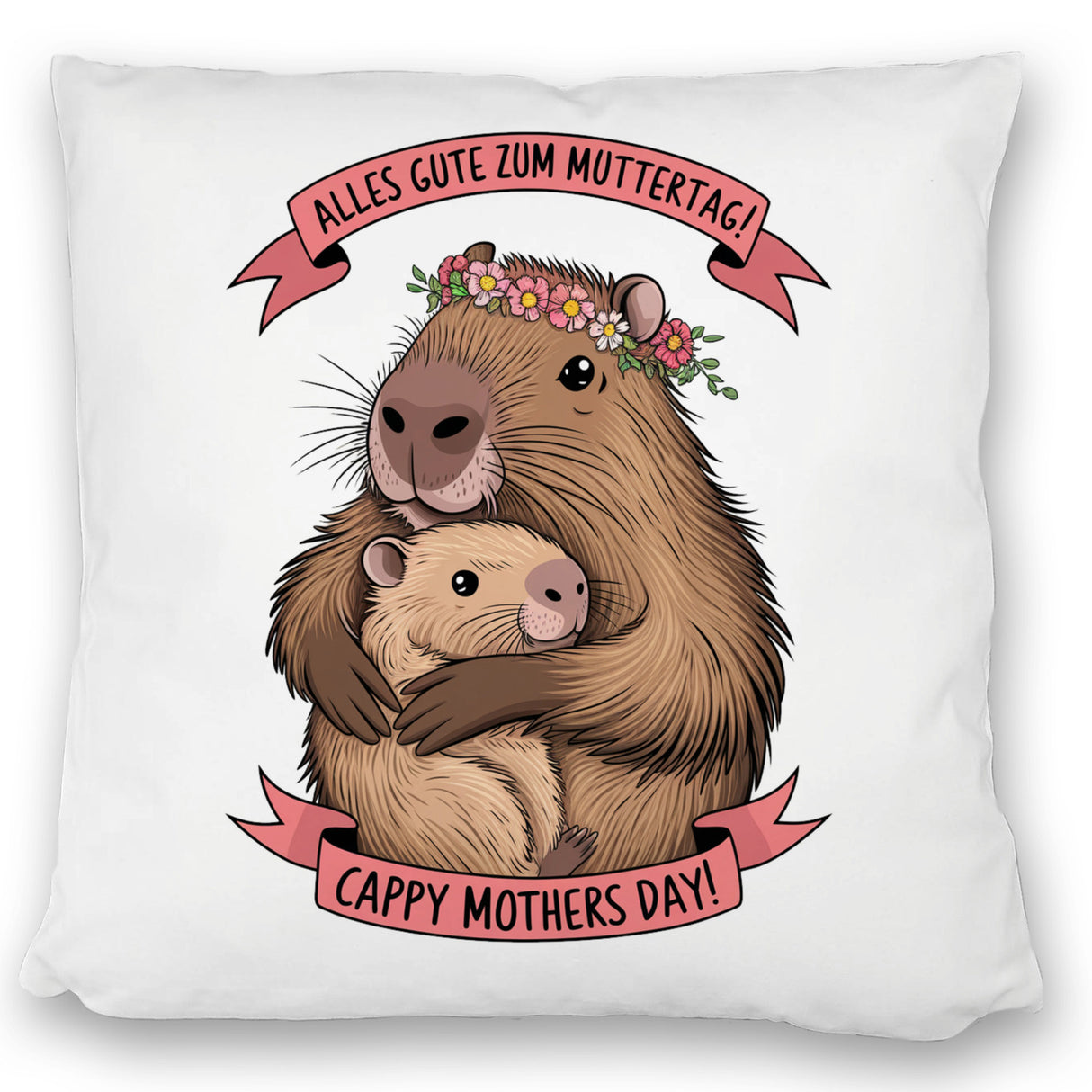 - Entdecke unser bezauberndes Capybara-Kissen! Es zeigt eine süße Illustration einer Capybara-Mama mit Blumenkranz, die ihr Baby liebevoll umarmt. Über den beiden steht "Alles Gute zum Muttertag!" auf einem charmanten Banner. Das weiße Kissen ist ein echter Hingucker und ein Muss für Fans dieser freundlichen Tiere.