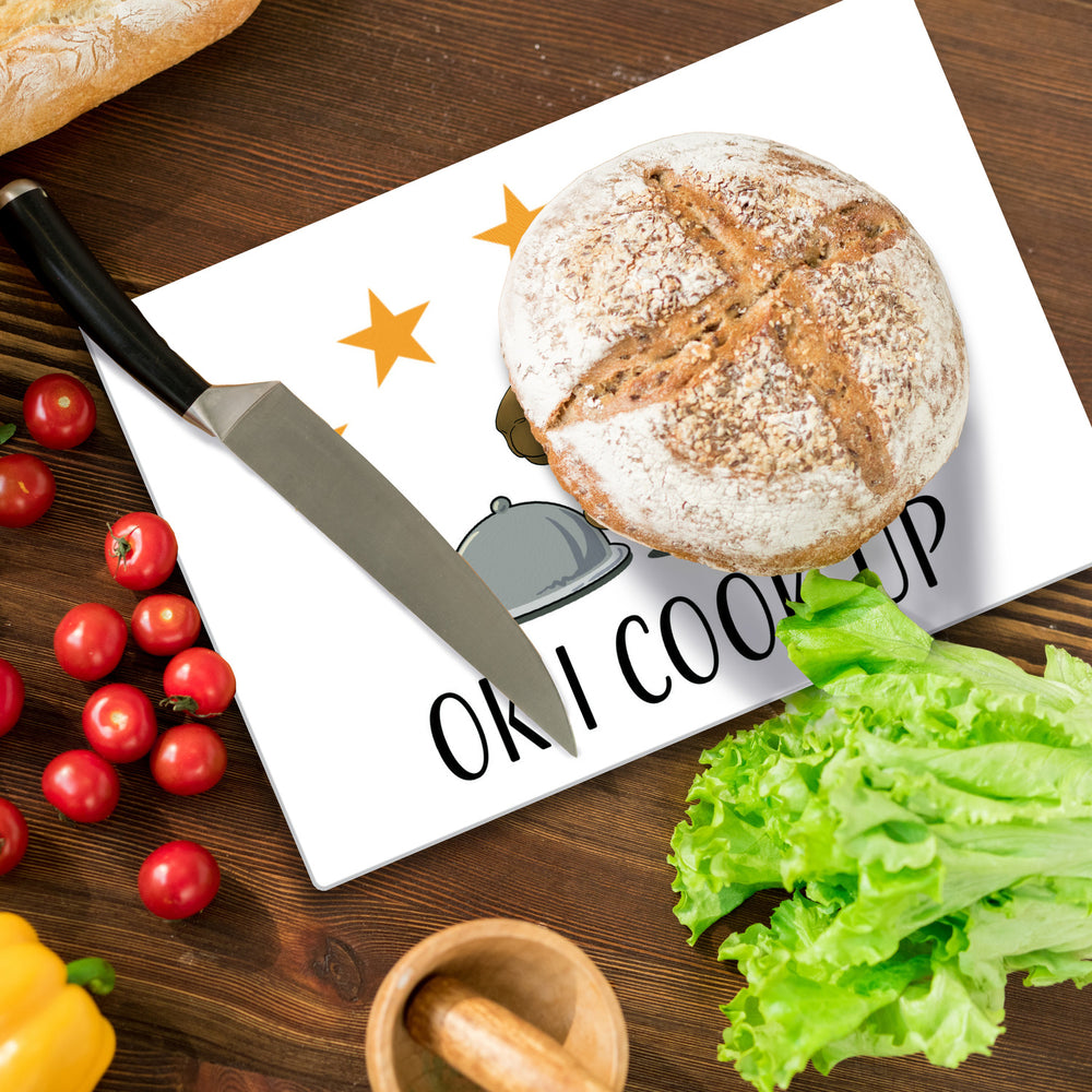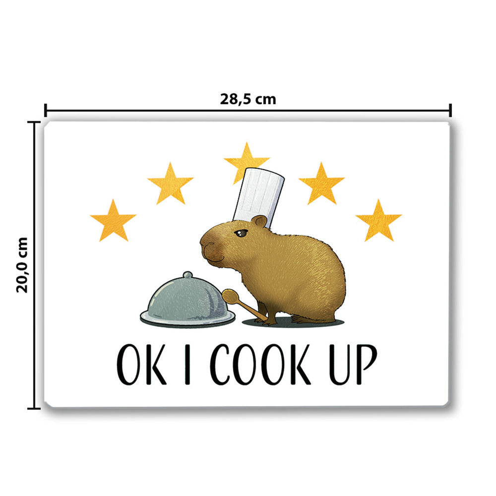• 1x Capybara-Koch Schneidebrett aus Glas mit Spruch Ok I cook up in der gewählten Größe