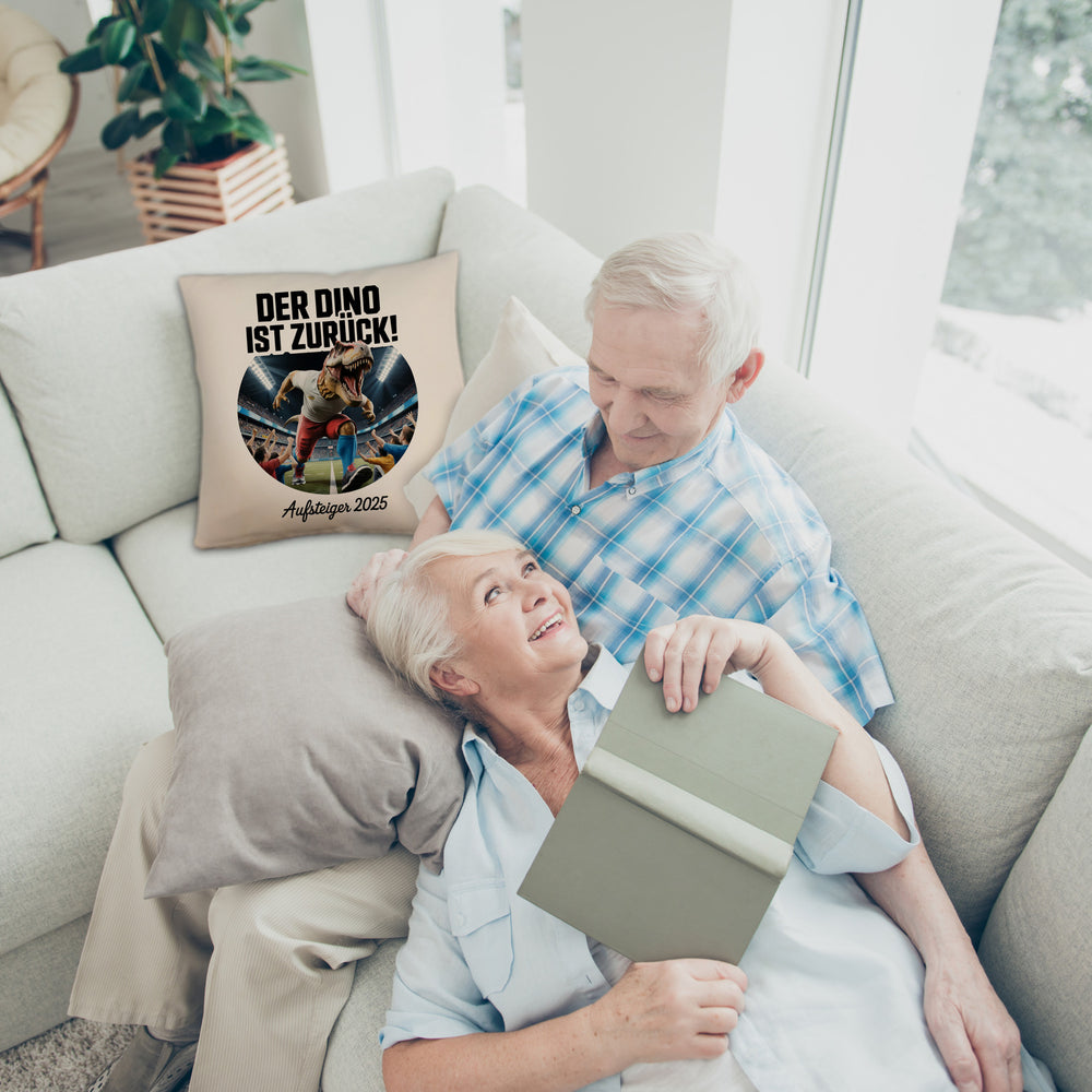 - Dieses Sofakissen ist ein wahres Meisterwerk! Es zeigt einen imposanten T-Rex, der mit lautem Gebrüll in einem vollen Fußballstadion auftaucht. Gekleidet in ein schickes weißes Hemd, knallrote Sporthosen und blaue Socken, verbreitet der Dino Stadionfieber. Der Schriftzug "DER DINO IST ZURÜCK! Aufsteiger 2025" rundet das Motiv perfekt ab.