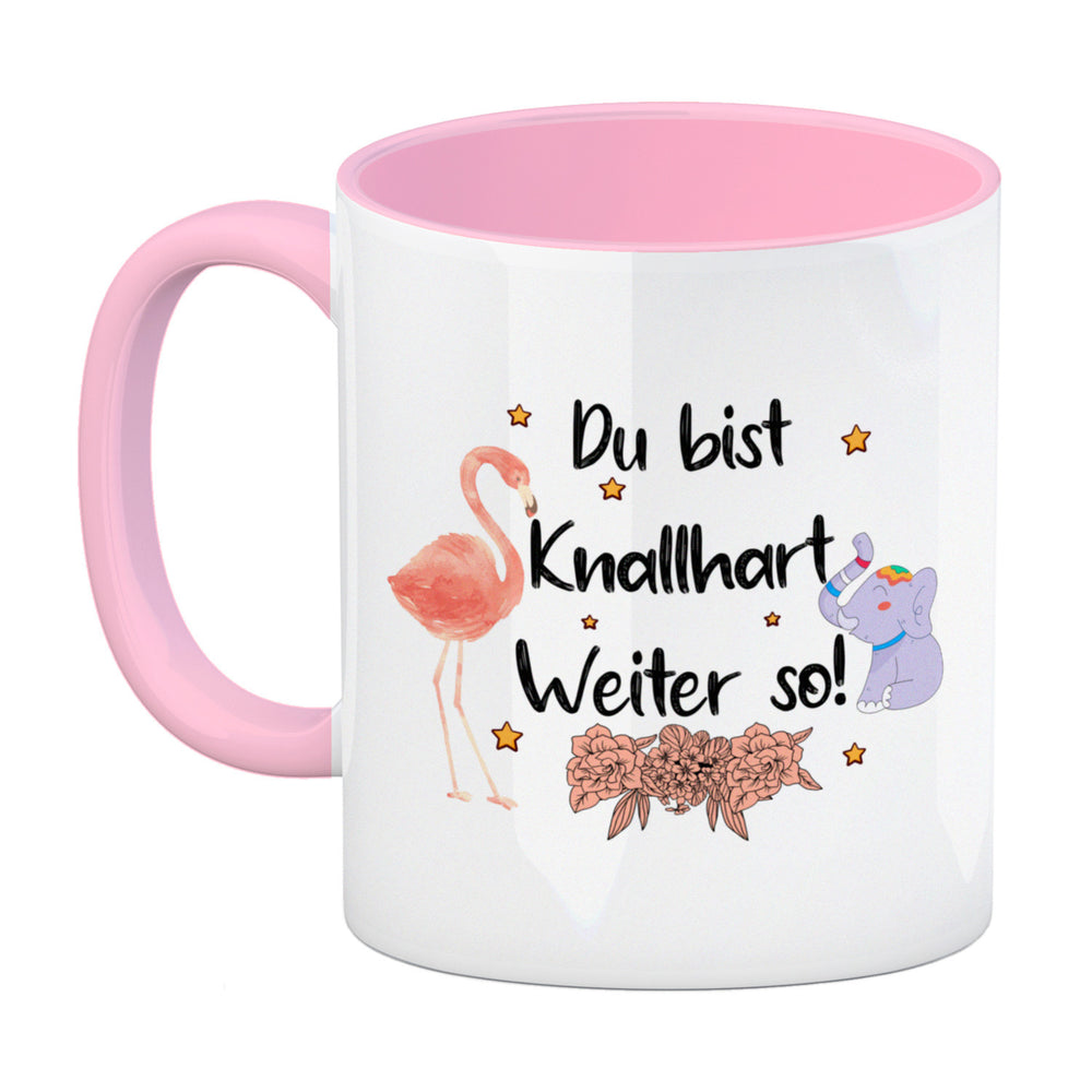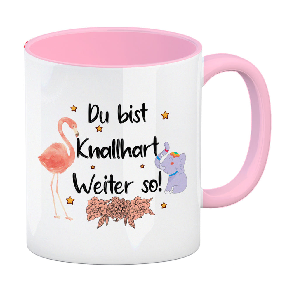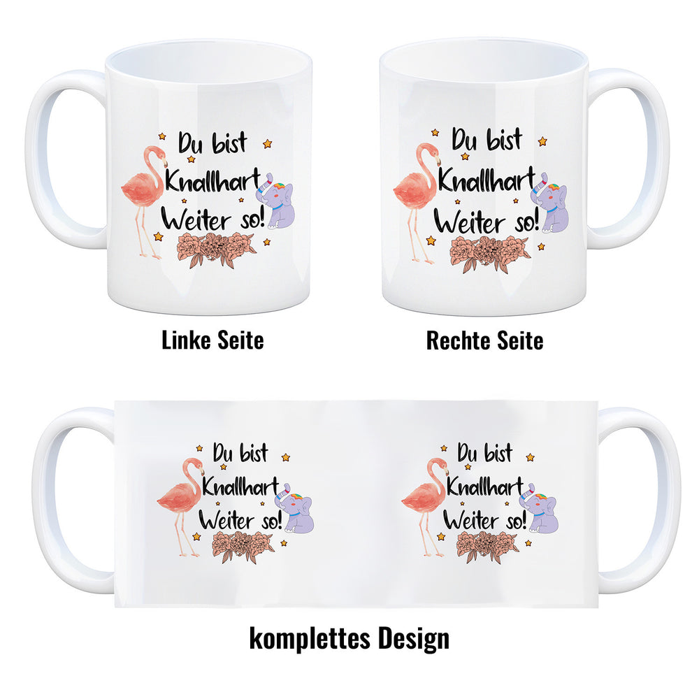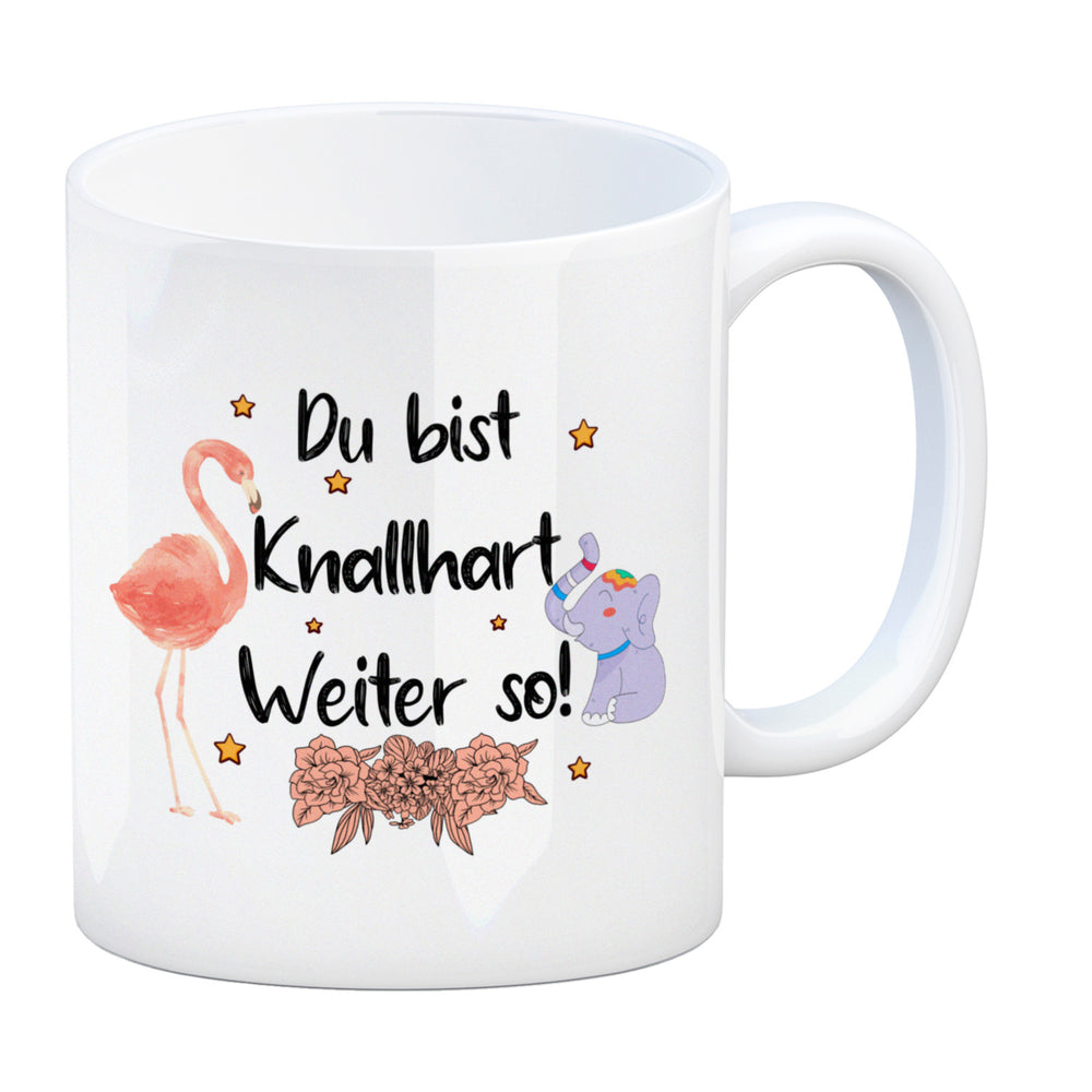 - Der Kaffeebecher mit dem Motiv Du bist knallhart. Weiter so! ist eine tolle Geschenkidee für Frauen zum Geburtstag oder anderen Anlässen. Mit seinen bunten Verzierungen und Spruch motiviert er die Trägerin jeden Tag, um weiterhin ihr Bestes zu geben! Der Becher kann nicht nur als Kaffeetasse, aber auch als Tasse für Tee, Milch oder andere Getränke genutzt werden.
