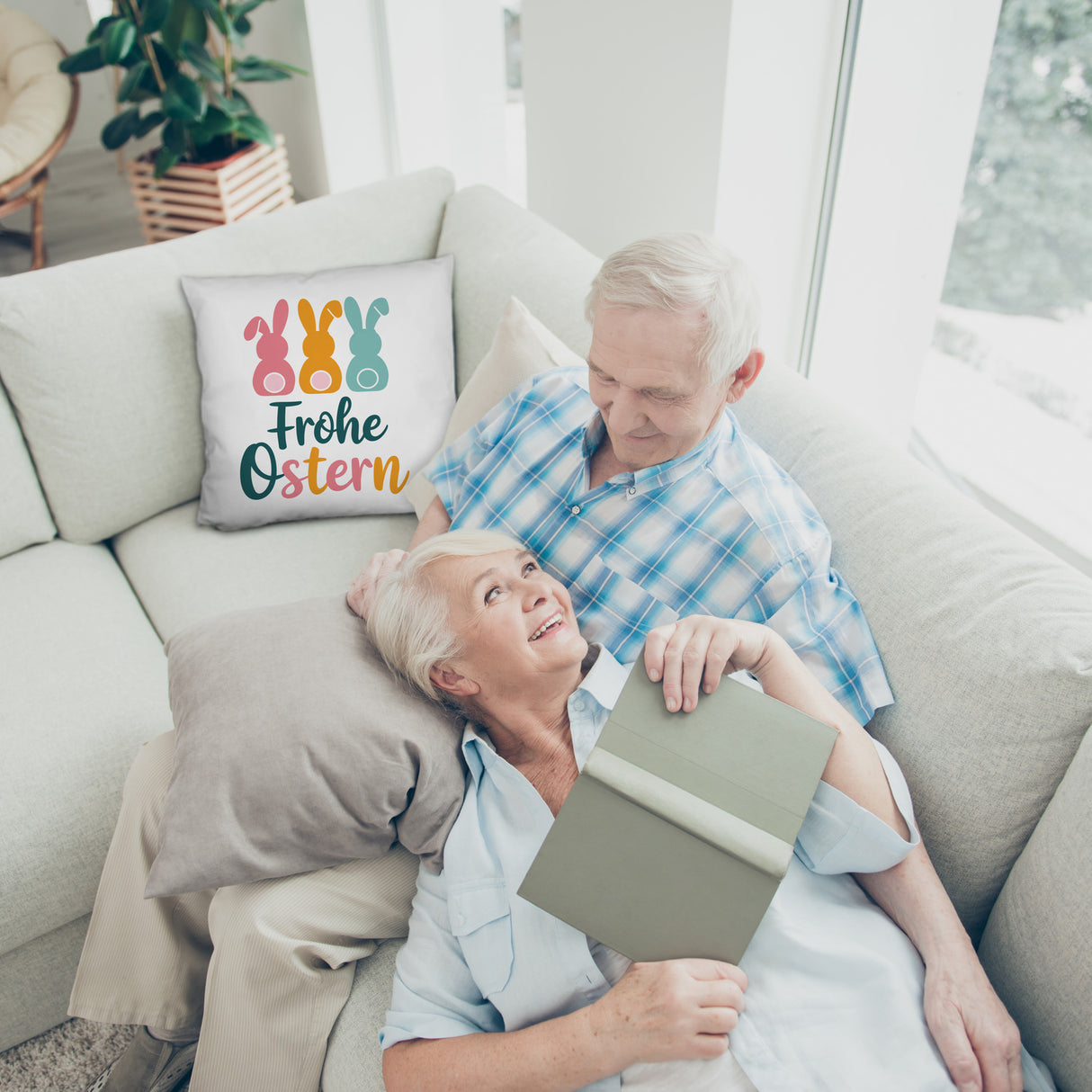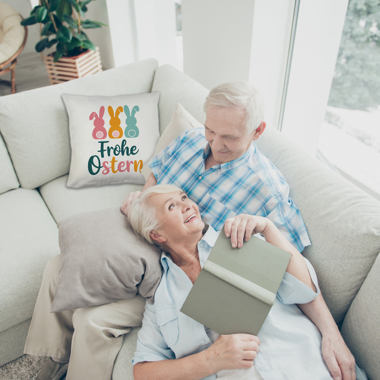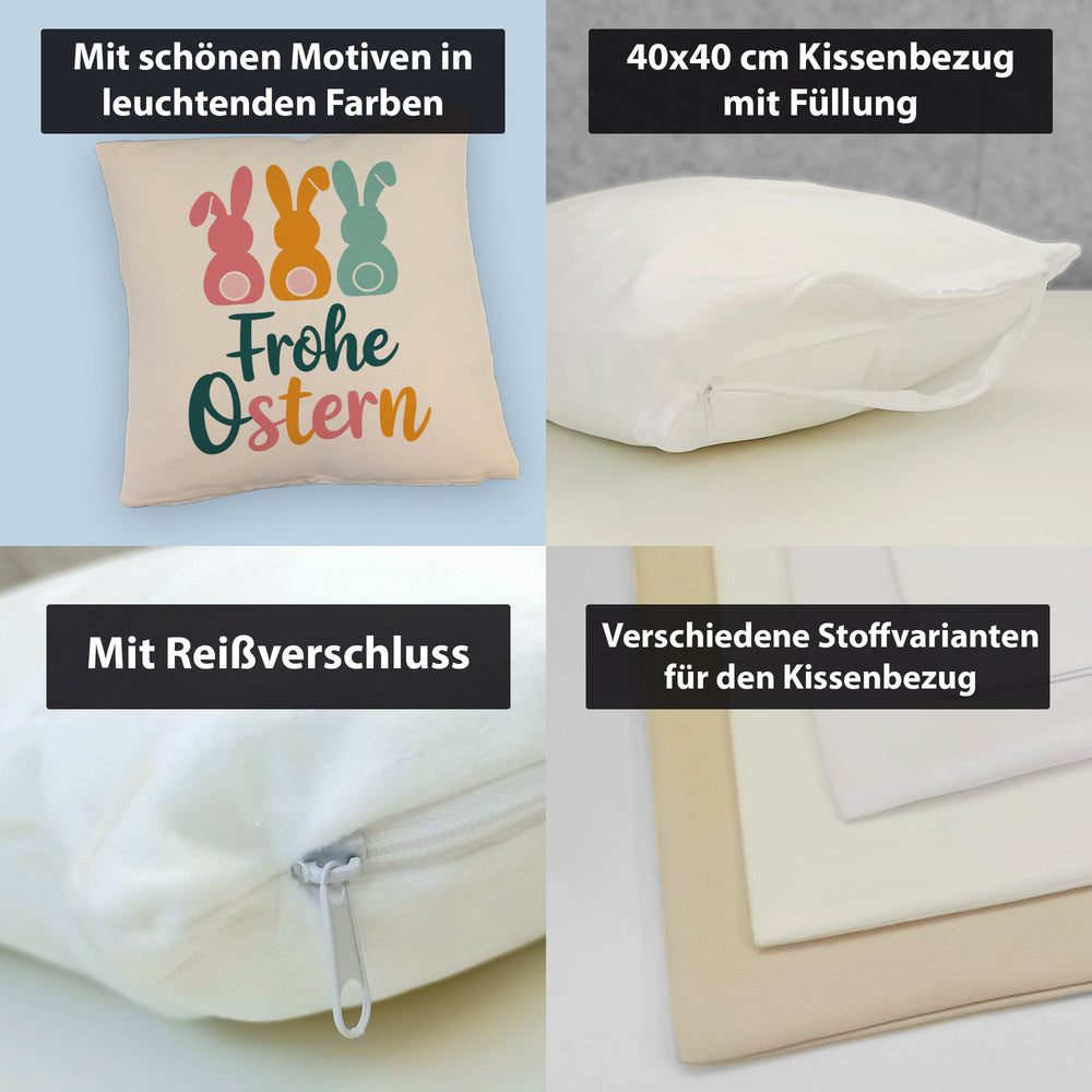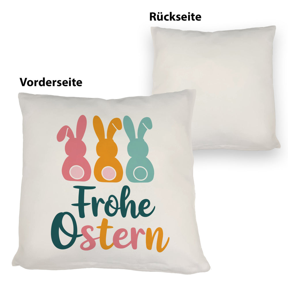 - Dieses fröhliche Osterkissen zeigt drei süße Hasen in Pink, Orange und Türkis, die ihre flauschigen Schwänzchen zeigen. Die verspielte Schrift "Frohe Ostern" rundet das bunte Design ab. Perfekt für eine lebhafte Osterstimmung auf weißem Hintergrund!