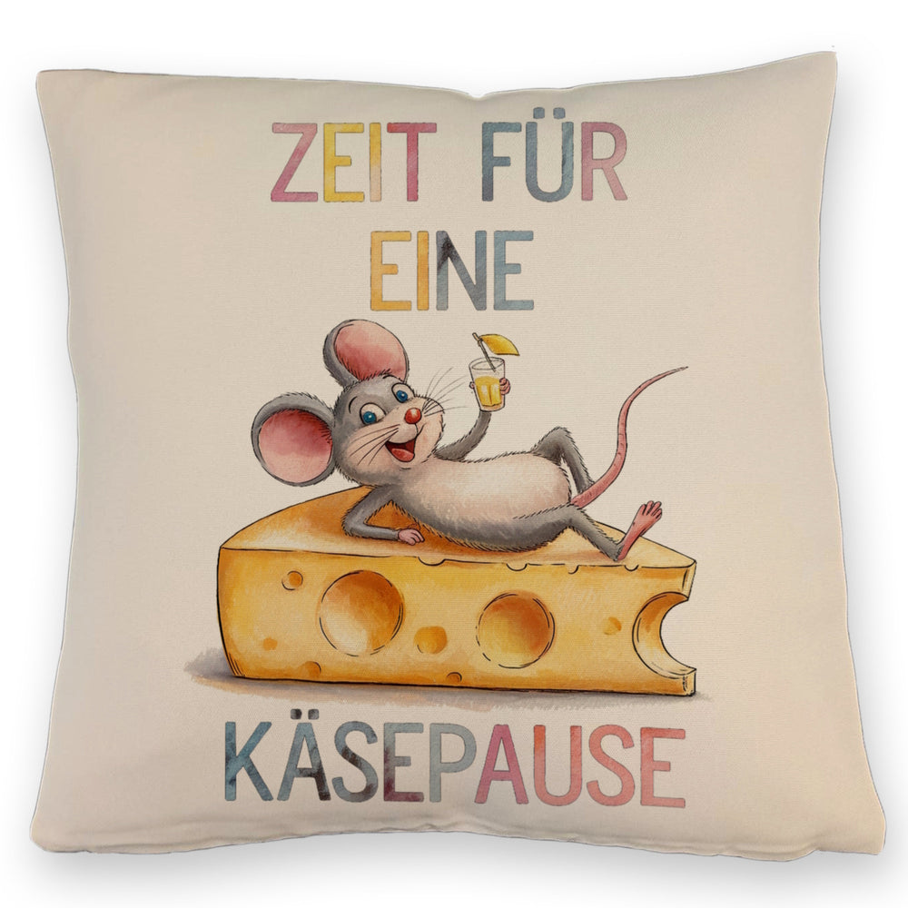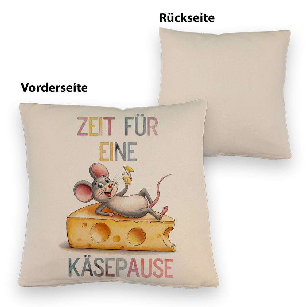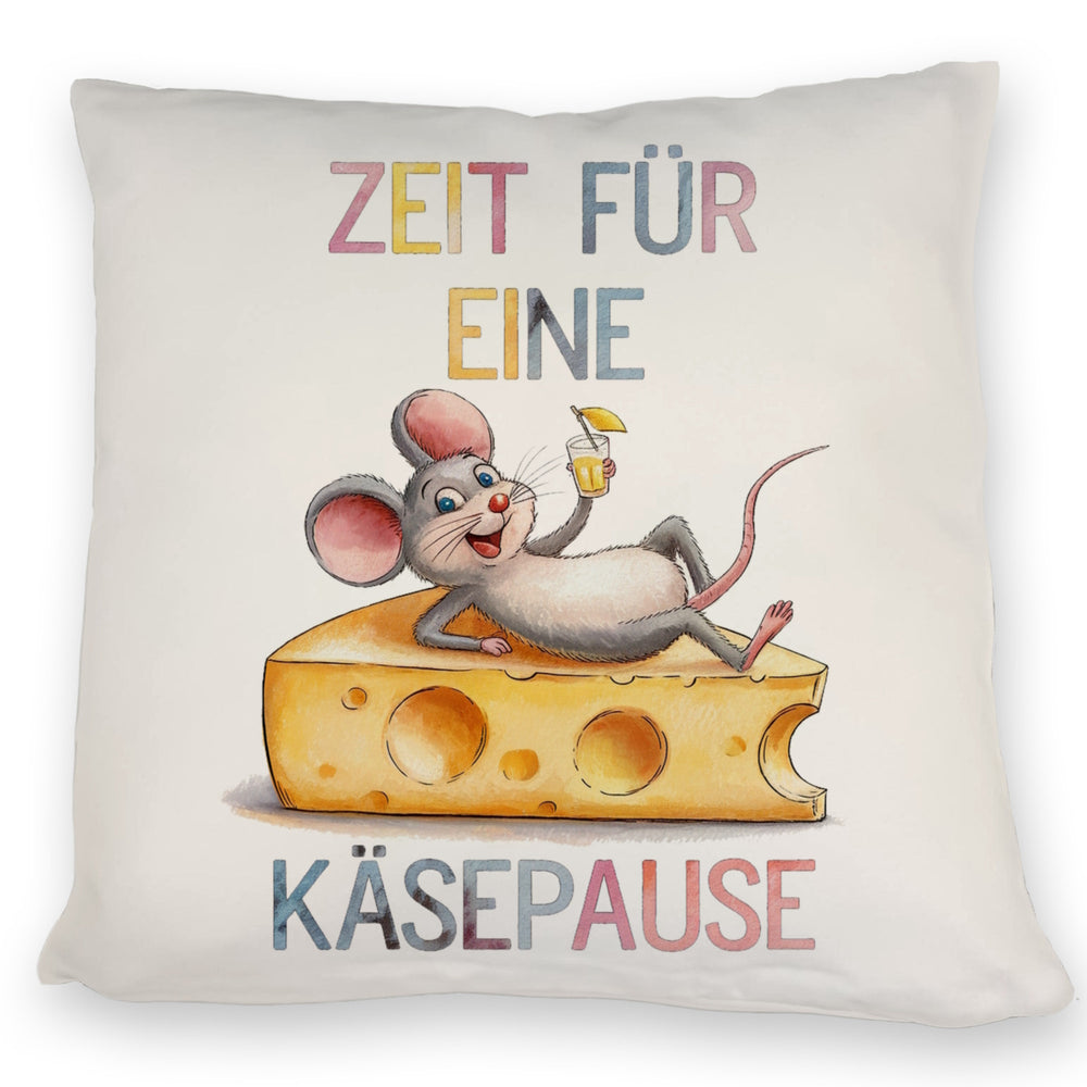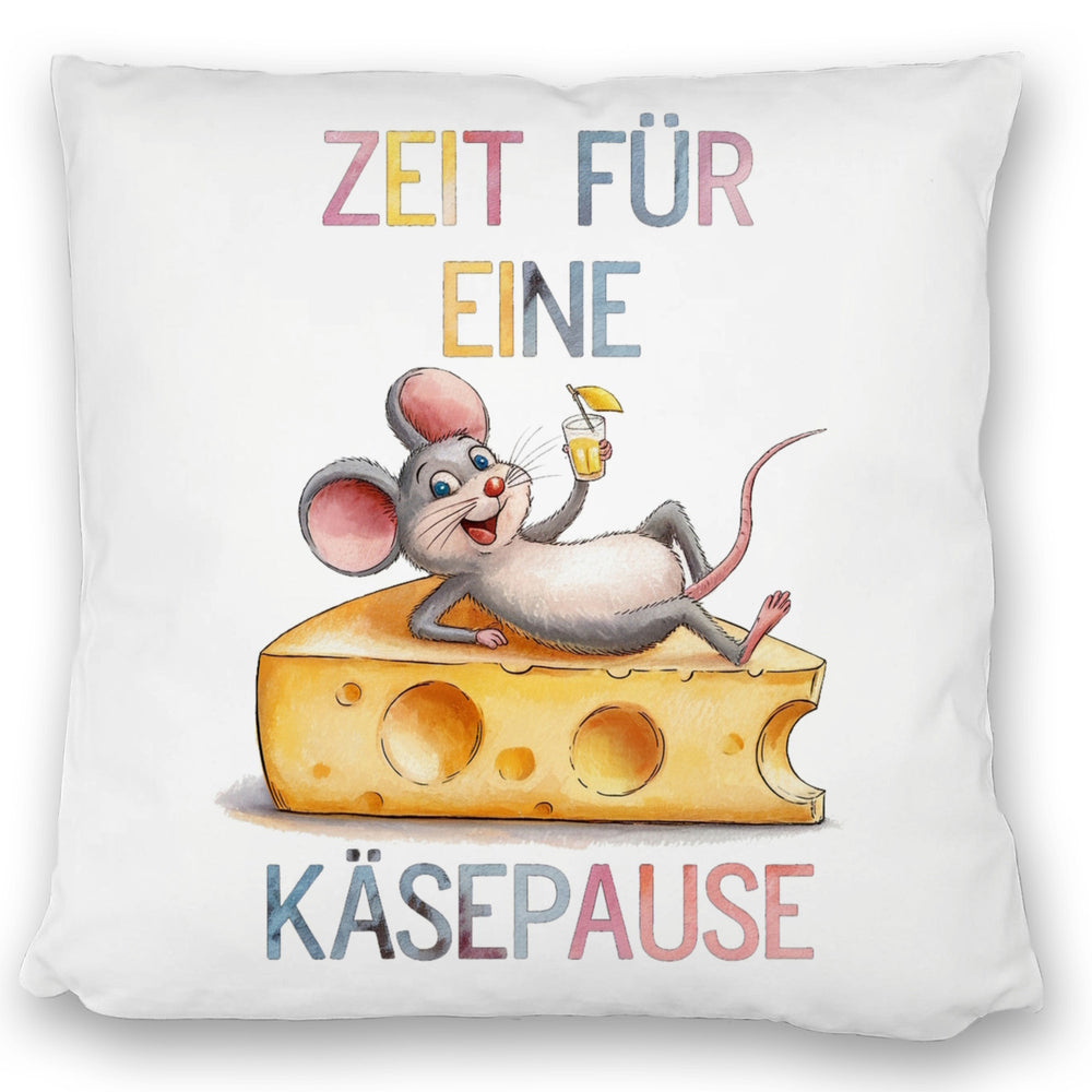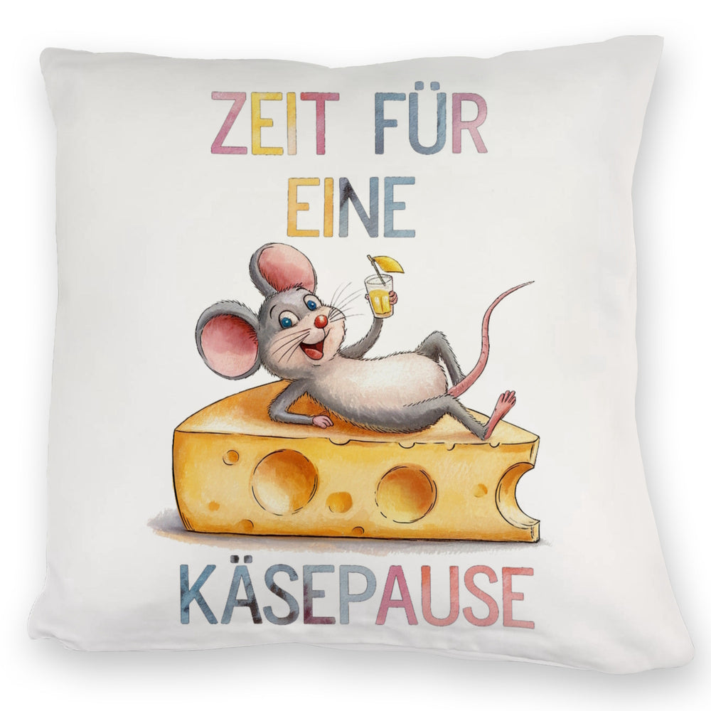 - Das fröhliche Maus auf Käse Kissen bringt Freude und Farbe ins Wohnzimmer! Auf einem strahlend weißen Hintergrund entspannt sich eine fröhliche Maus auf einem großen Käseblock, ein Glas Limonade in der Hand. Der verspielte Ausdruck und der bunte Schriftzug "ZEIT FÜR EINE KÄSEPAUSE" machen es zu einem unwiderstehlichen Hingucker.