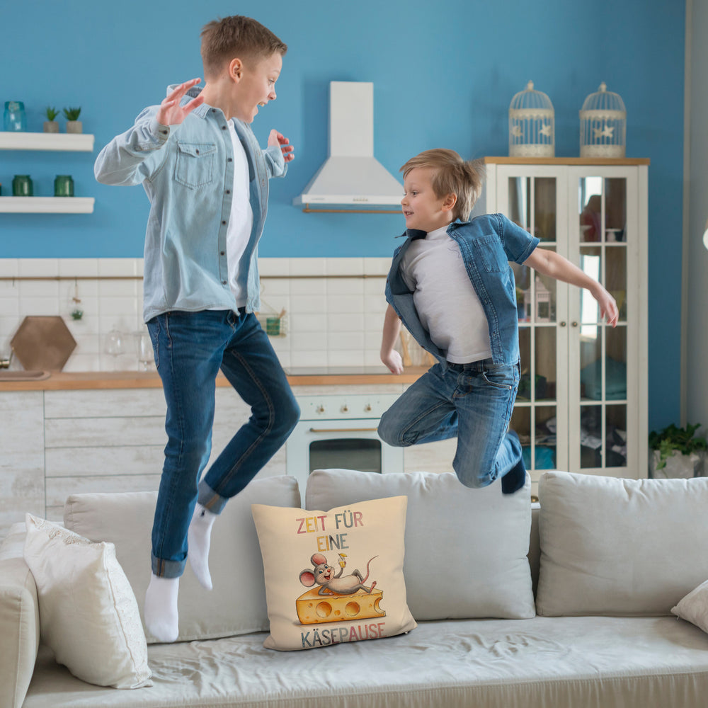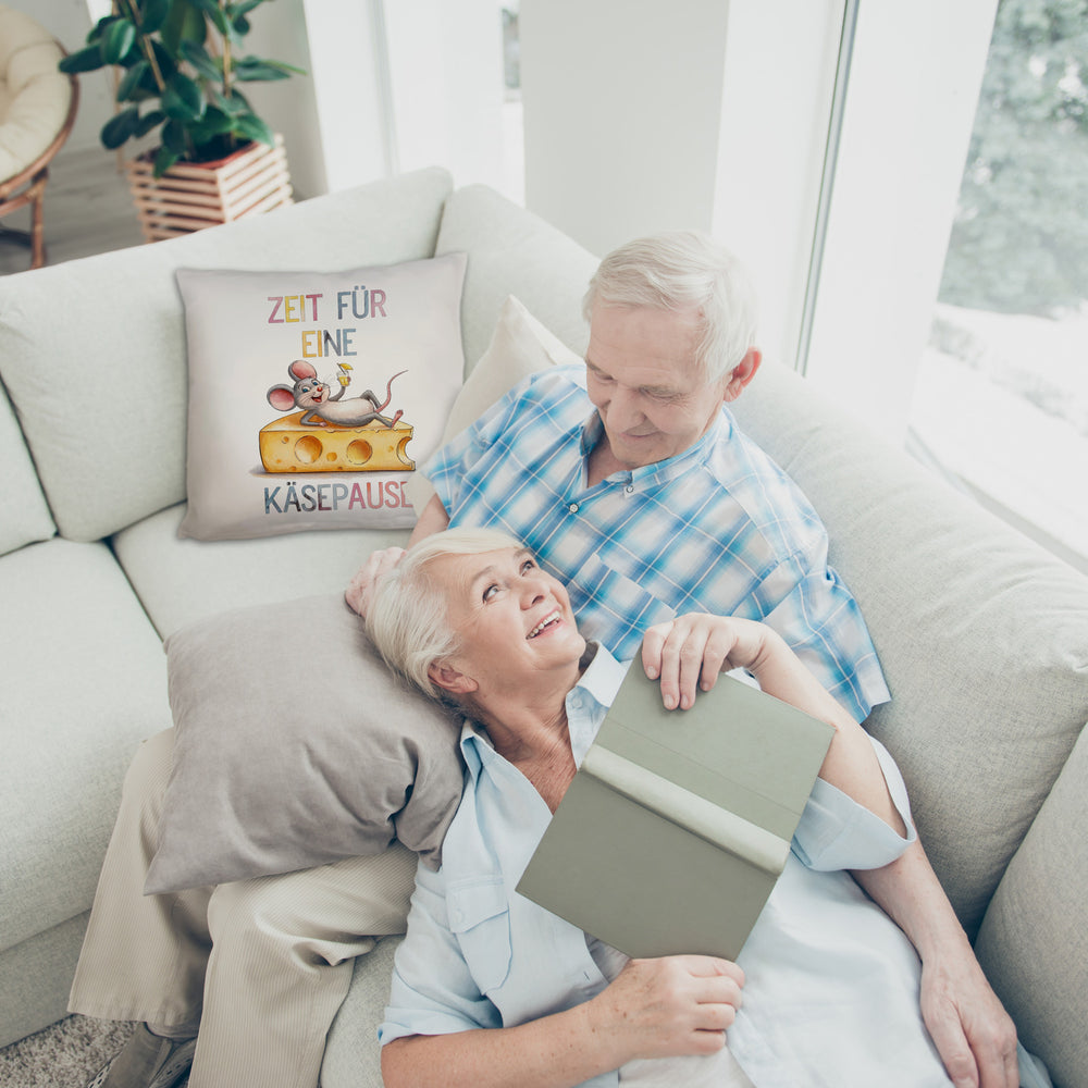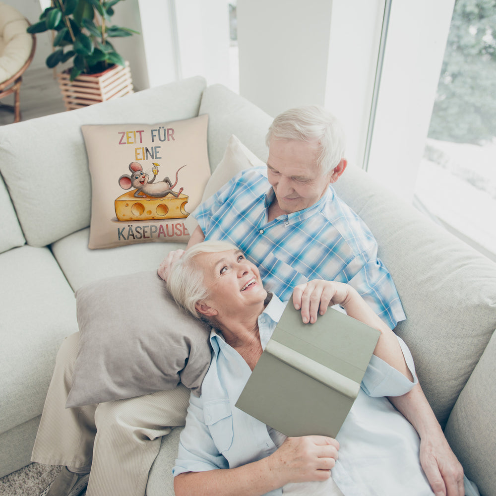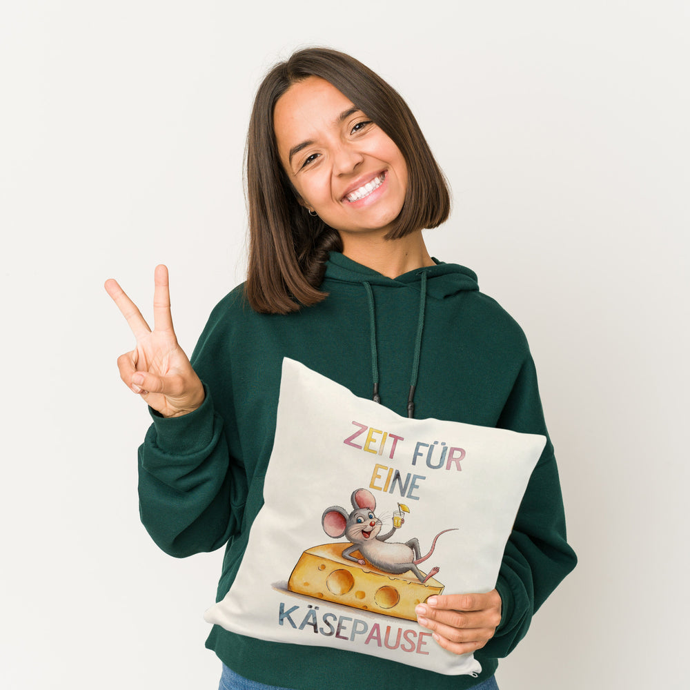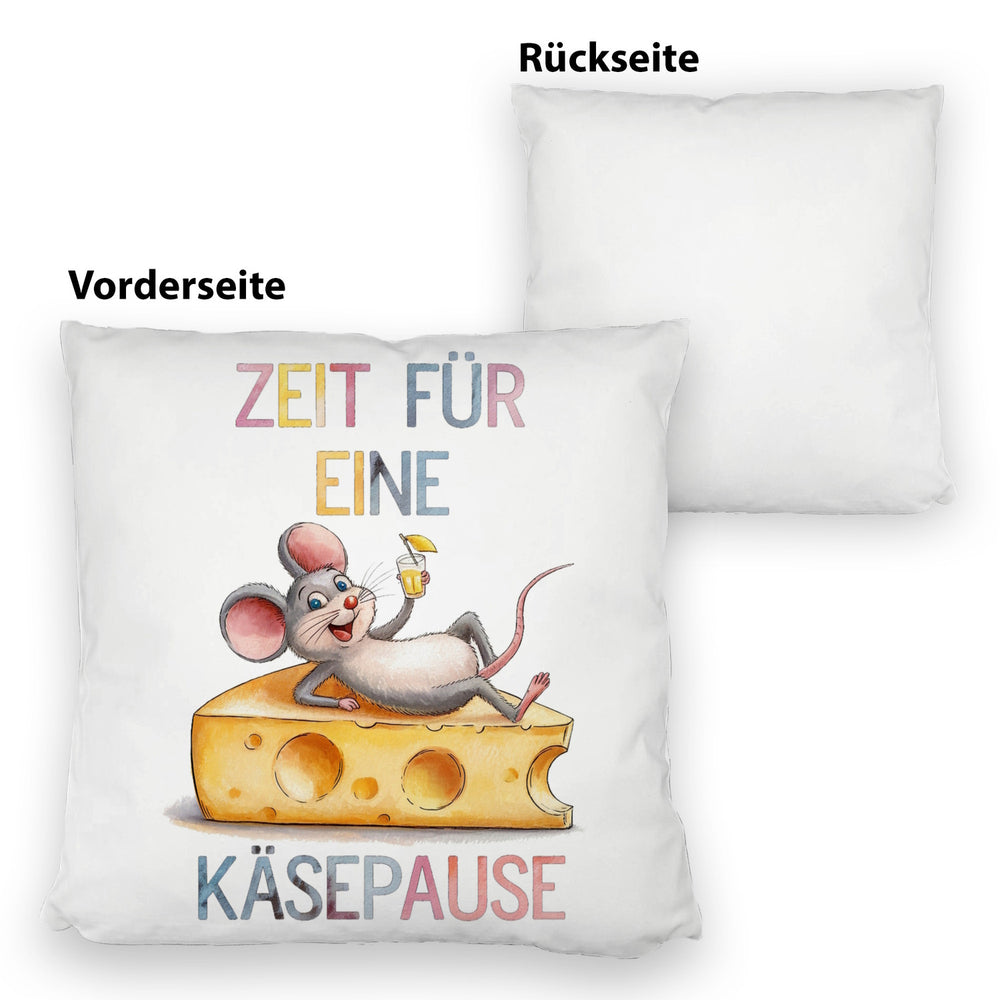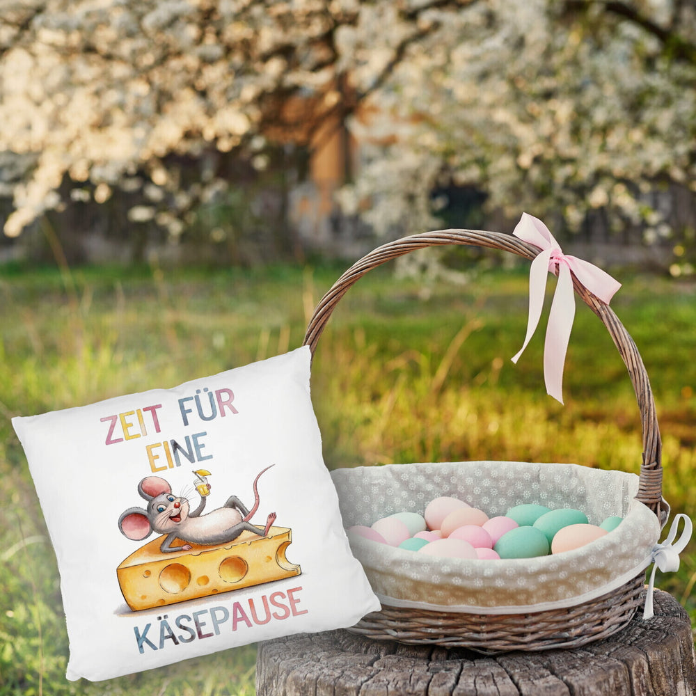 - Das fröhliche Maus auf Käse Kissen bringt Freude und Farbe ins Wohnzimmer! Auf einem strahlend weißen Hintergrund entspannt sich eine fröhliche Maus auf einem großen Käseblock, ein Glas Limonade in der Hand. Der verspielte Ausdruck und der bunte Schriftzug "ZEIT FÜR EINE KÄSEPAUSE" machen es zu einem unwiderstehlichen Hingucker.