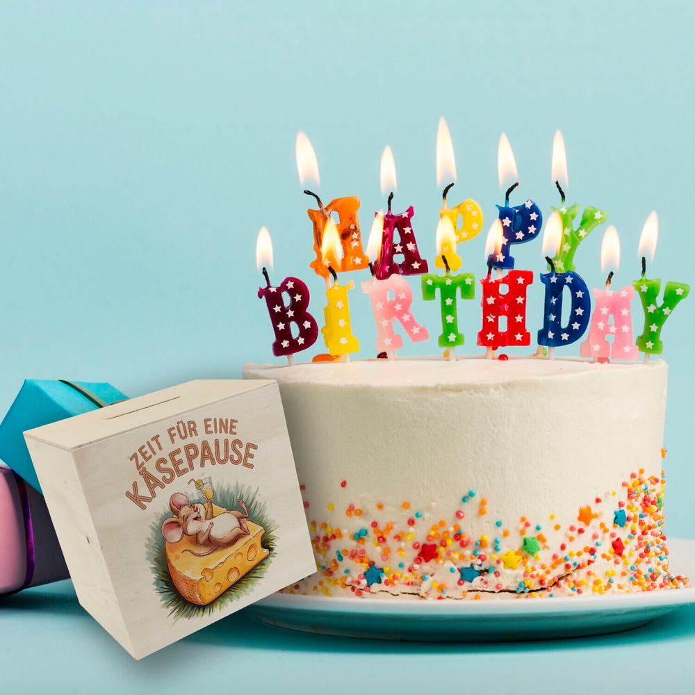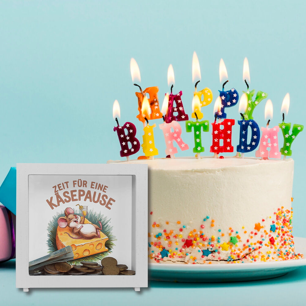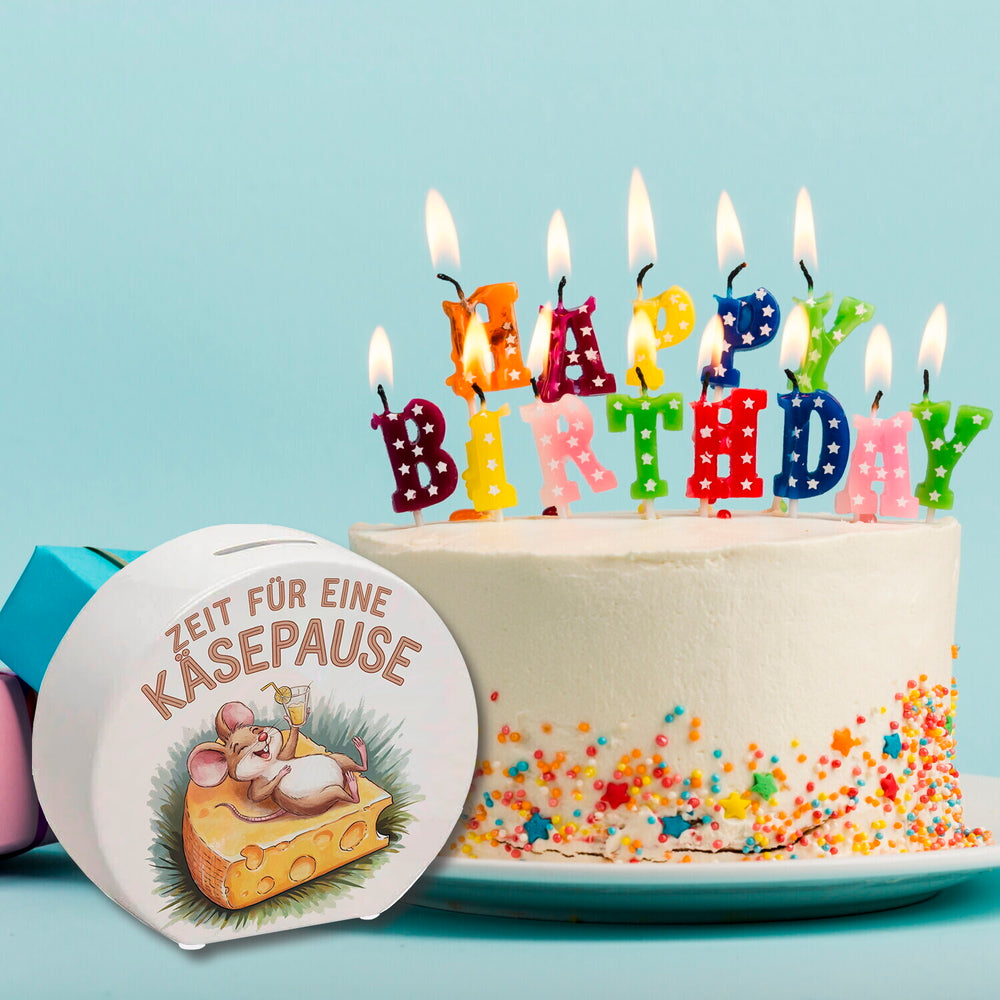 - Diese bezaubernde Spardose zeigt eine fröhliche Maus, die es sich auf einer großen Käsescheibe bequem gemacht hat. Mit einem Glas Limonade in der Hand und einem Schwanz, der verspielt um den Rand geschlungen ist, lädt sie zur Käsepause ein. Ein pastellfarbener Schriftzug und grüne Pinselstriche runden das Design ab.