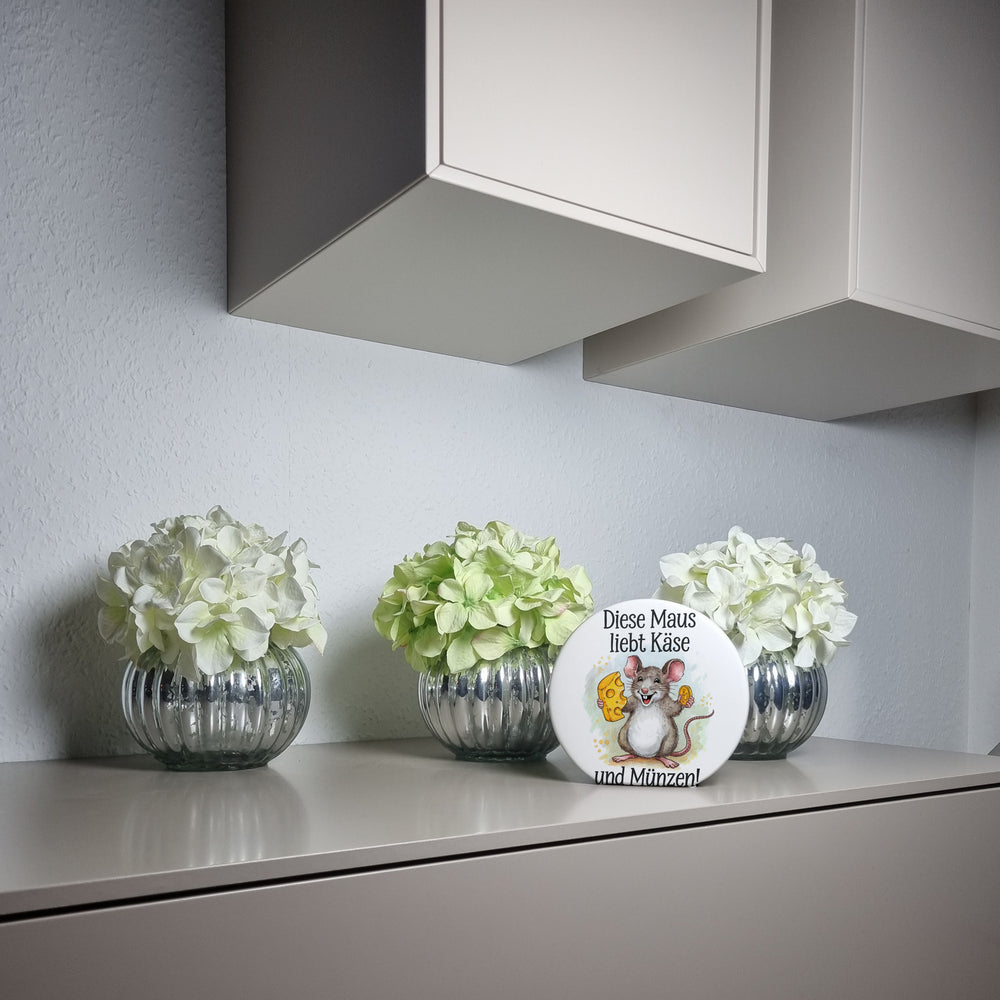 - Die fröhliche Maus mit Käse Spardose ist ein ovales Meisterwerk für alle Tierfreunde und Sparfüchse! In sanften Pastellfarben hält die putzige Maus stolz Käse und Münzen. Umrahmt von einer zarten Landschaft, erzählt sie uns: "Diese Maus liebt Käse und Münzen!". Ein niedlicher Hingucker für jeden Raum!