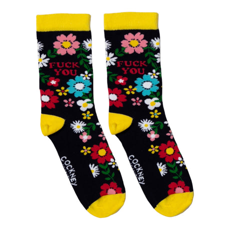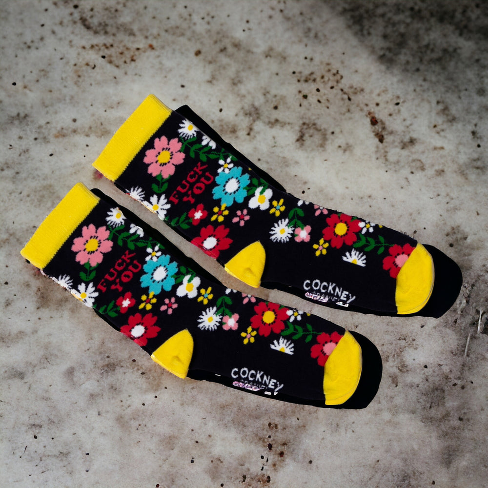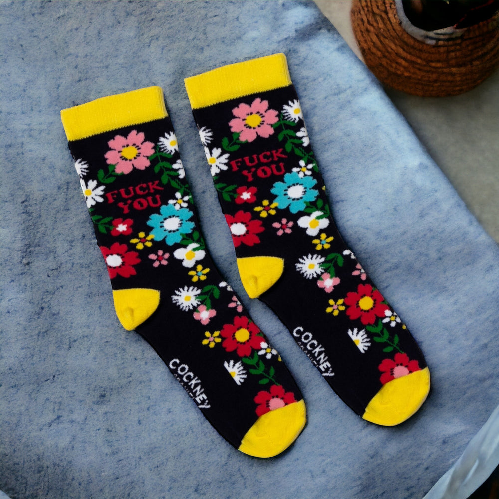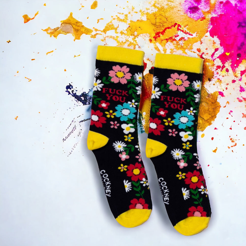- Wer sagt, dass Socken langweilig sein müssen? Mit einem bunten Blumenmeer auf dunkelblauem Grund und einem augenzwinkernden "Fuck you" drin, bieten diese Spaßsocken einen humorvollen Hingucker. Gelber Bund, Hacke, Zeh - ein Design so frech wie du!