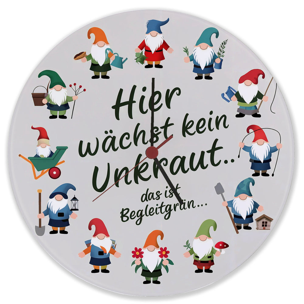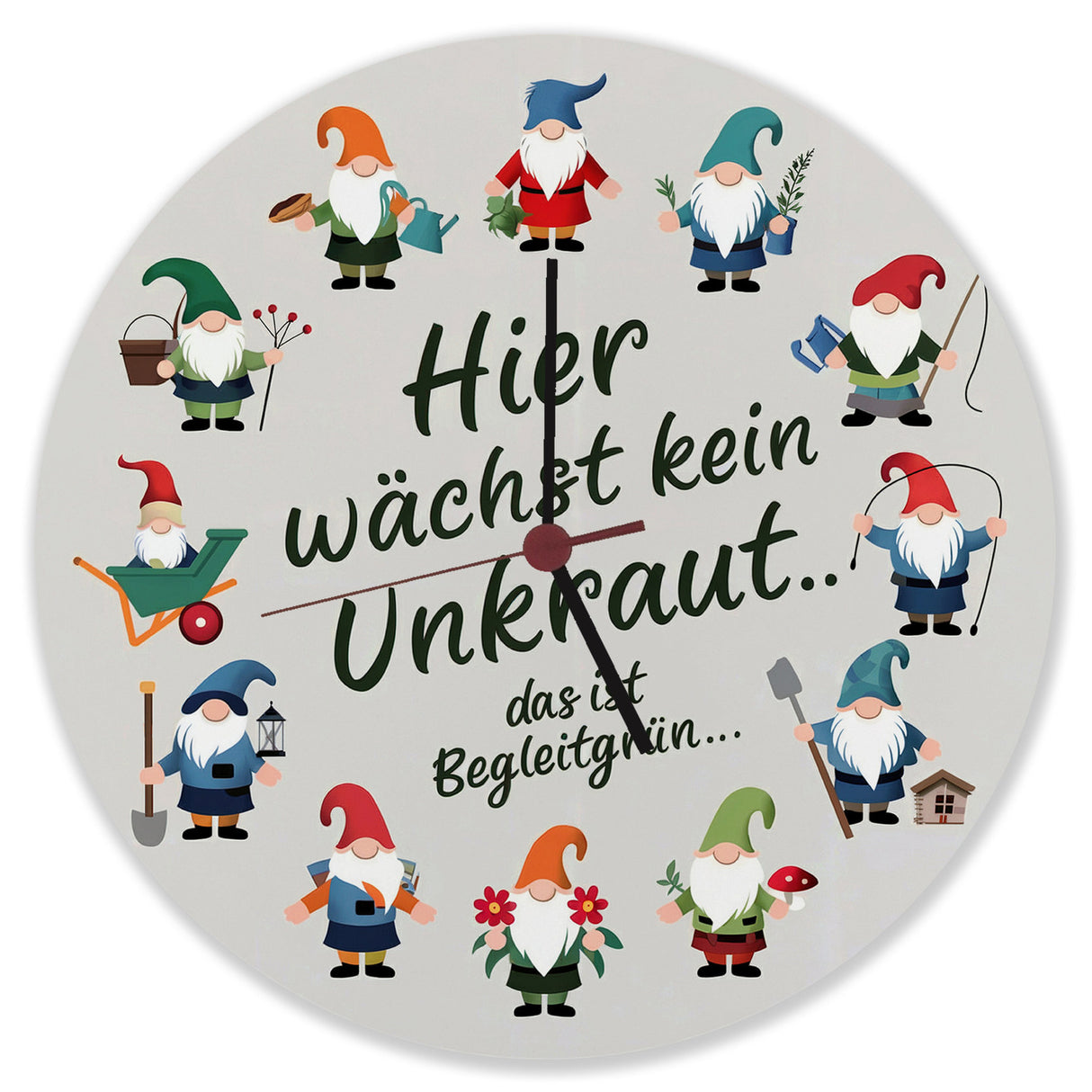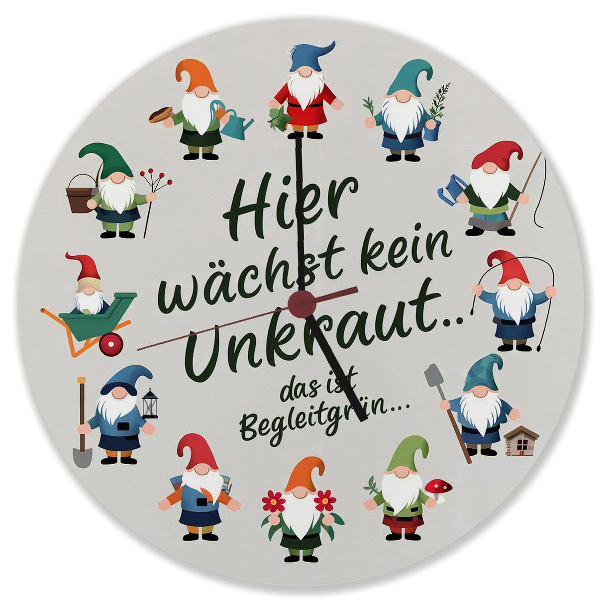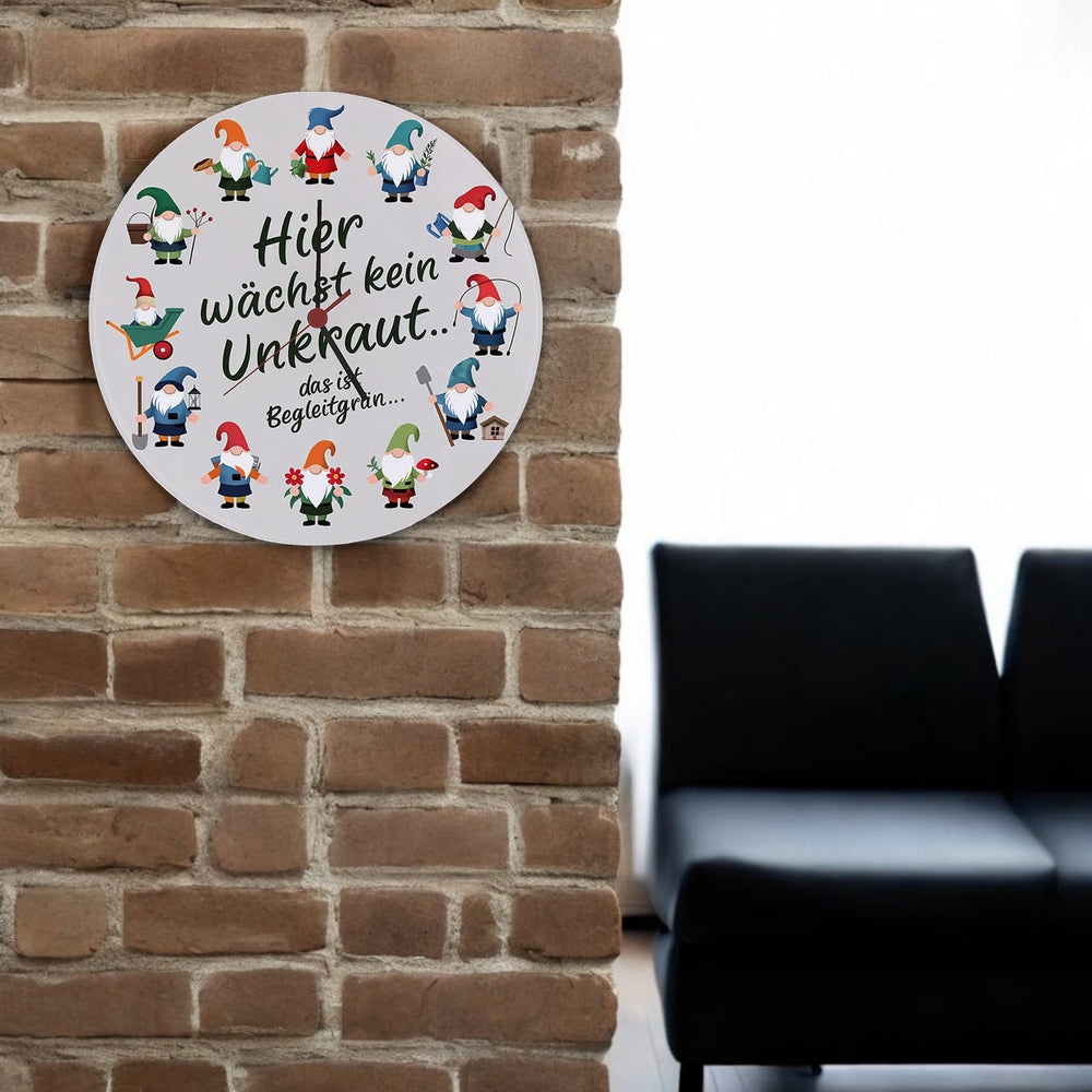 - Entdecken Sie die lustige Gartenzwerge Wanduhr! Einzigartig gestaltet und perfekt für alle Fans der kleinen Gartenhelfer. Der Spruch „Hier wächst kein Unkraut ... das ist Begleitgrün“ macht diese Uhr zum Hingucker in jedem Garten.