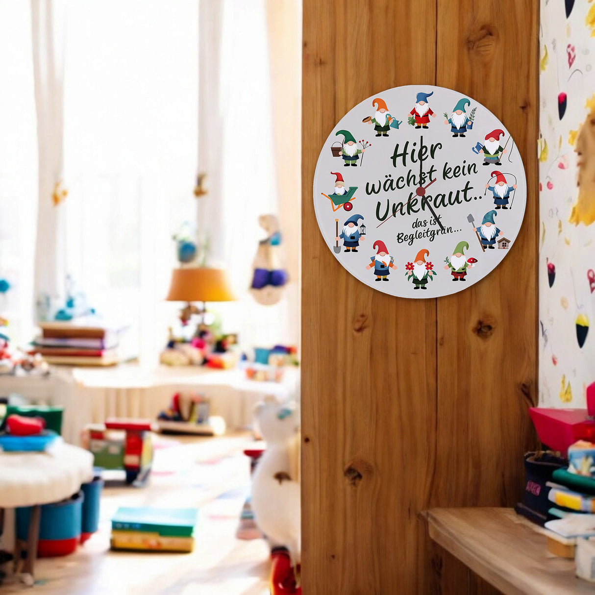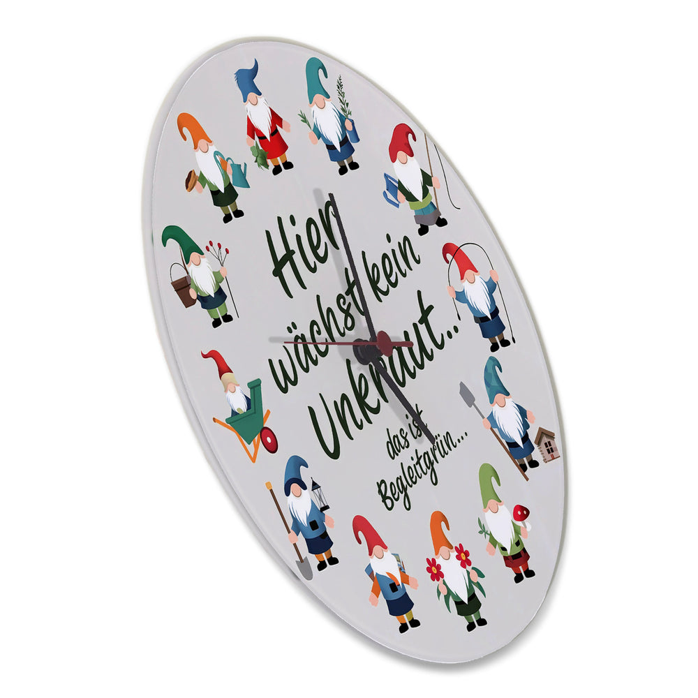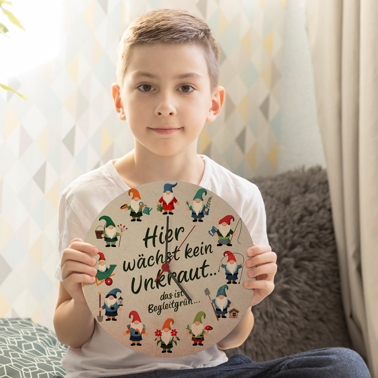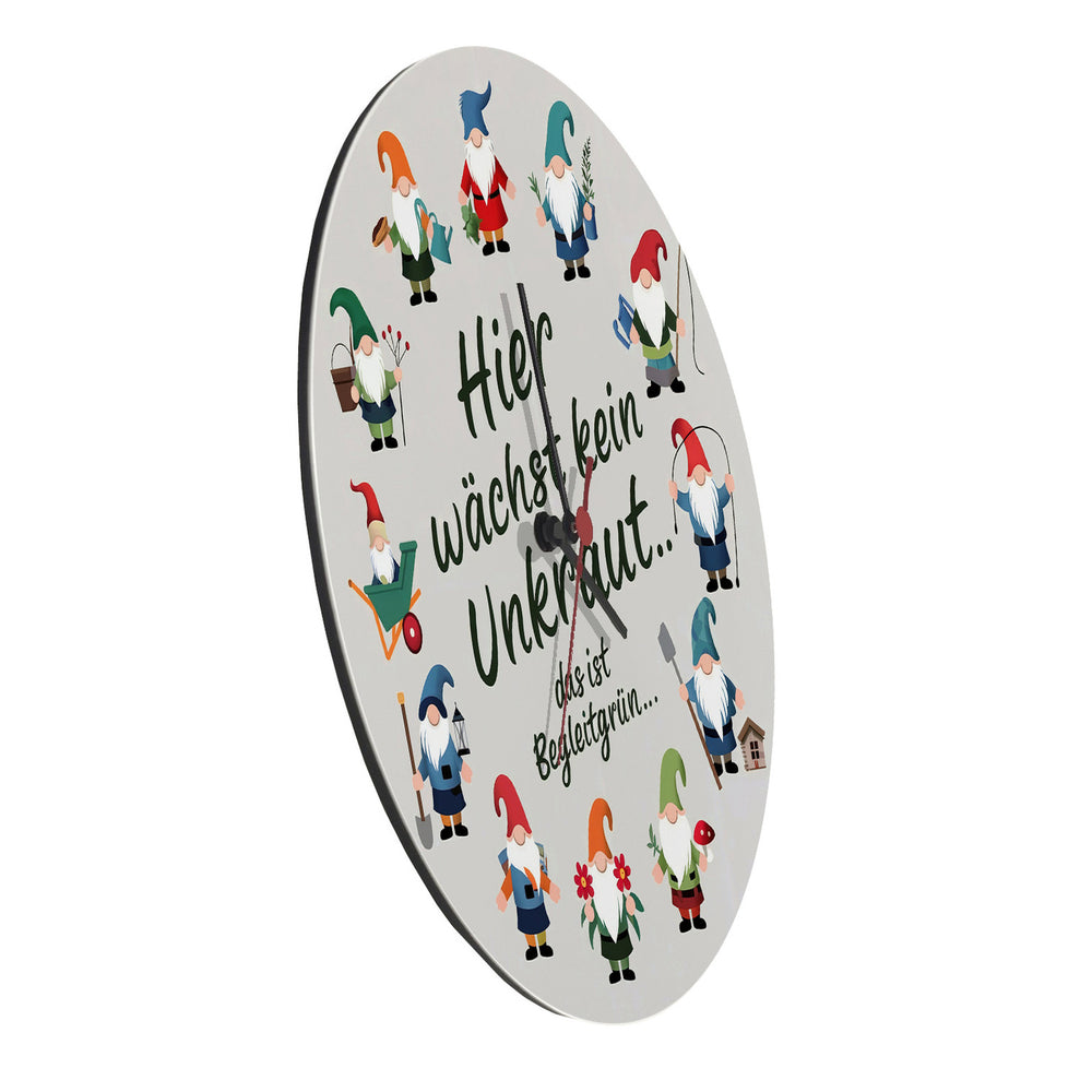 - Entdecken Sie die lustige Gartenzwerge Wanduhr! Einzigartig gestaltet und perfekt für alle Fans der kleinen Gartenhelfer. Der Spruch „Hier wächst kein Unkraut ... das ist Begleitgrün“ macht diese Uhr zum Hingucker in jedem Garten.