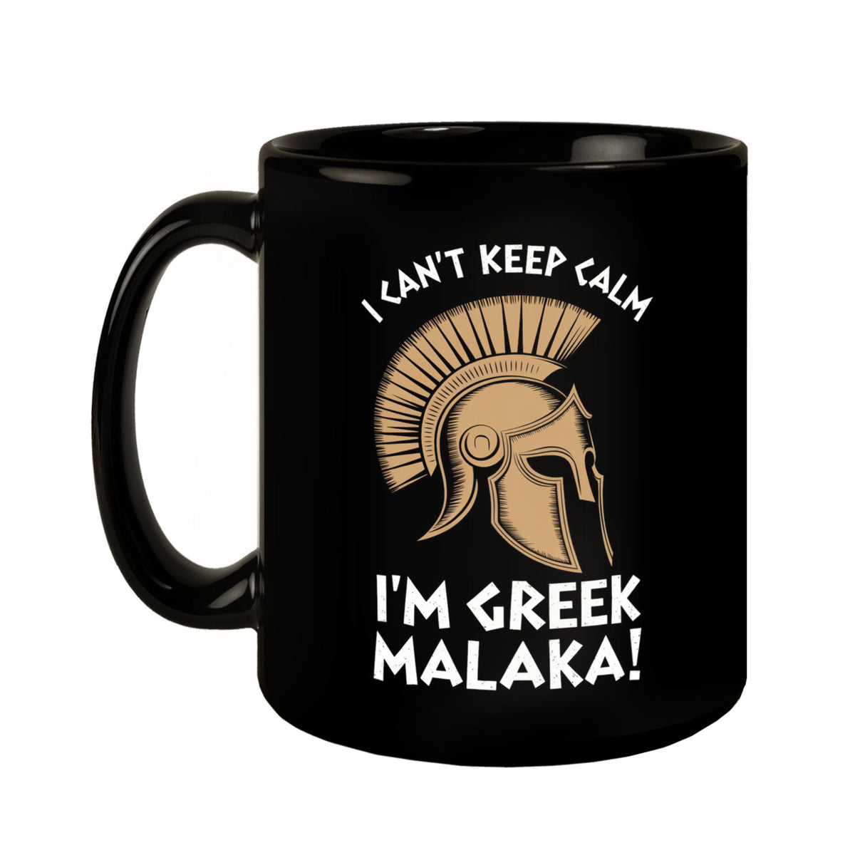 - Diese schwarze Tasse besticht durch ihr auffälliges Design: Ein griechischer Helm thront majestätisch im Zentrum, umrahmt von der frechen Botschaft "I CAN'T KEEP CALM I'M GREEK MALAKA!". Der Kontrast aus schlichtem Schwarz und dem markanten, abgenutzten Schriftzug macht sie zum Blickfang auf jedem Tisch.