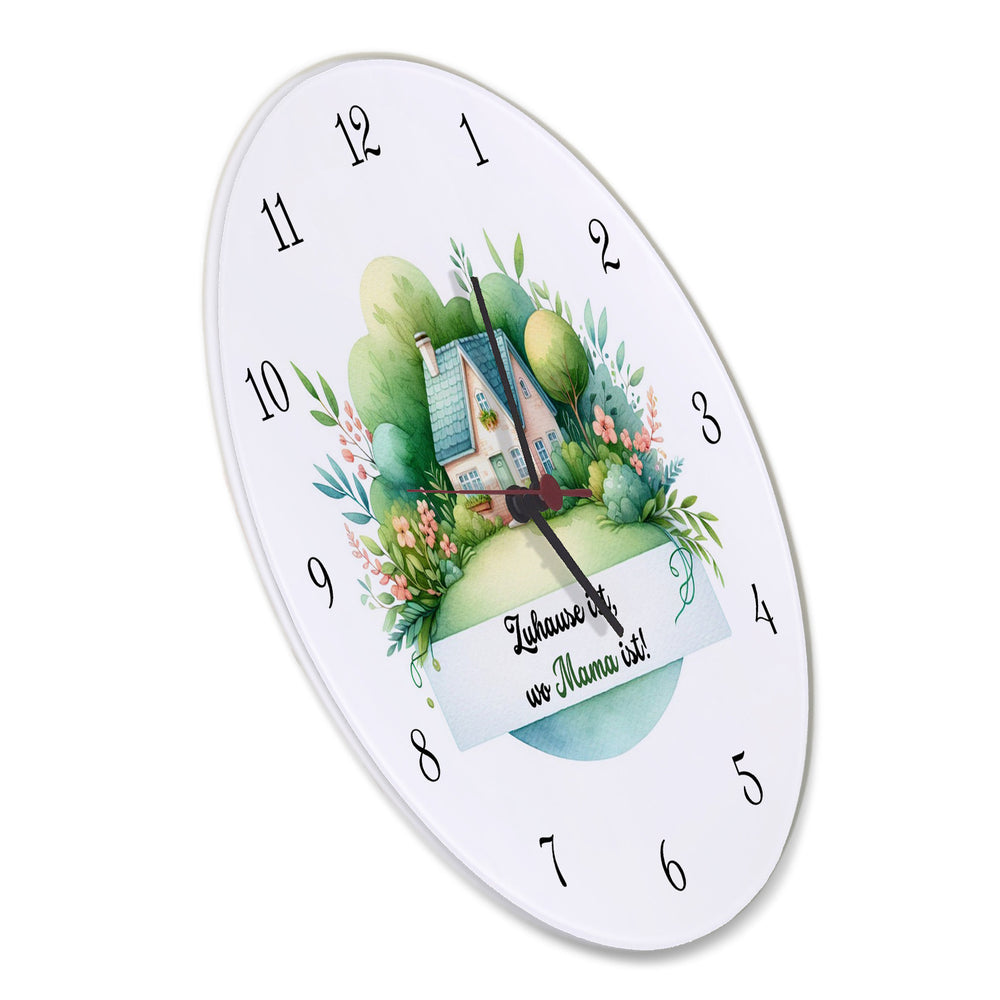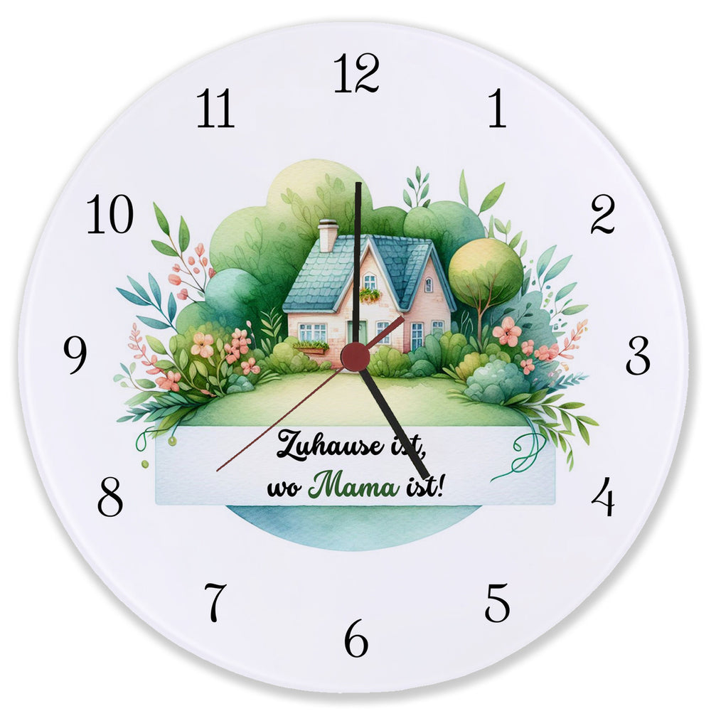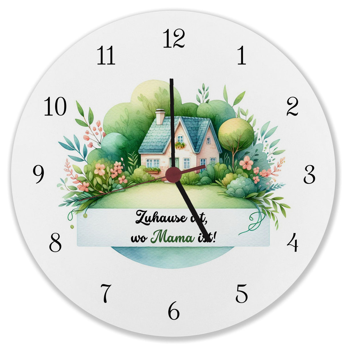 Häuschen im Grünen Wanduhr mit Spruch Zuhause ist wo Mama ist