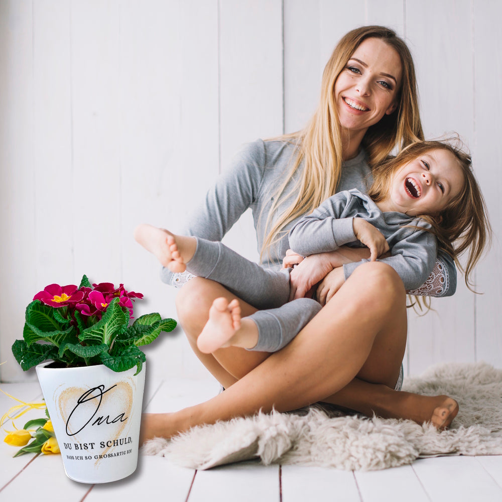 - Suchst du das wahre Geheimnis deiner Großartigkeit? Unser "Herz Blumentopf" lüftet es mit einem Augenzwinkern: "Oma, du bist schuld, dass ich so großartig bin!" Eingebettet in ein strahlendes goldene Herz, ist dieser Topf die charmanteste Liebeserklärung in Keramikform, die Oma je gesehen hat!