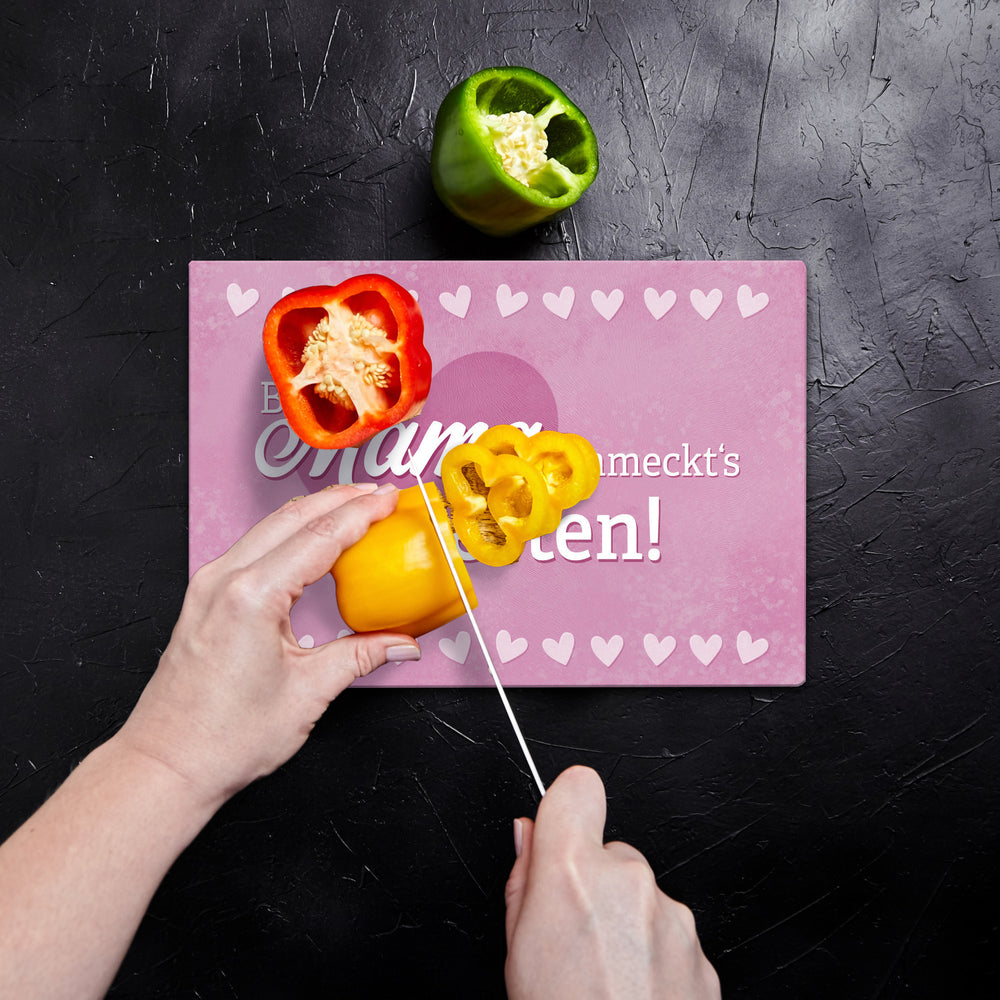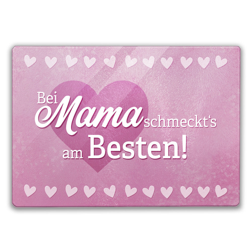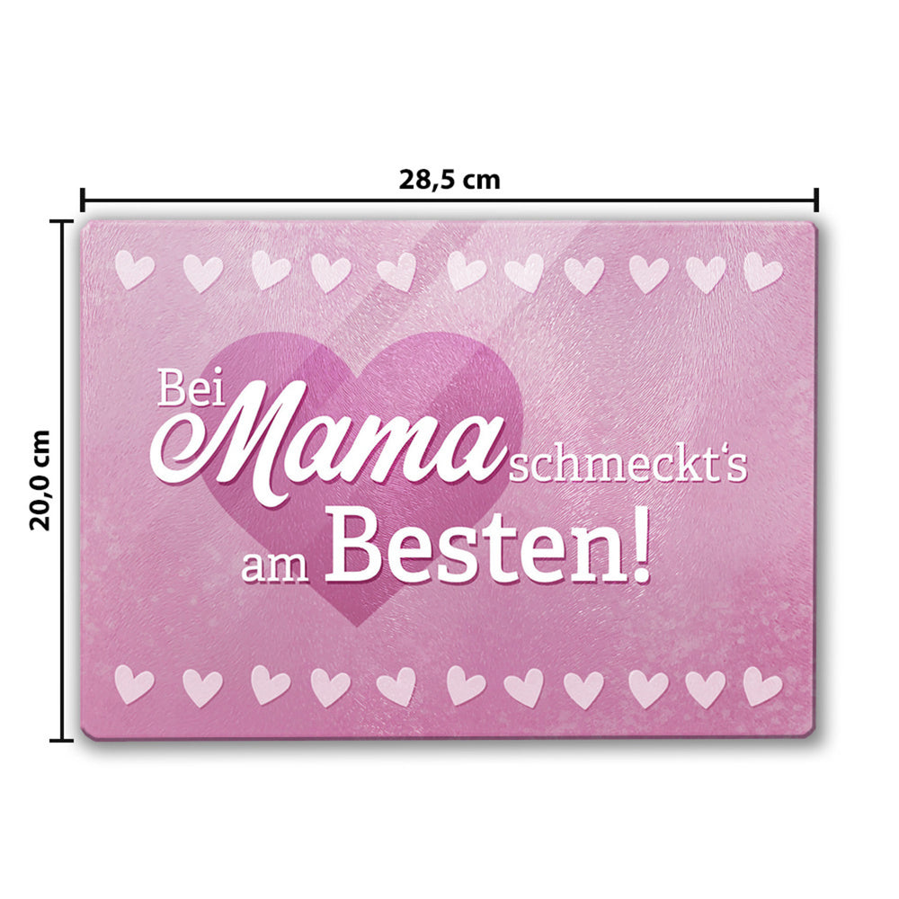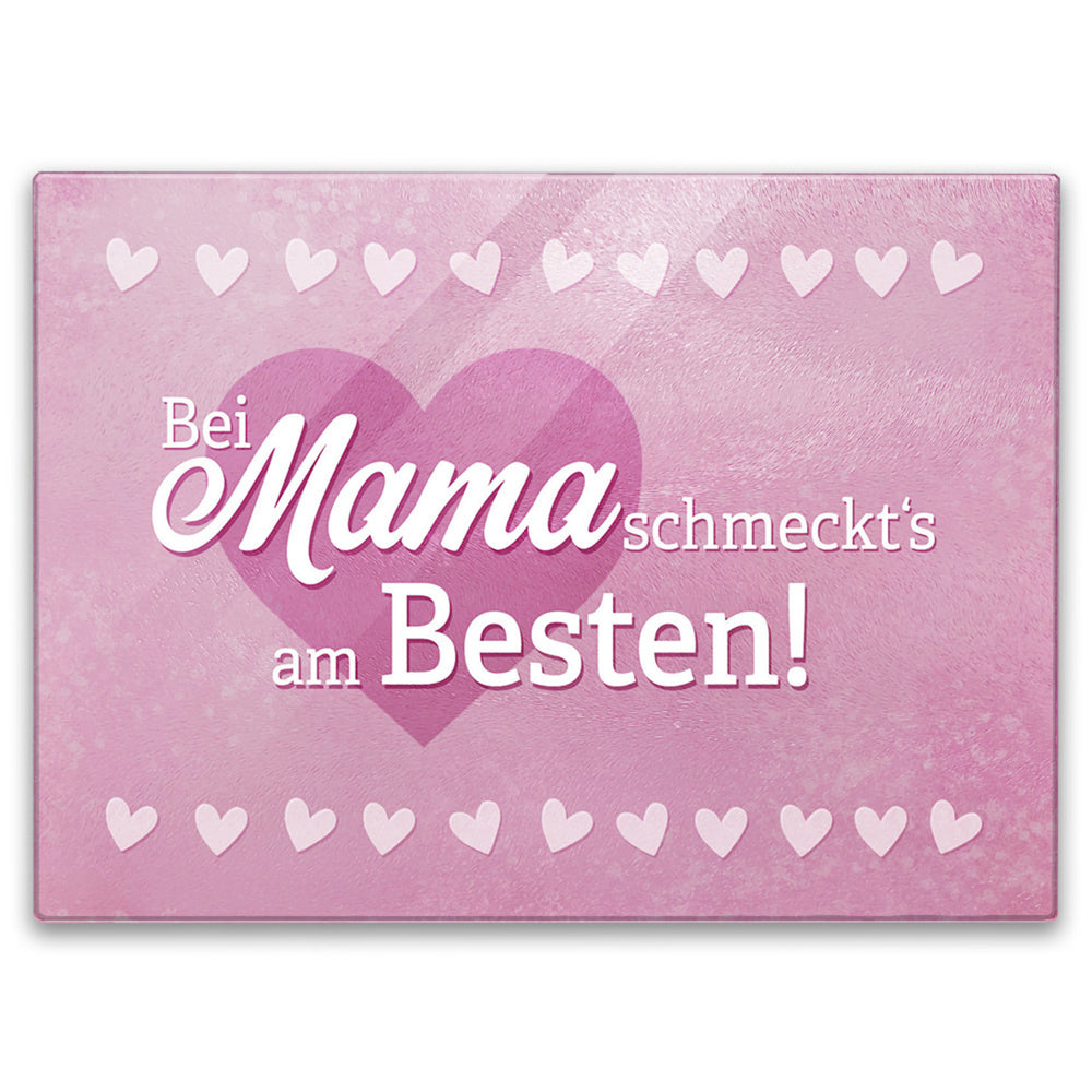 Herz Schneidebrett aus Glas mit Spruch Bei Mama schmeckts am Besten