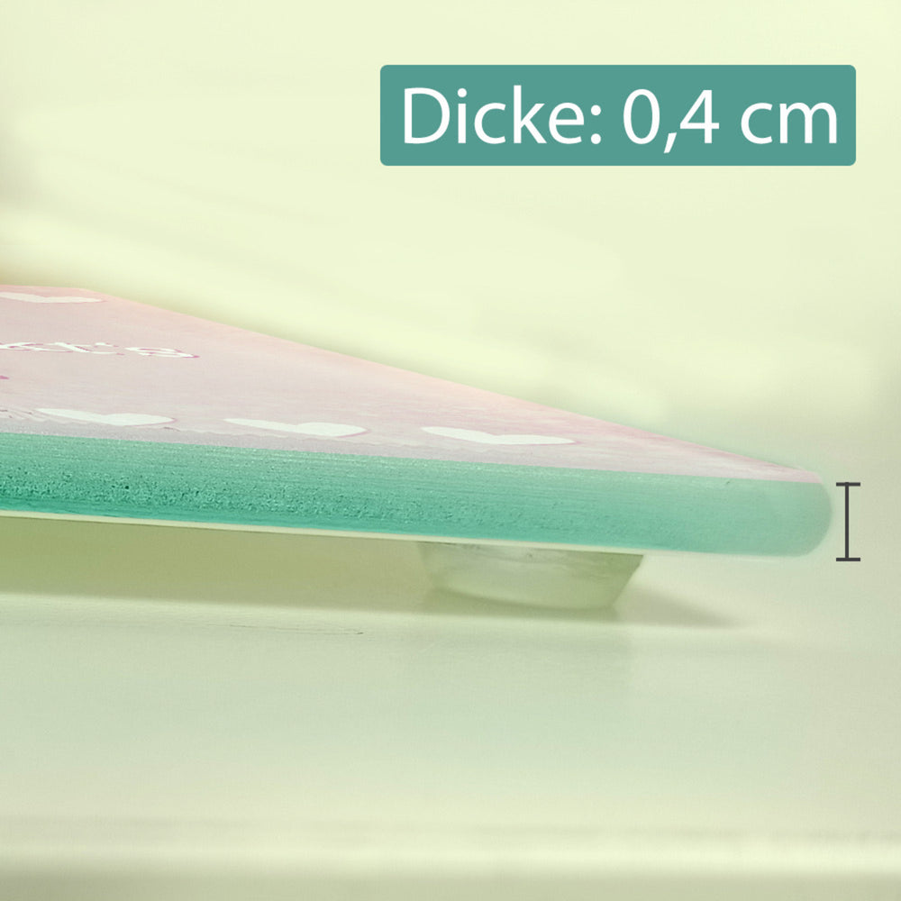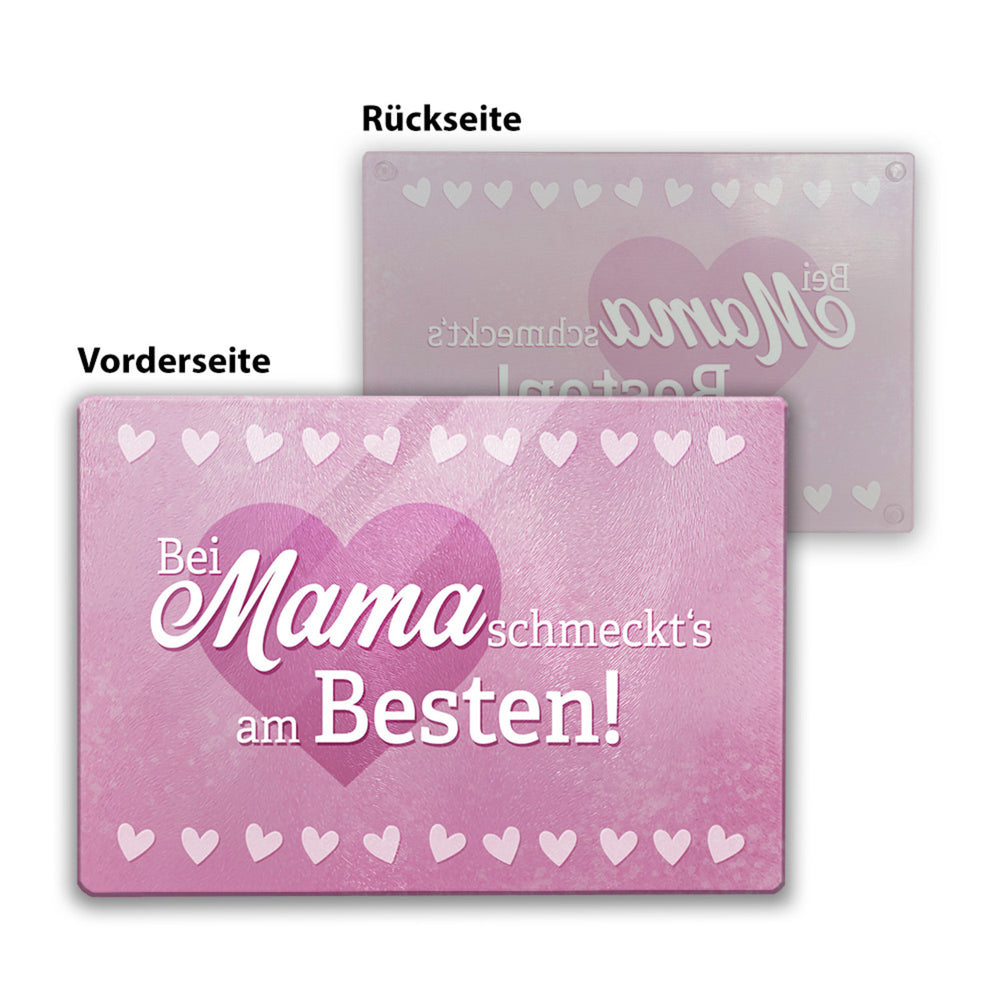 - 1x Herz Schneidebrett aus Glas mit Spruch Bei Mama schmeckts am Besten in der gewählten Größe
