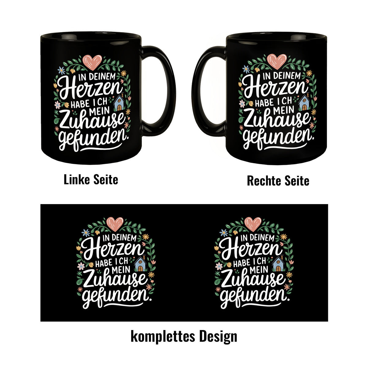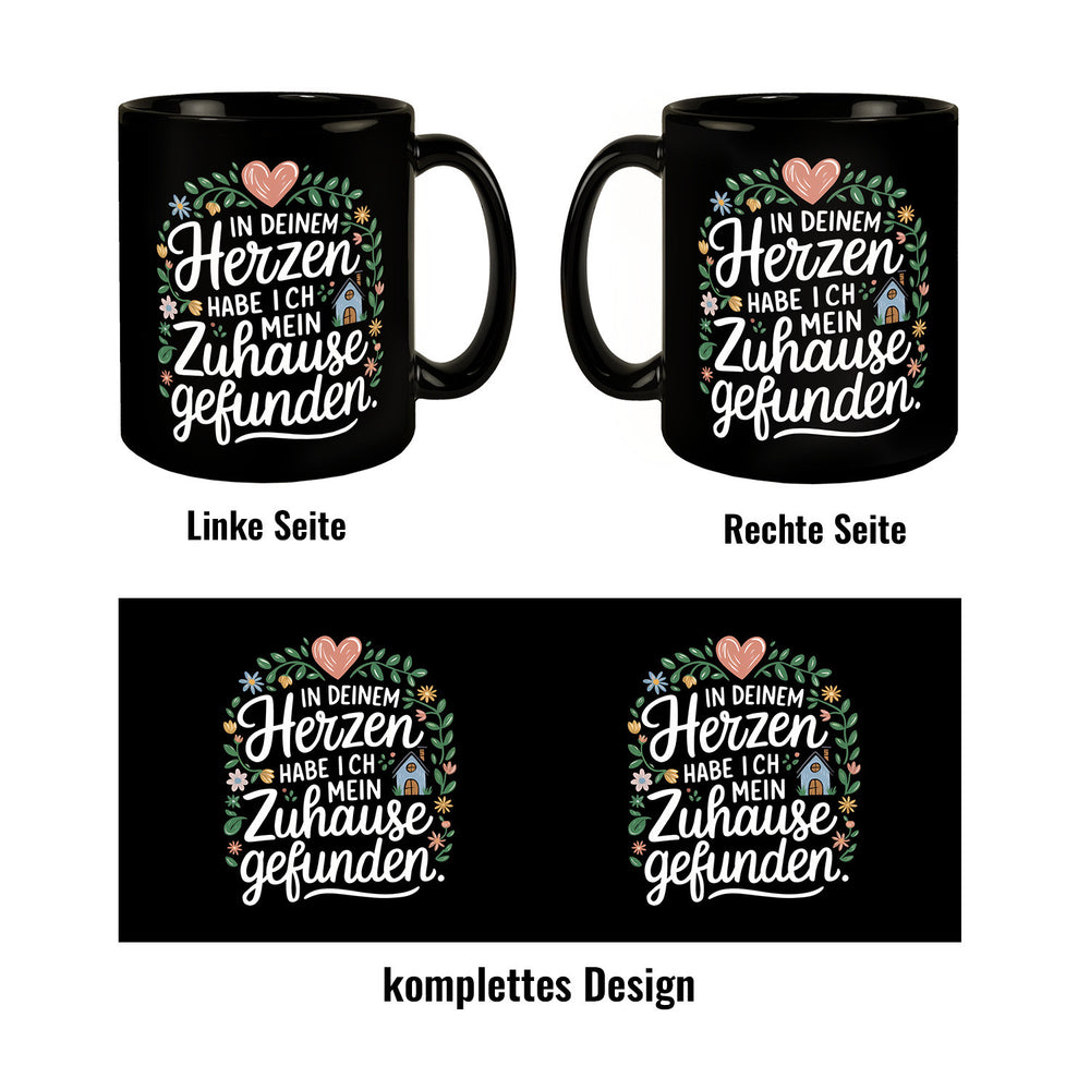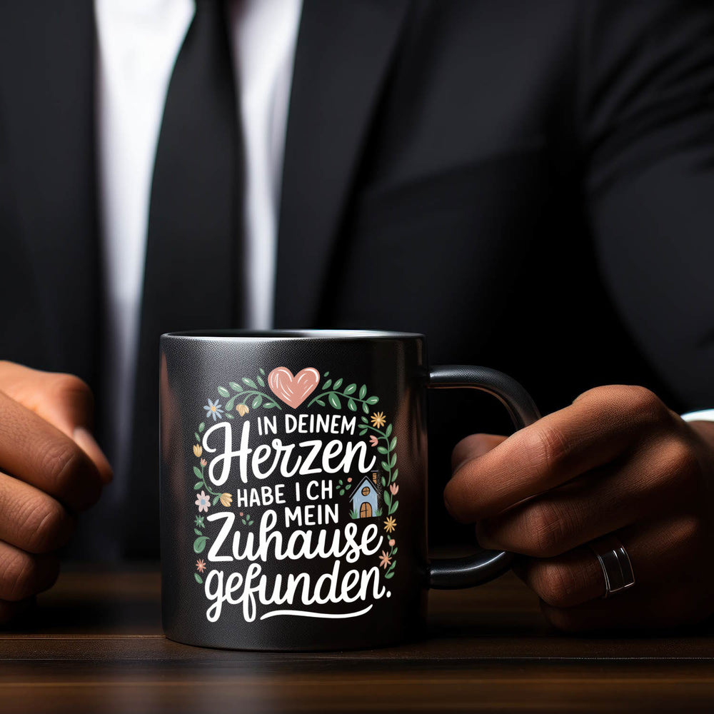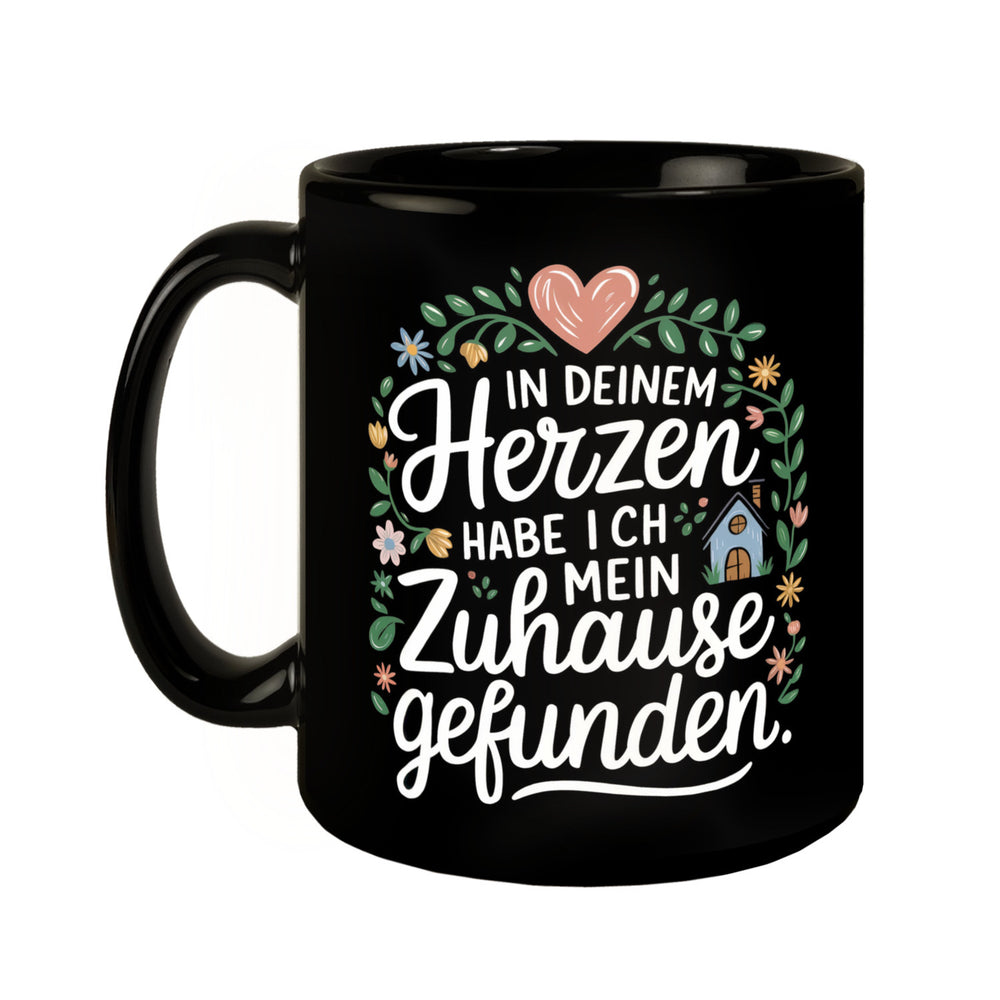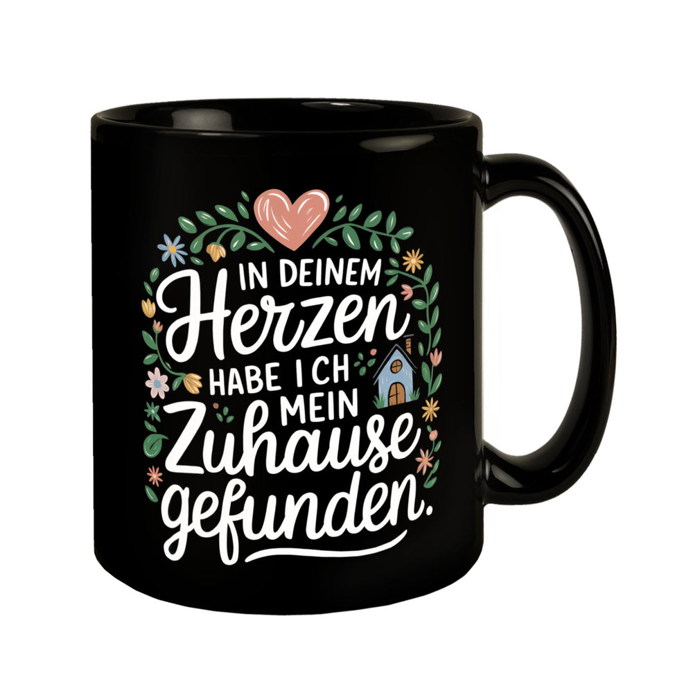 - Diese bezaubernde Kaffeetasse kombiniert ein Herz und ein Haus mit floralen Elementen, die für Liebe und Zuhause stehen. Der Spruch "IN DEINEN HERZEN HABE ICH MEIN ZUHAUSE GEFUNDEN" in eleganten weißen Kursivbuchstaben hebt sich herrlich vom tiefschwarzen Hintergrund ab. Perfekt, um deiner Küche ein bisschen Romance zu schenken!