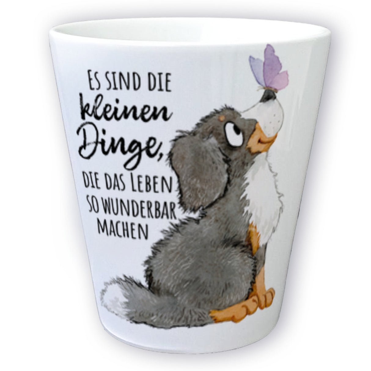 Lassen Sie die kleinen Dinge Ihr Zuhause verschönern - mit dem wunderschönen Hund Blumentopf mit Spruch Die kleinen Dinge machen das Leben so wunderbar. Dieser charmante Keramik Übertopf zeigt einen niedlichen Bernersennen Welpen und ist ideal für alle, die ihre Pflanzen stilvoll präsentieren möchten. Der Spruch Es sind die kleinen Dinge, die das Leben so wunderbar machen unterstreicht die Bedeutung von Freude an kleinen Dingen im Leben. Er ist ein tolles Geschenk für Frauen, besonders zum Geburtstag, und kann allein oder zusammen mit einem passenden Blümchen oder Pflänzchen verschenkt werden. Verpassen Sie nicht die Gelegenheit, sich diesen charmanten Blumentopf zu sichern und verleihen Sie Ihrem Zuhause einen Hauch von Charme und Gemütlichkeit!