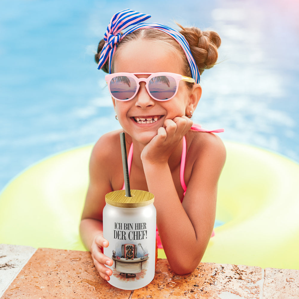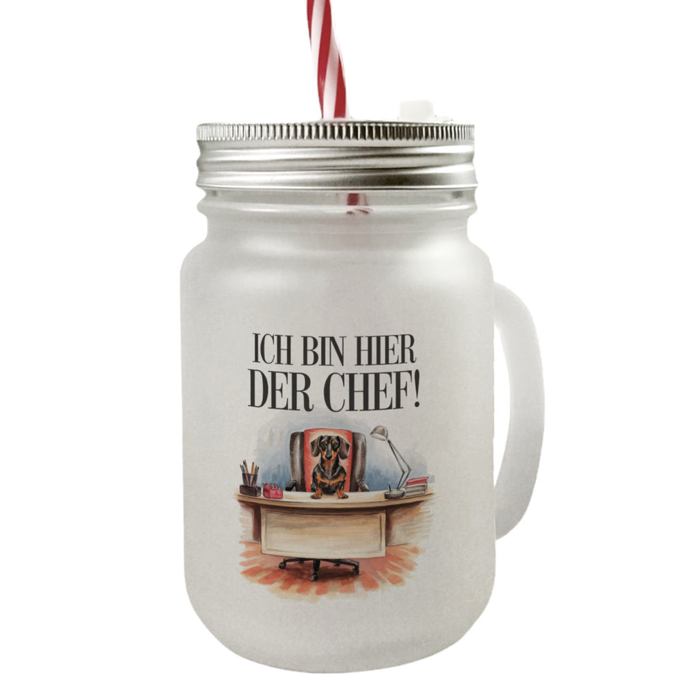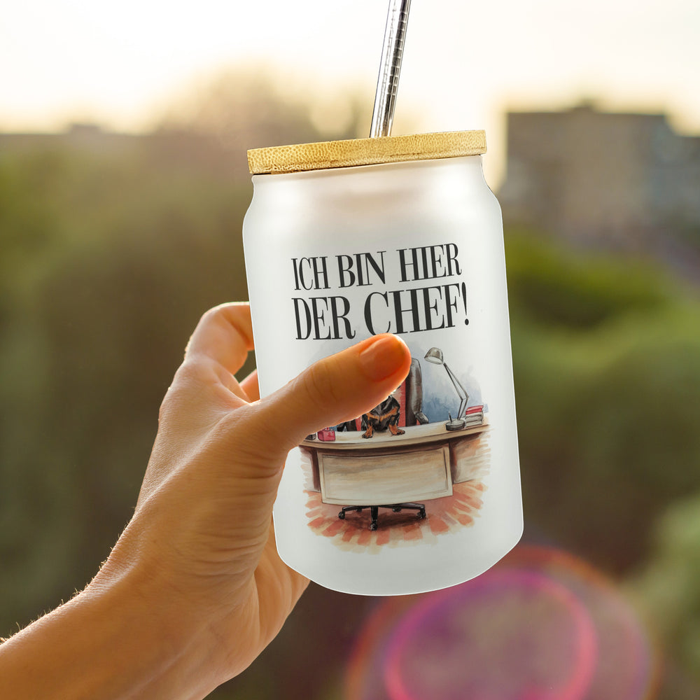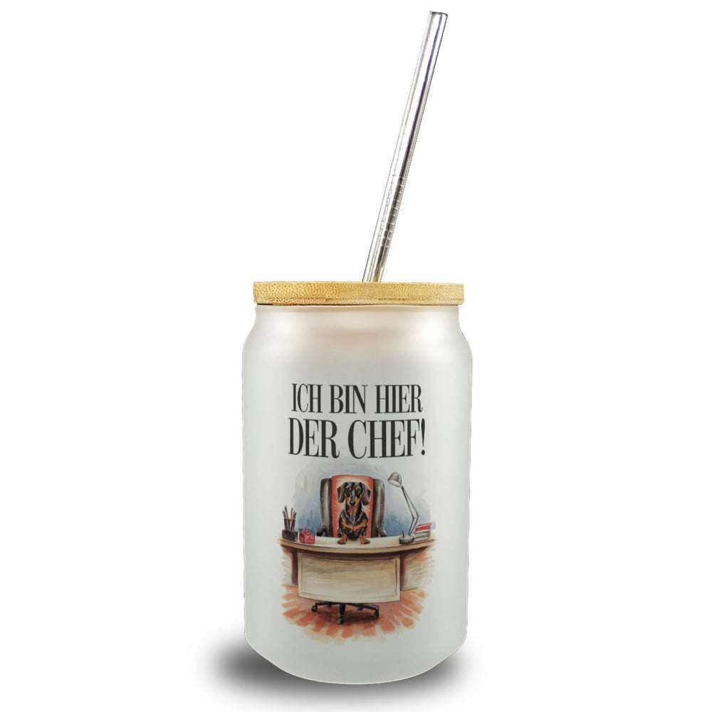 Ich bin hier der Chef Trinkglas mit Bambusdeckel Dackel auf Bürostuhl