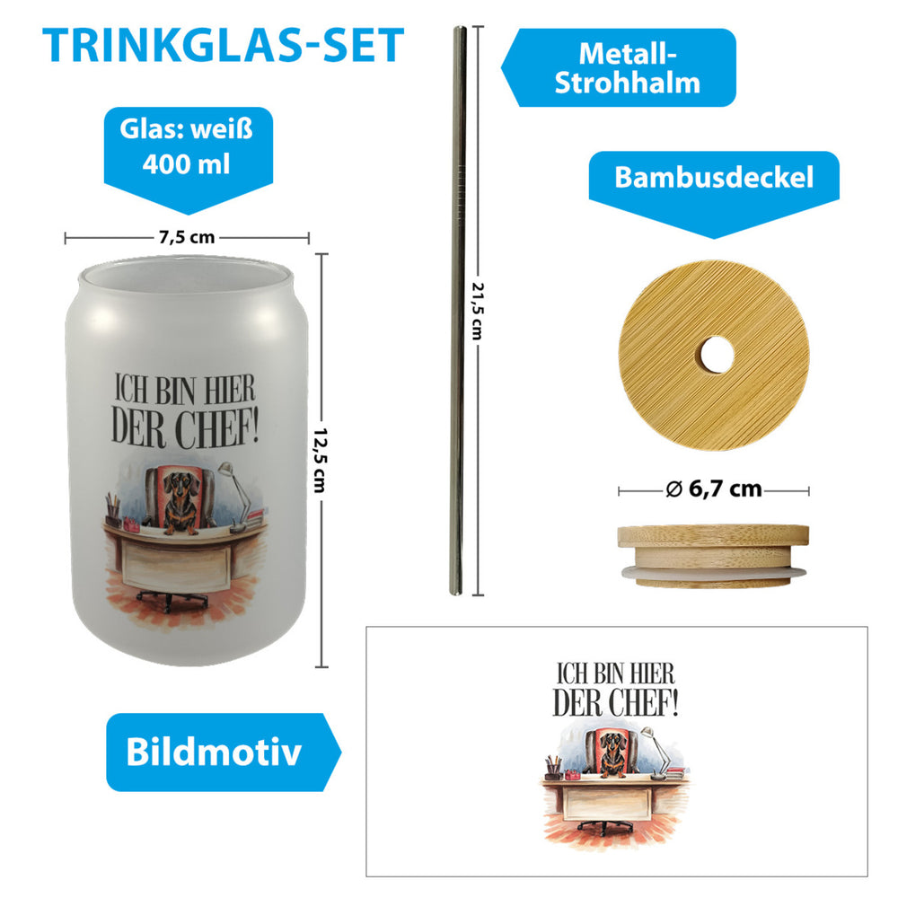 • 1x Ich bin hier der Chef Trinkglas mit Bambusdeckel Dackel auf Bürostuhl mit Bambusdeckel oder Henkel