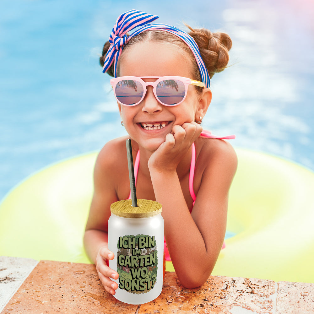 Im Garten, wo sonst? Trinkglas mit Bambusdeckel Gartenszene