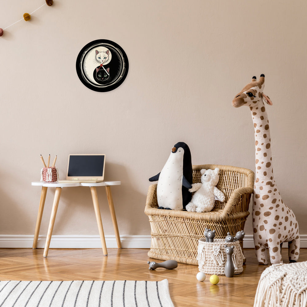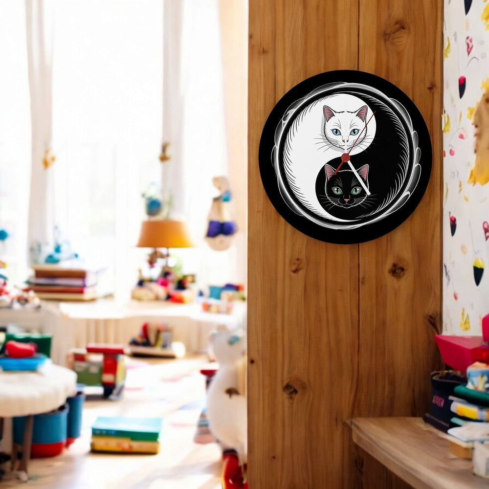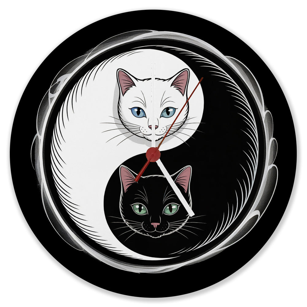 - Die Katzen Yin und Yang Wanduhr verzaubert mit einem mystischen Design: Auf schwarzem Hintergrund thront das ikonische kreisförmige Symbol, gebildet von einer ruhigen weißen Katze mit blauen Augen und einer eleganten schwarzen Katze mit grünen Augen. Ihre Körper umfließt eine sanfte Energie, die Harmonie und Balance widerspiegelt.
