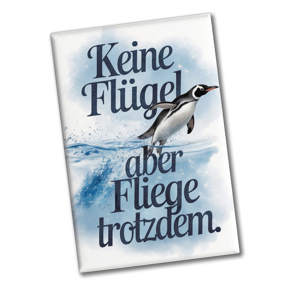 - Der rechteckige Magnet zeigt einen frechen Pinguin, der mutig aus dem Wasser springt, als könnte er fliegen. Das niedliche Design in pastelligen Aquarellfarben und ein freches "Keine Flügel, aber fliege trotzdem" zaubern jedem ein Lächeln aufs Gesicht. Der orangefarbene Schnabel und das Herzsymbol runden das lustige Motiv ab.