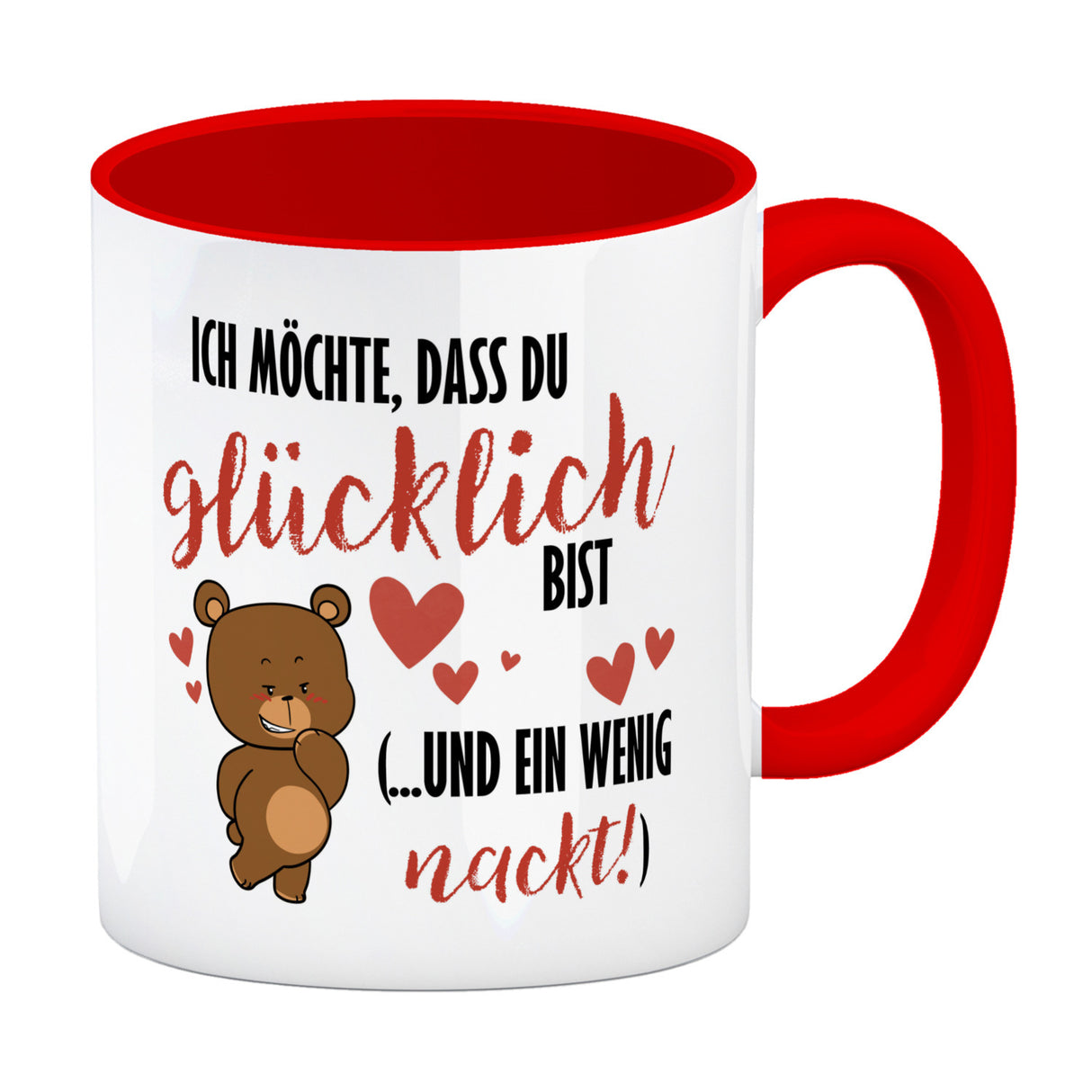 Knuddelbär Kaffeebecher mit Spruch Sei glücklich und etwas nackt