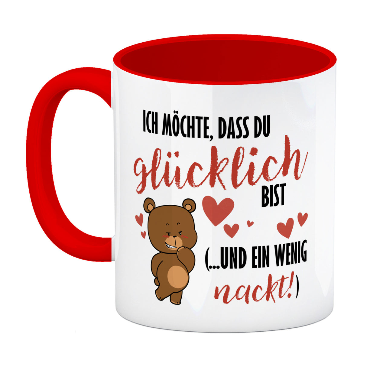 • Überrasche deine Herzensdame mit einem Augenzwinkern. Der "Sei glücklich und etwas nackt" Kaffeebecher ist ein Lacher am Morgen und der erotischste Weg, ihr zu sagen: "Ich hab' dich lieb" - und mehr. Der Knuddelbär wartet schon, lass ihn nicht zu lange kalt!