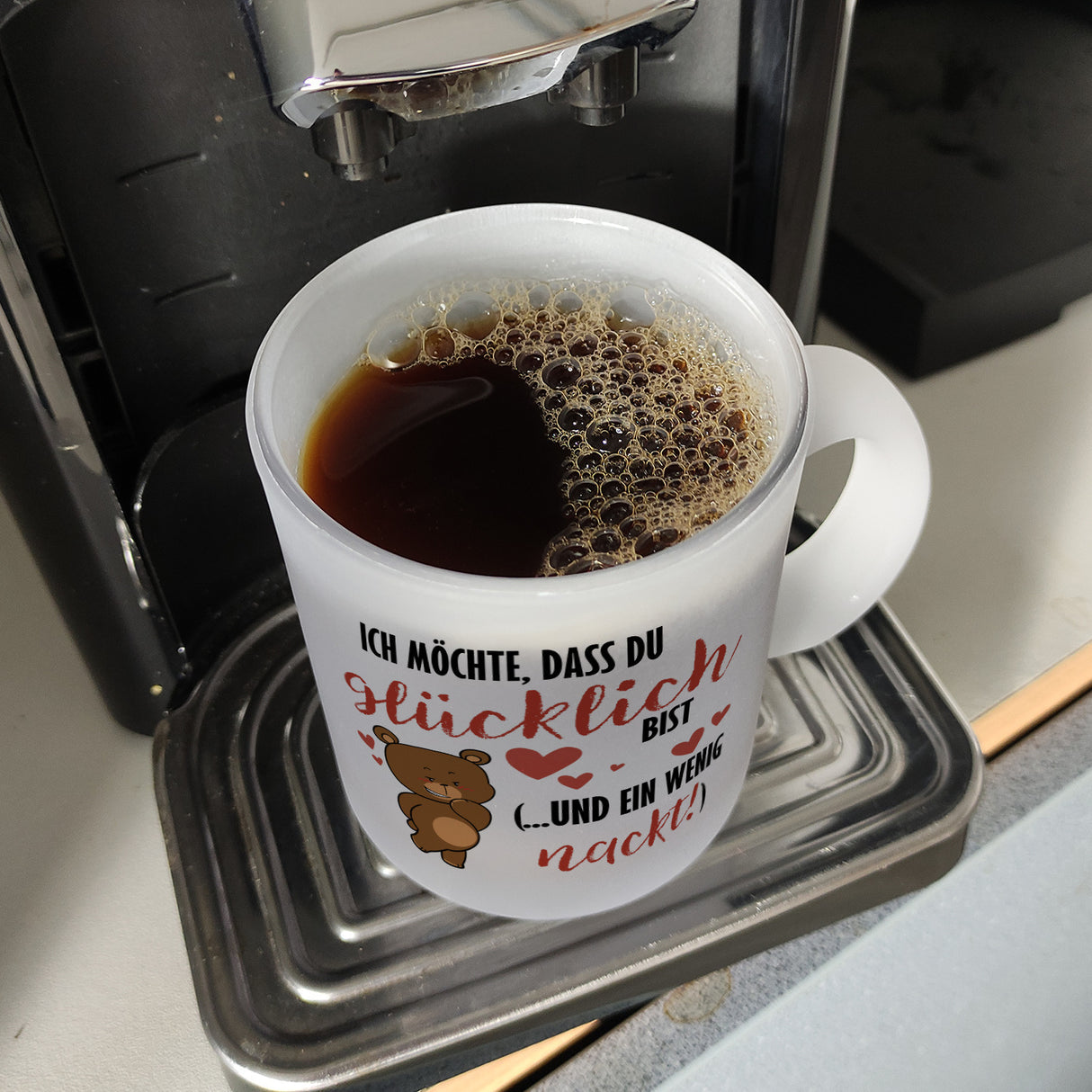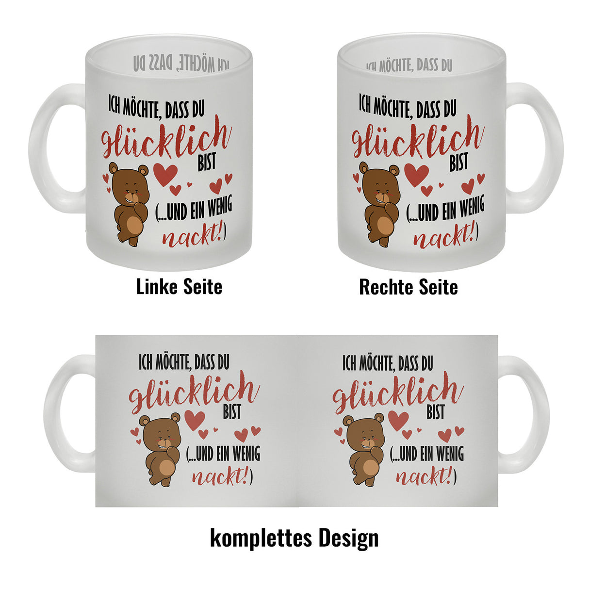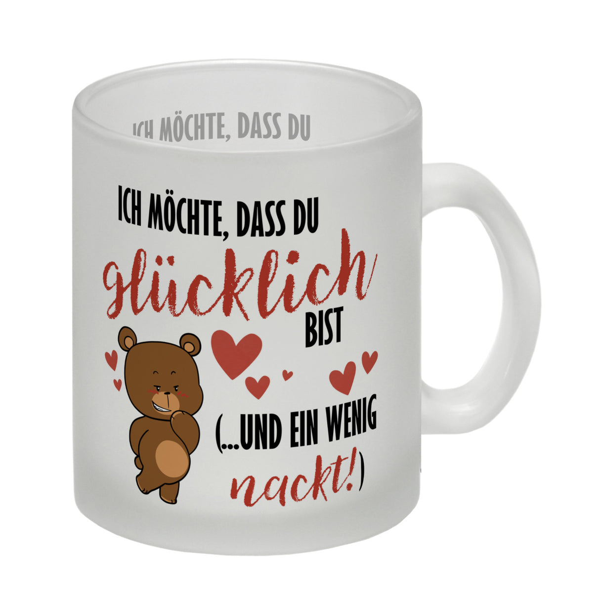 • 1x Knuddelbär Kaffeebecher mit Spruch Sei glücklich und etwas nackt in der gewählten Ausführung