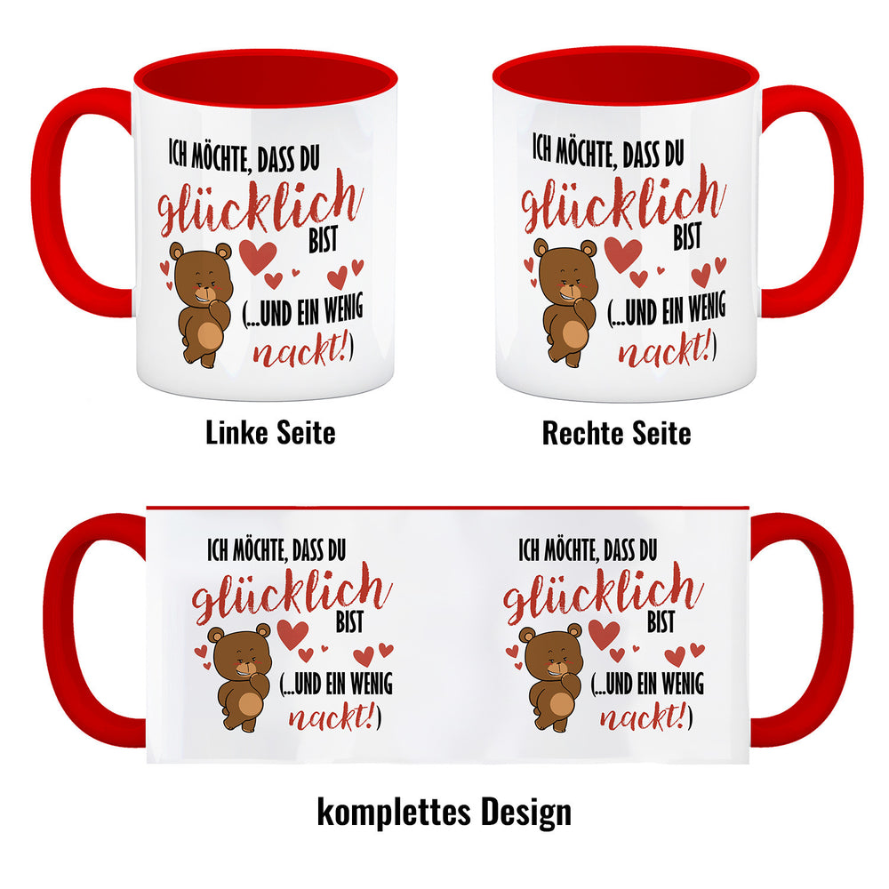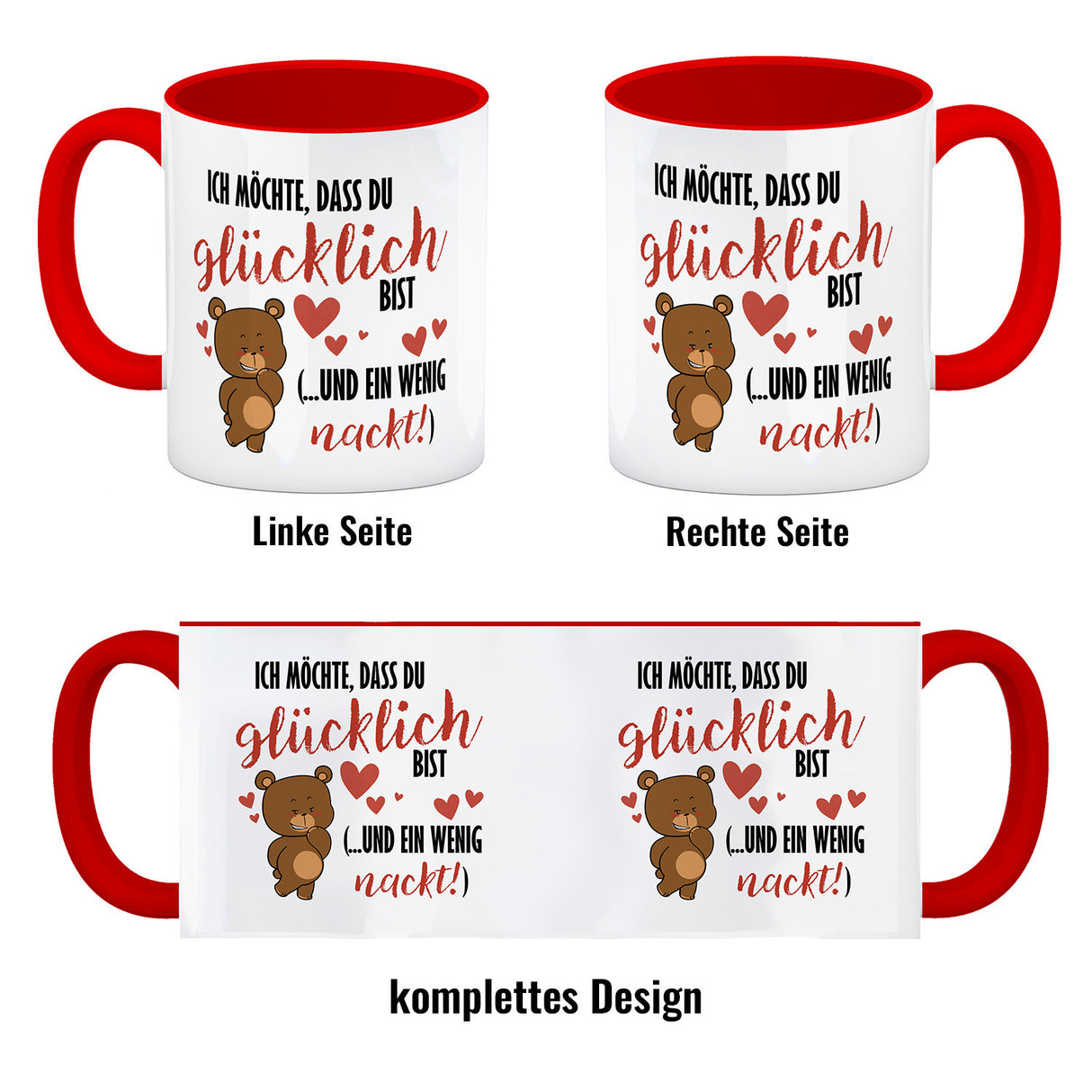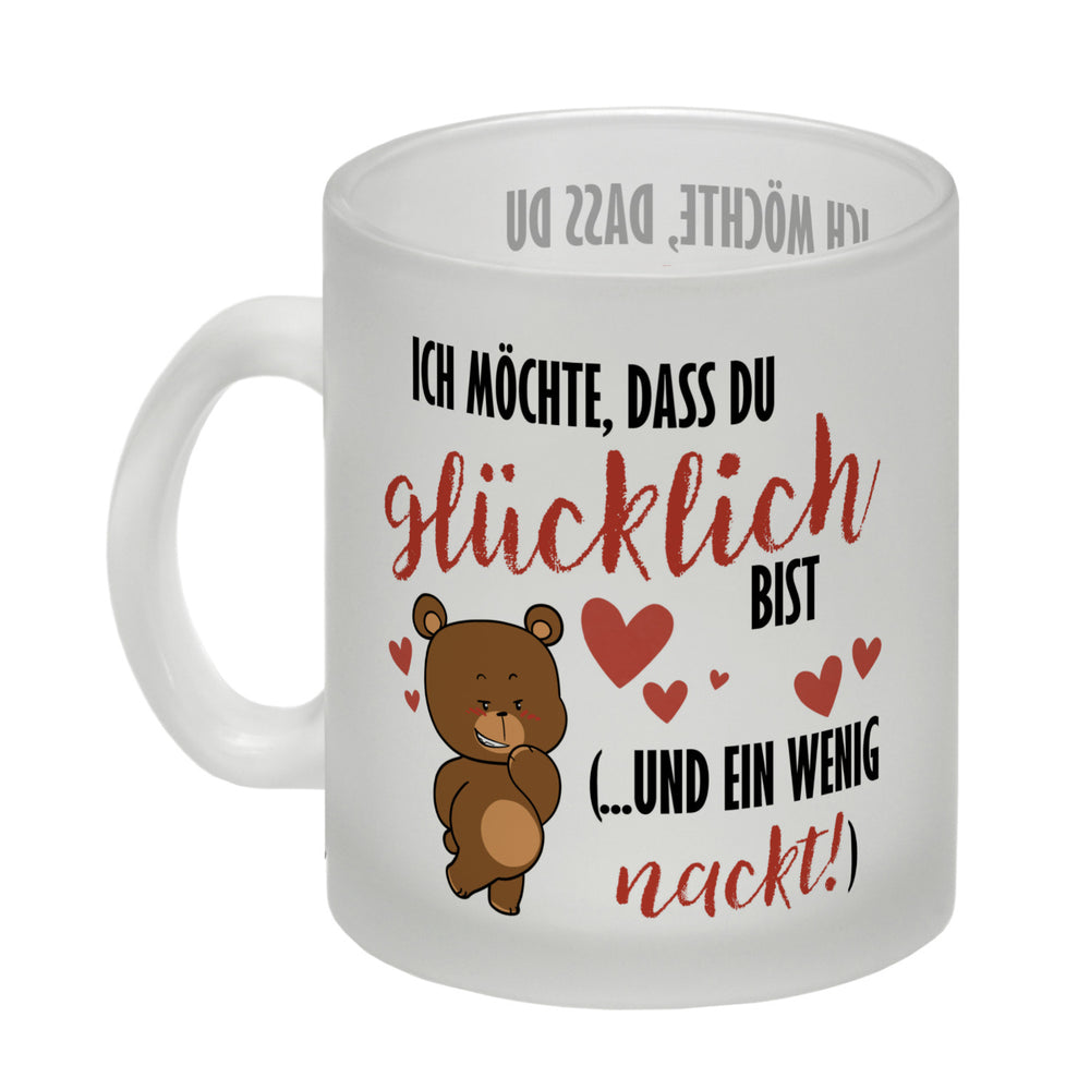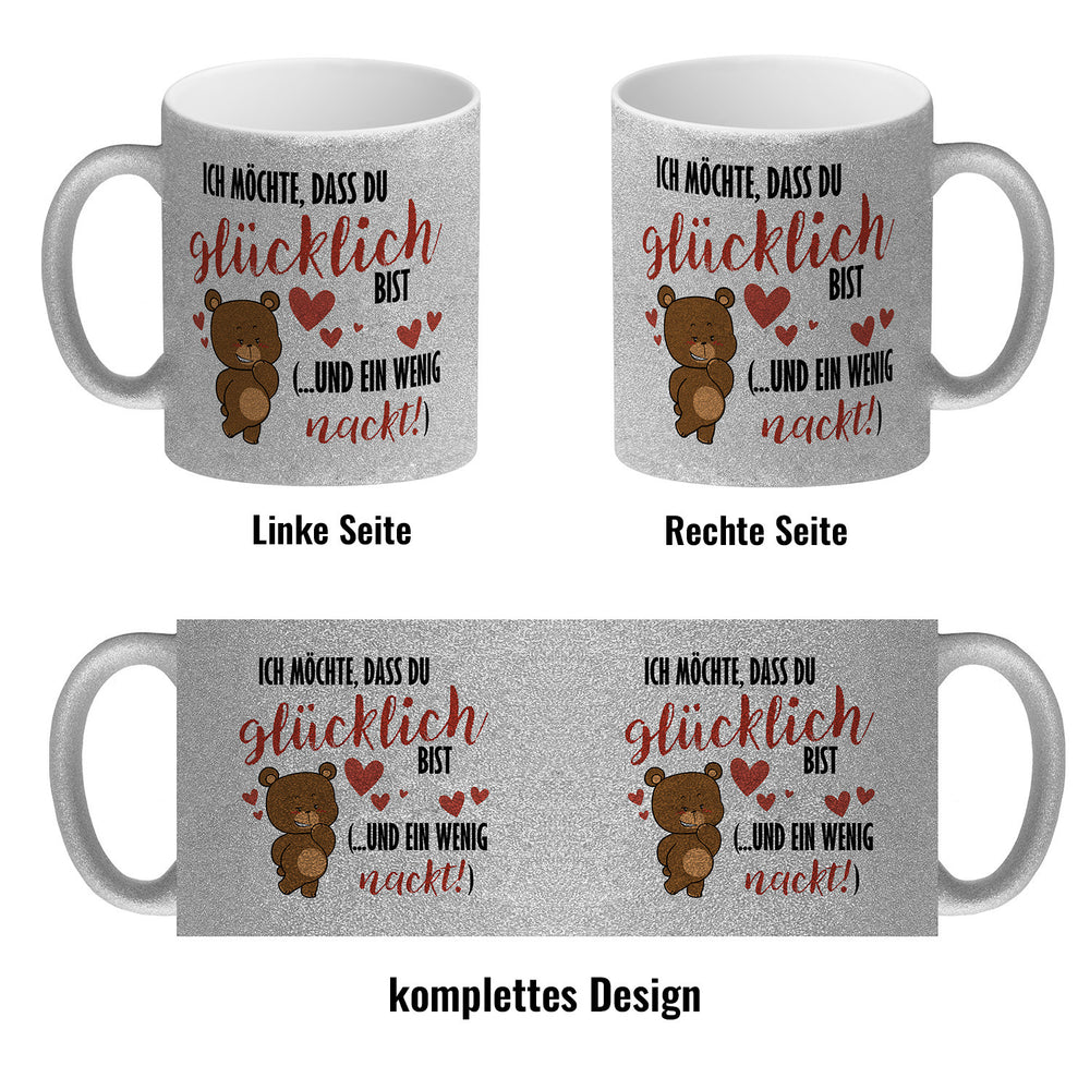 • 1x Knuddelbär Kaffeebecher mit Spruch Sei glücklich und etwas nackt in der gewählten Ausführung