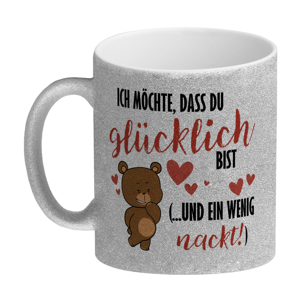 Frische deine Morgenroutine auf und bringe ein Kichern in die Kaffeepause mit dem urkomischen Knuddelbär Kaffeebecher – Dein Becher für den perfekten Start in den Tag! Wer möchte nicht von einem frechen, flauschigen Gefährten begrüßt werden, der dazu auffordert, glücklich zu sein (...und etwas nackt!) Dieser entzückende Becher ist nicht nur ein Muntermacher für die Augen, sondern auch ein kleiner, schelmischer Stups für die Seele. Mit verschiedenen Ausführungen ist für jeden Geschmack etwas dabei: Klassisch weiß zum Schmunzeln beim ersten Kaffee, farbig akzentuiert für eine lebendige Teestunde, in edler Glasoptik für den stilbewussten Genießer oder als Glitzerhighlight, um den Tag glamourös zu beginnen. Jeder Becher ist mit Liebe und Pfiff in Deutschland hergestellt, bereit, dein Zuhause oder das Büro zu erobern.Ob als liebevolle Aufmunterung für den Partner am frühen Morgen, als origineller Büro-Begleiter, der dich durch den Arbeitstag lacht, oder als der Hingucker bei jedem Kaffeeklatsch – mit dem Knuddelbär Kaffeebecher verschenkst du nicht nur einen Becher, sondern ein Stück Fröhlichkeit. Ideal als Geschenk für alle, die eine Extraportion Glück (und vielleicht einen Hauch Nacktheit) in ihrem Alltag benötigen. Sprich es aus mit Bär: Ich will, dass du glücklich bist (...und ein bisschen nackt!).