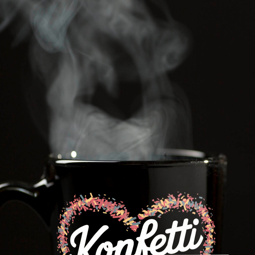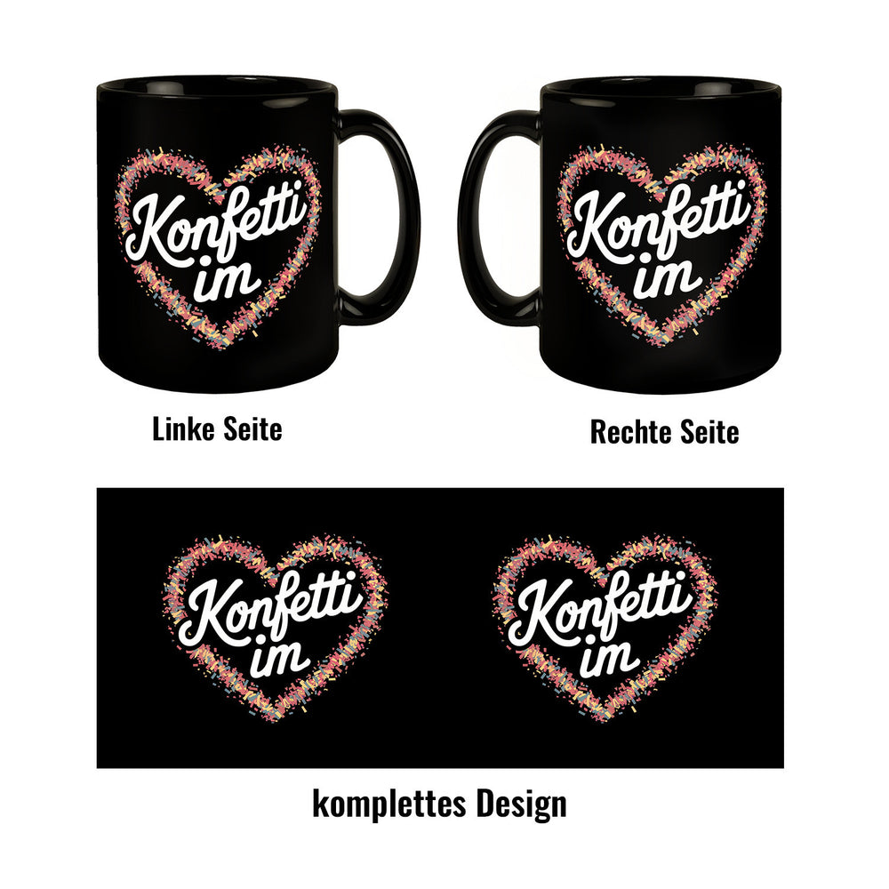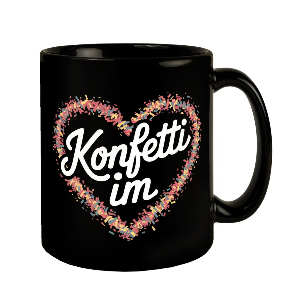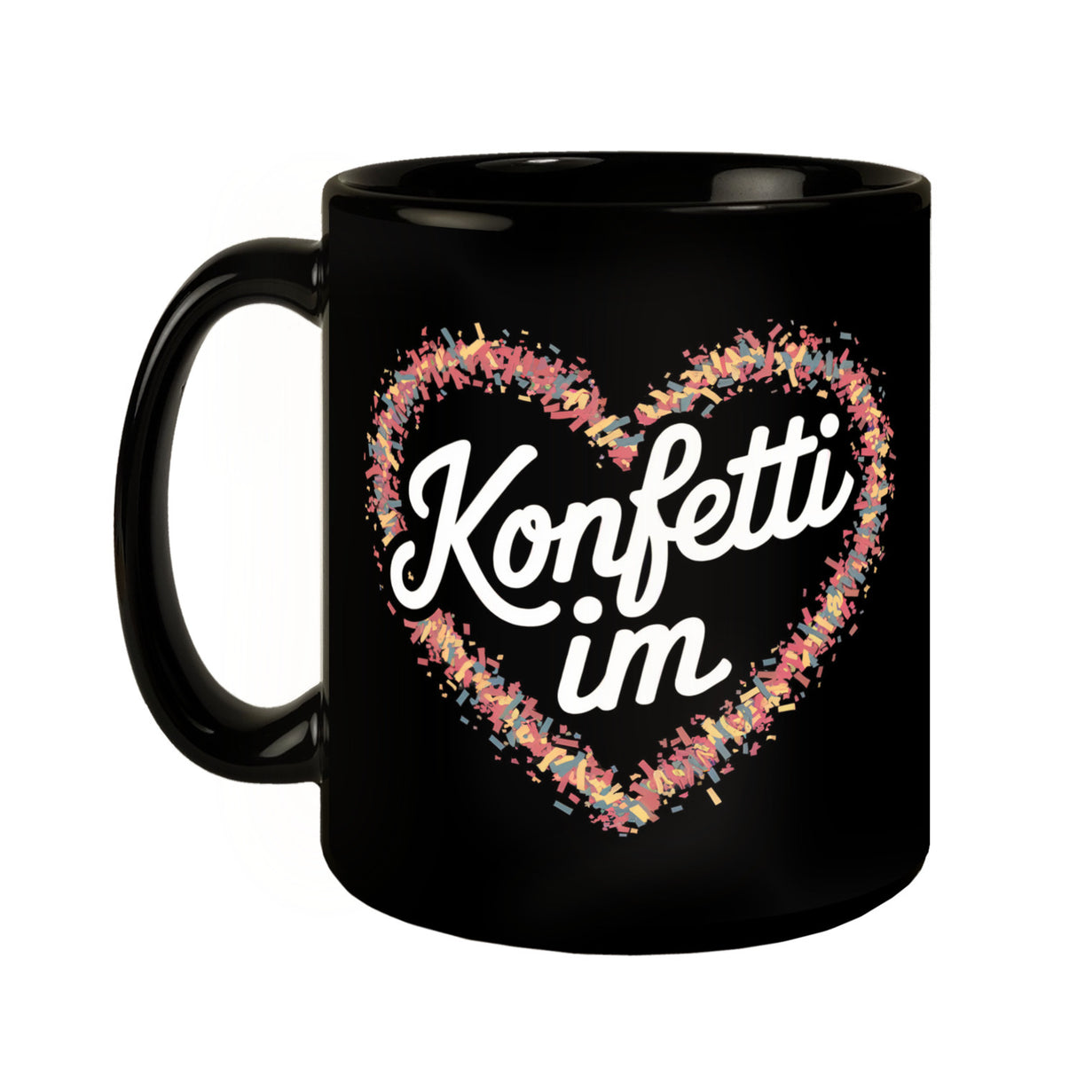 Die schwarze Kaffeetasse erstrahlt mit einem lebendigen Herzkonfetti-Design, das mit buntem Konfetti in Pink, Gelb, Blau und Rot verziert ist. In weißen Kursivbuchstaben steht der fröhliche Spruch "Konfetti im Herz", der das verspielte Motiv perfe Hinweise: Fassungsvermögen: ca. 300ml