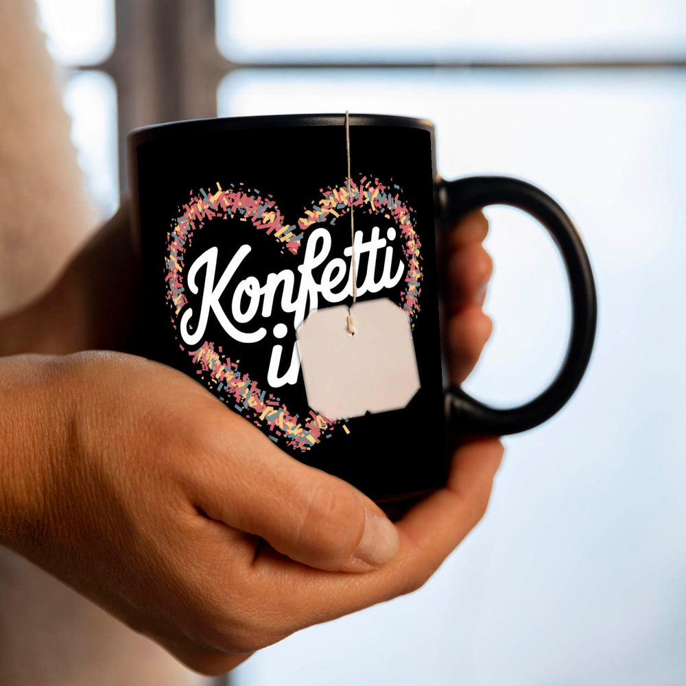 - Die schwarze Kaffeetasse erstrahlt mit einem lebendigen Herzkonfetti-Design, das mit buntem Konfetti in Pink, Gelb, Blau und Rot verziert ist. In weißen Kursivbuchstaben steht der fröhliche Spruch "Konfetti im Herz", der das verspielte Motiv perfekt abrundet. Ein echter Hingucker für deinen Küchentisch!