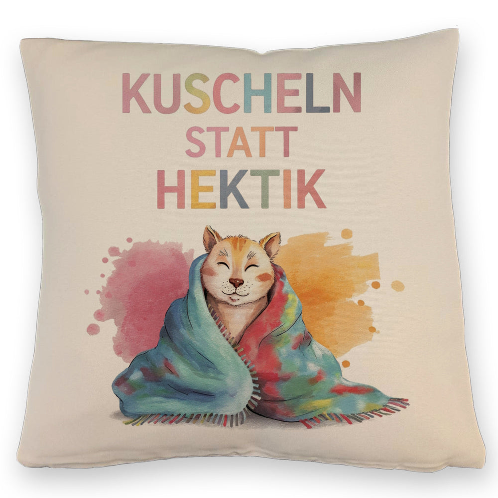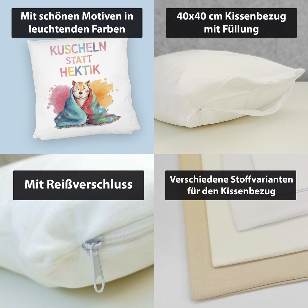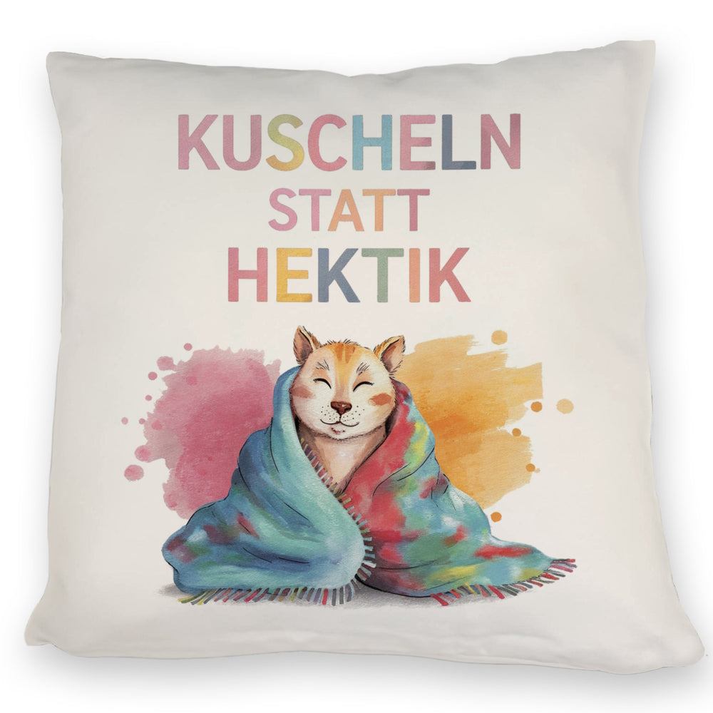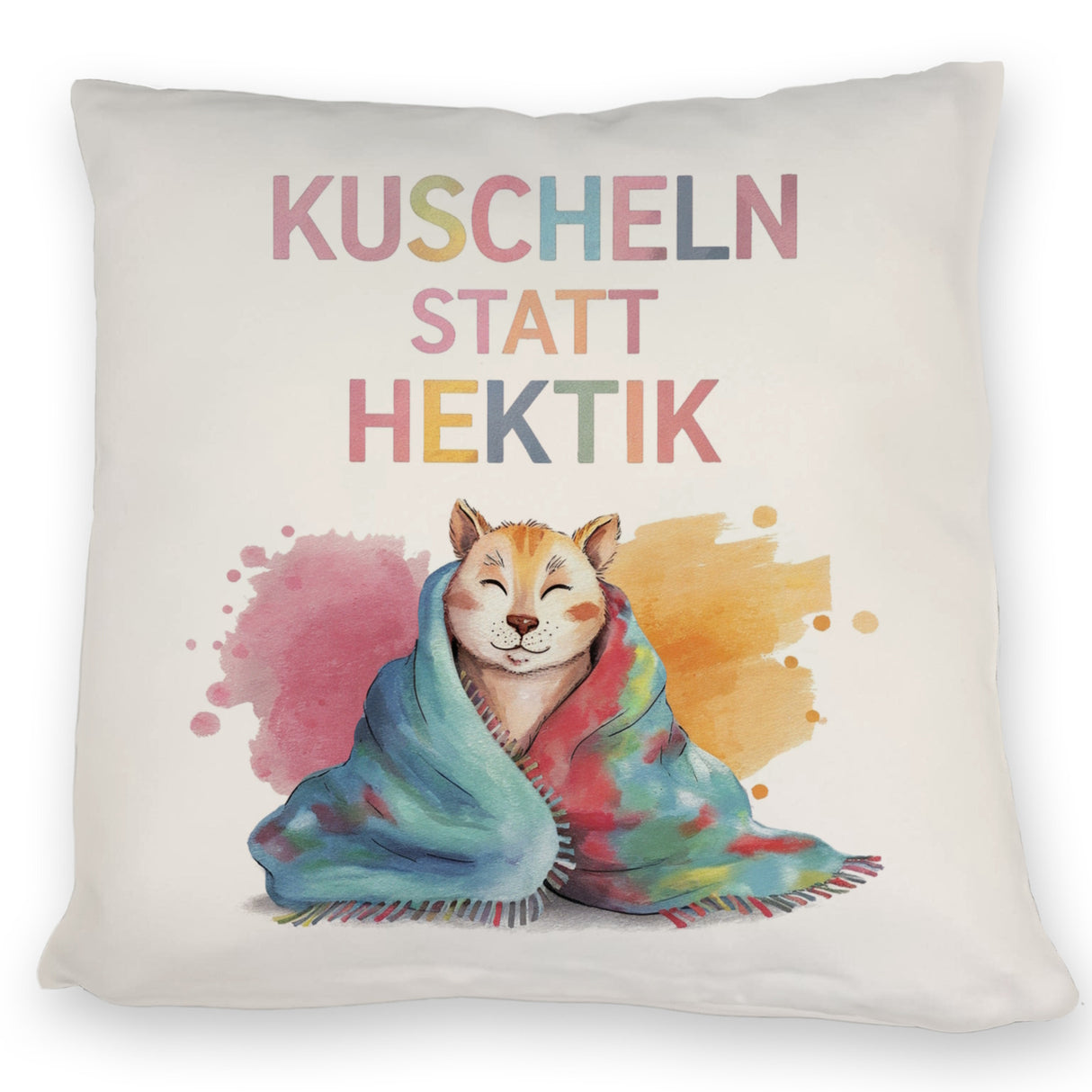 - Das Kissen „Kuscheln statt Hektik“ zeigt einen niedlichen Puma, der sich in eine bunte Decke kuschelt. Auf weißem Hintergrund bringt der Spruch in großen, bunten Buchstaben Gelassenheit in Ihr Zuhause. Aquarellspritzer in Rosa, Orange und Blau unterstreichen die behagliche Atmosphäre!