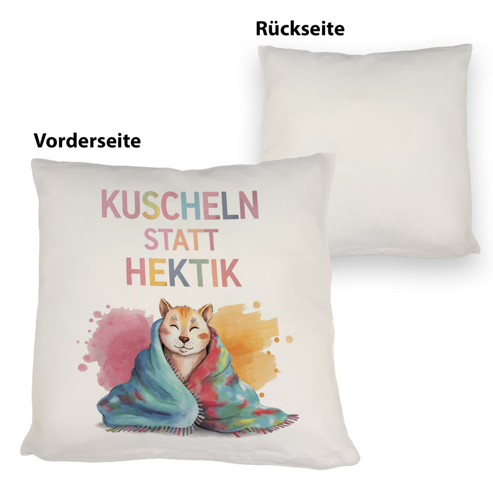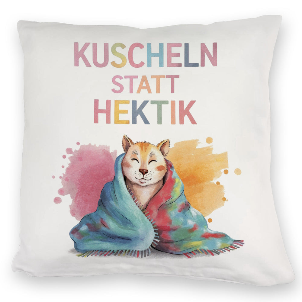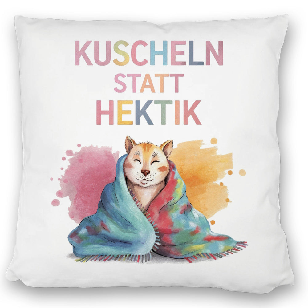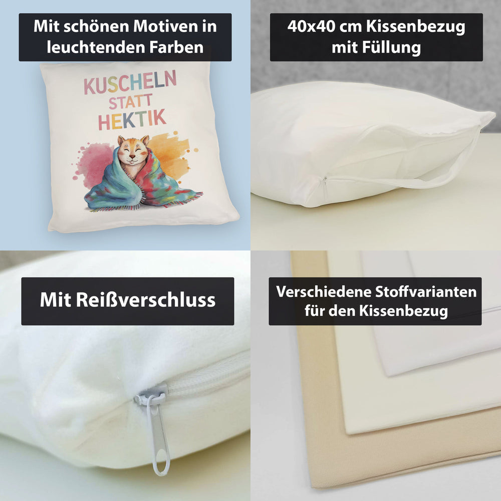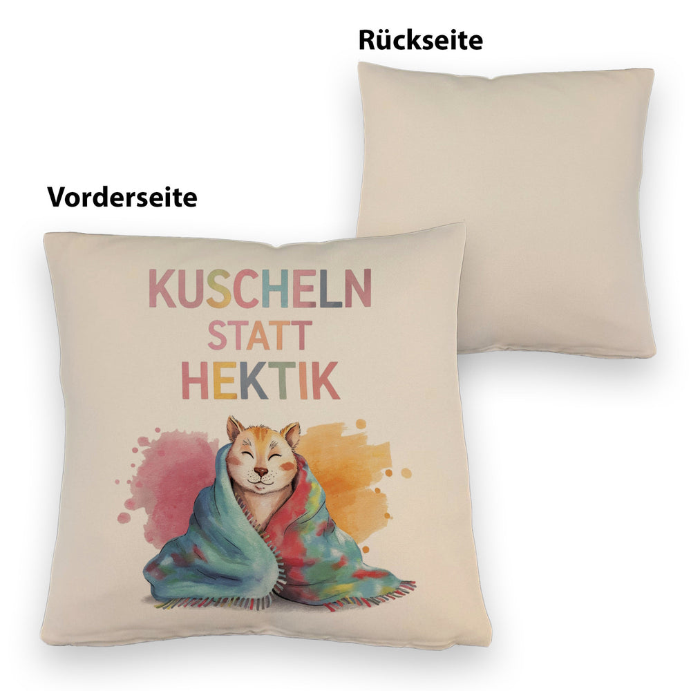 - Das Kissen „Kuscheln statt Hektik“ zeigt einen niedlichen Puma, der sich in eine bunte Decke kuschelt. Auf weißem Hintergrund bringt der Spruch in großen, bunten Buchstaben Gelassenheit in Ihr Zuhause. Aquarellspritzer in Rosa, Orange und Blau unterstreichen die behagliche Atmosphäre!