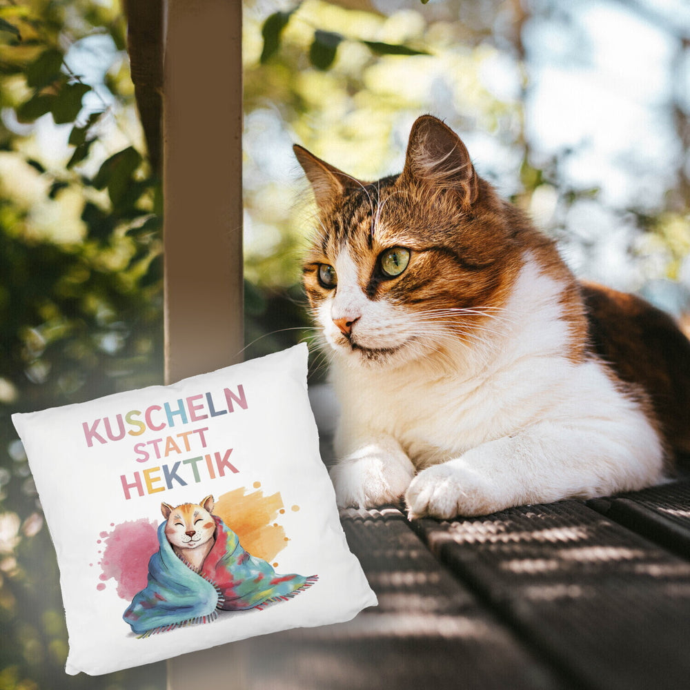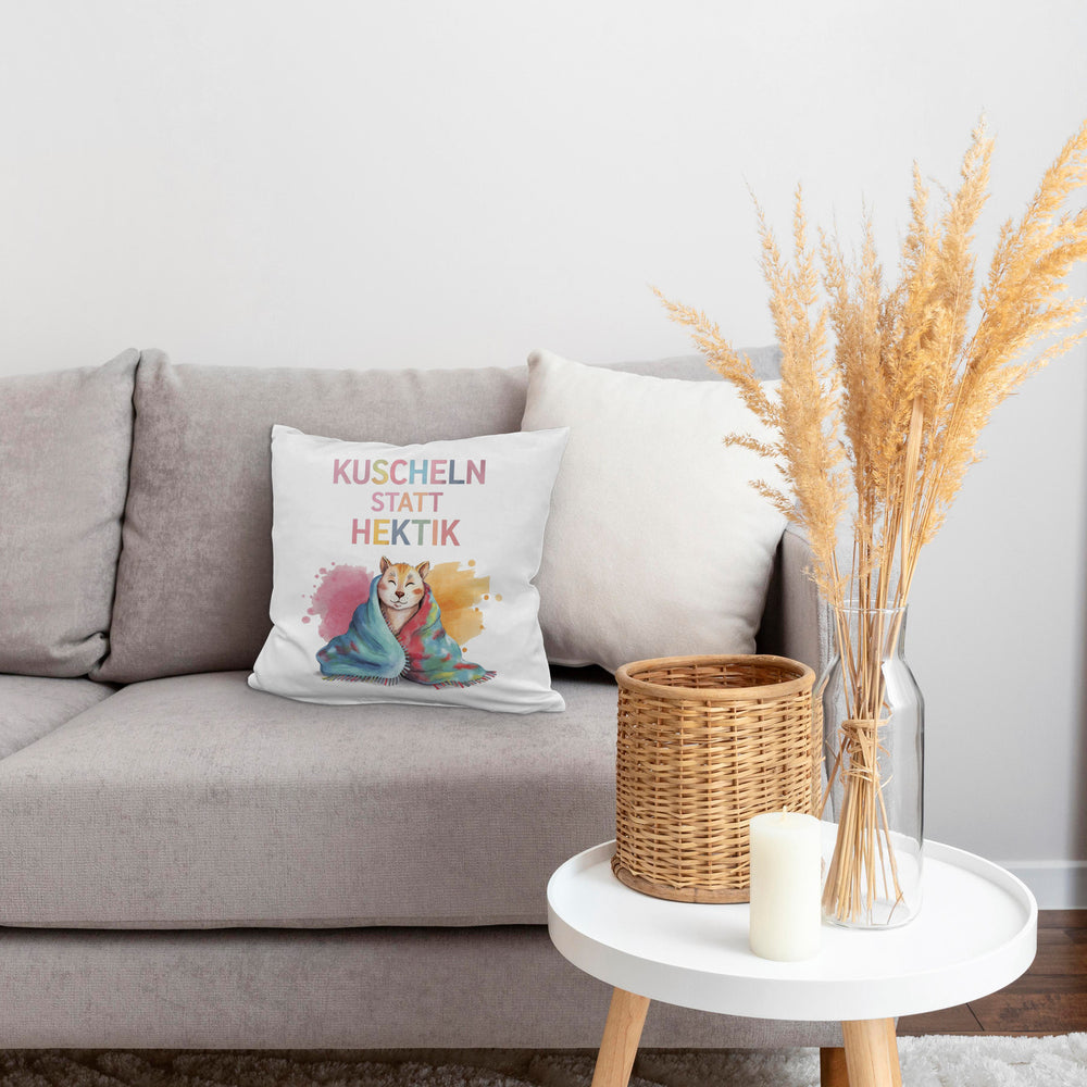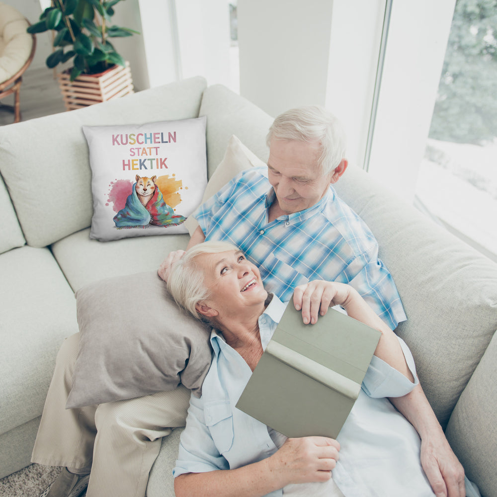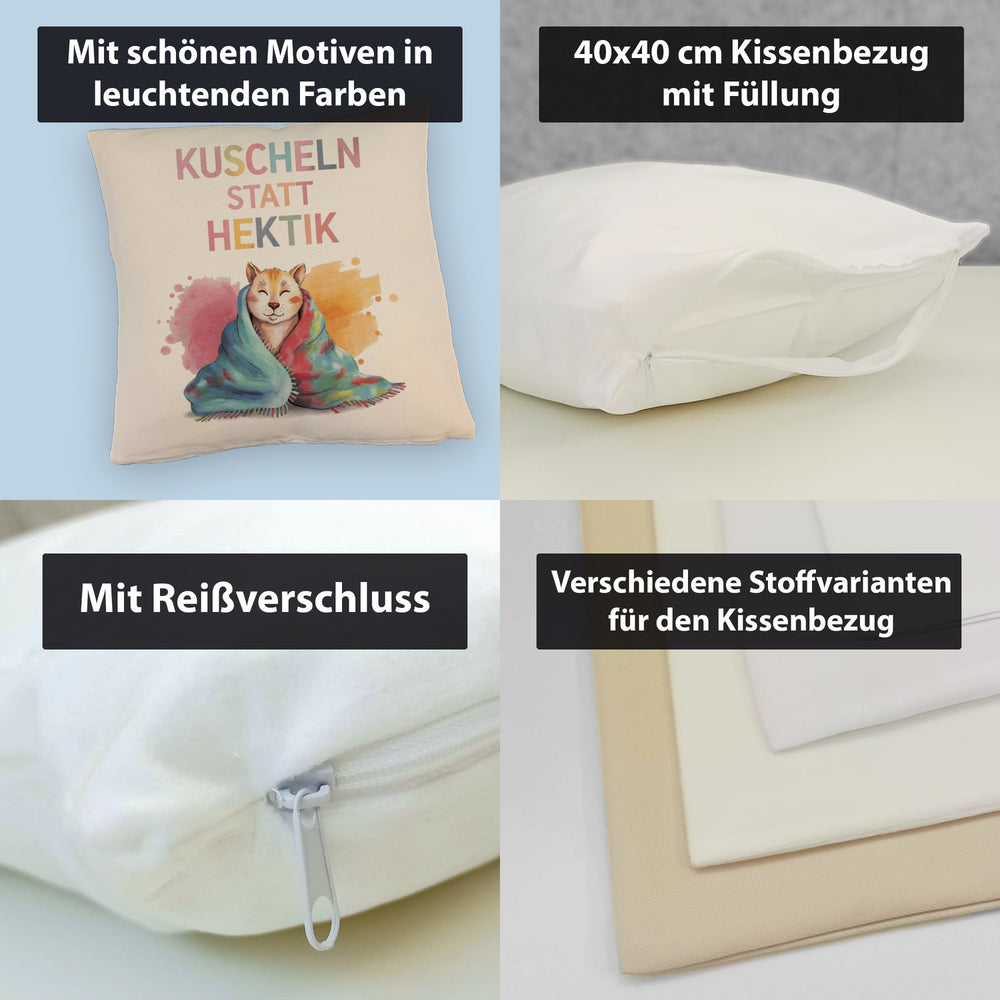 - Das Kissen „Kuscheln statt Hektik“ zeigt einen niedlichen Puma, der sich in eine bunte Decke kuschelt. Auf weißem Hintergrund bringt der Spruch in großen, bunten Buchstaben Gelassenheit in Ihr Zuhause. Aquarellspritzer in Rosa, Orange und Blau unterstreichen die behagliche Atmosphäre!