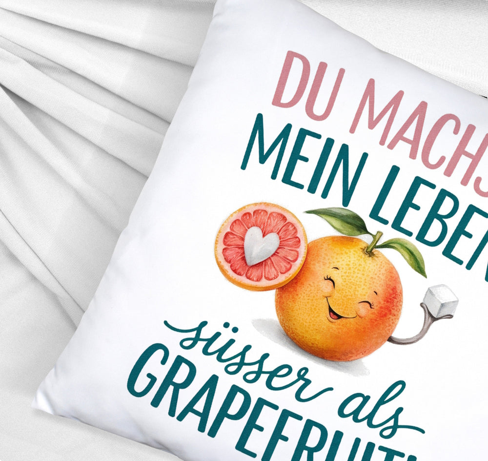 - Dieses Kissen begeistert mit seinem fröhlichen Grapefruit-Charakter, der ein herzförmiges Zuckerwürfelchen hält. Ein Pastell-Aquarell in rosa Großbuchstaben betont die Aussage: "Du machst mein Leben süßer als Grapefruit." Unser quirliges Früchtchen posiert frech mit einem grünen Blatt auf dem Kopf und bringt Freude in jedes Zuhause.