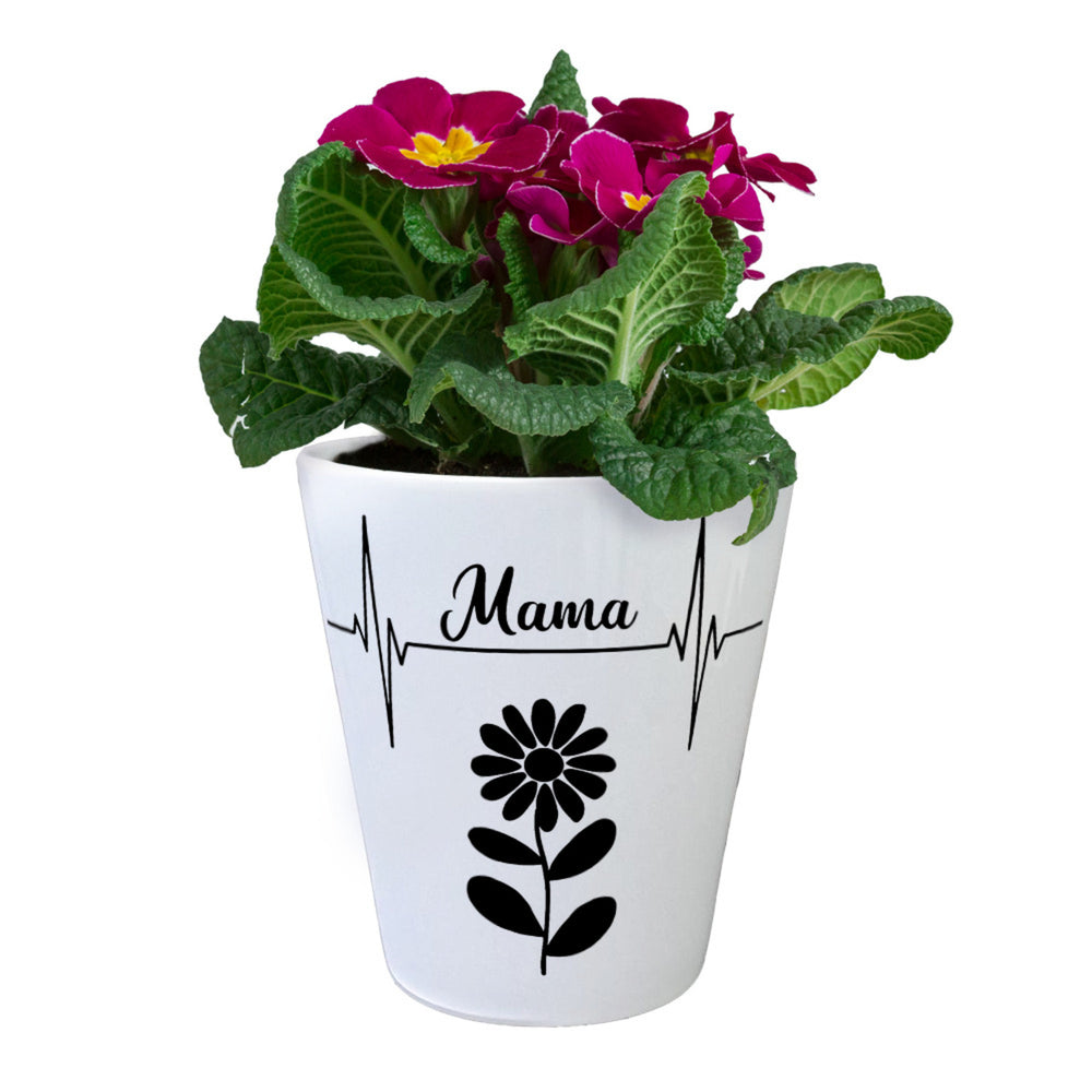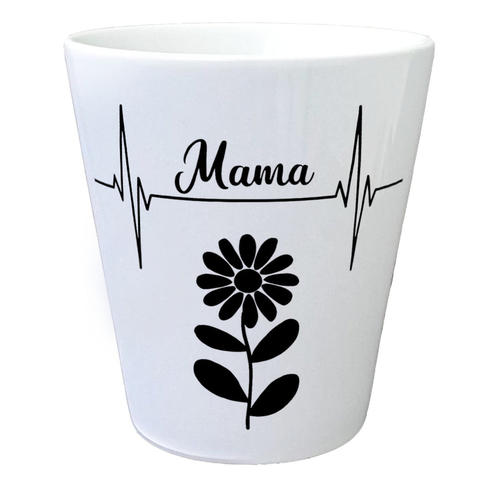 Dieser Blumentopf ist das perfekte Zusammenspiel aus Kunst und Liebe. Das minimalistische Design mit einer herzschlagähnlichen Wellenform und dem eleganten Schriftzug 'Mama' wird durch eine stilisierte Blume komplettiert. Der neutrale Hintergrund betont d Hinweise: Material: Keramik / Höhe: ca. 10 cm, Durchmesser oben: ca. 9cm / Mit Bodenloch zur Vermeidung von Staunässe.